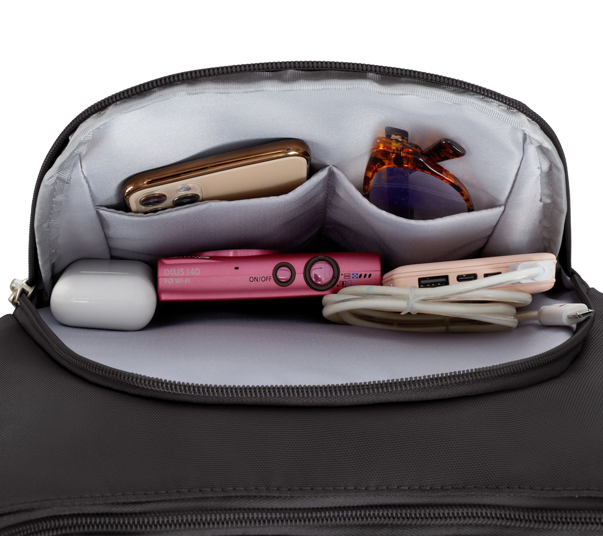 • Locking main compartment with organizer featuring card slots, passport drop pocket, large zippered pocket
