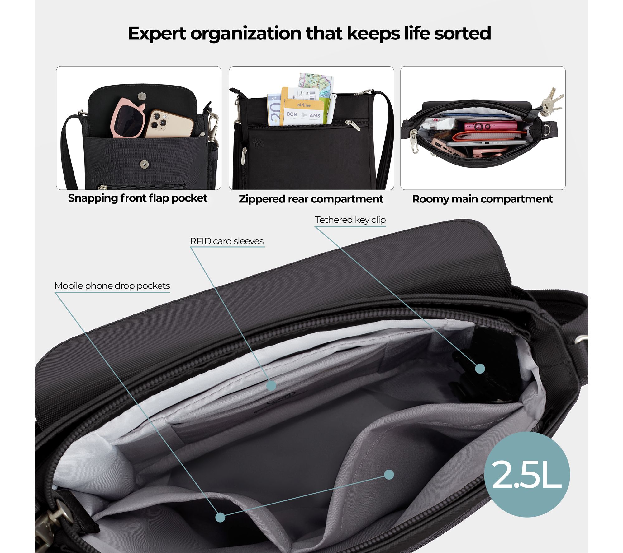 Head out for errands or travel confidently with this crossbody bag, designed to keep your essentials secure and organized. Multiple compartments and a sleek silhouette make it a reliable companion whether you're dashing through airports or exploring city streets. From Travelon.