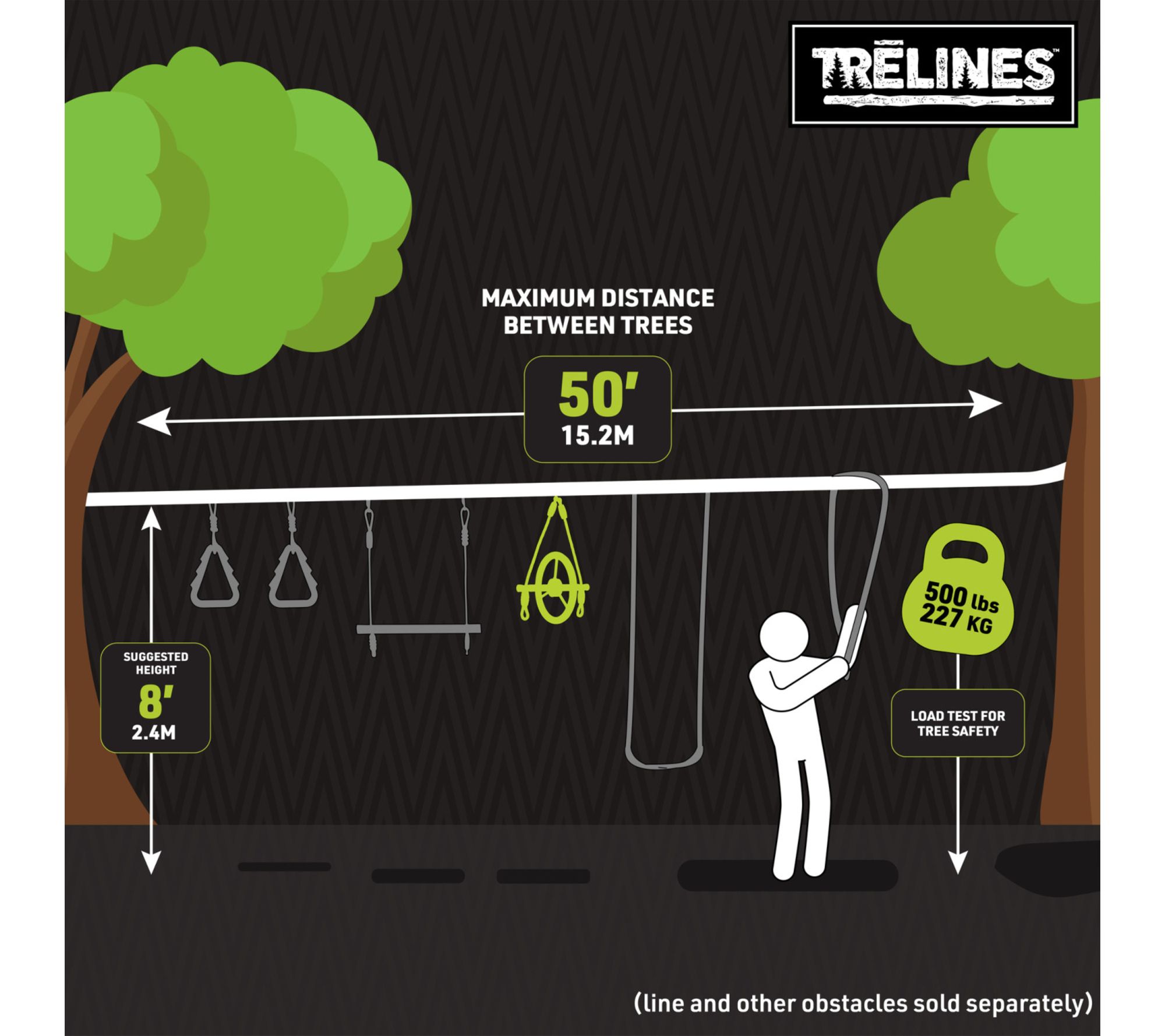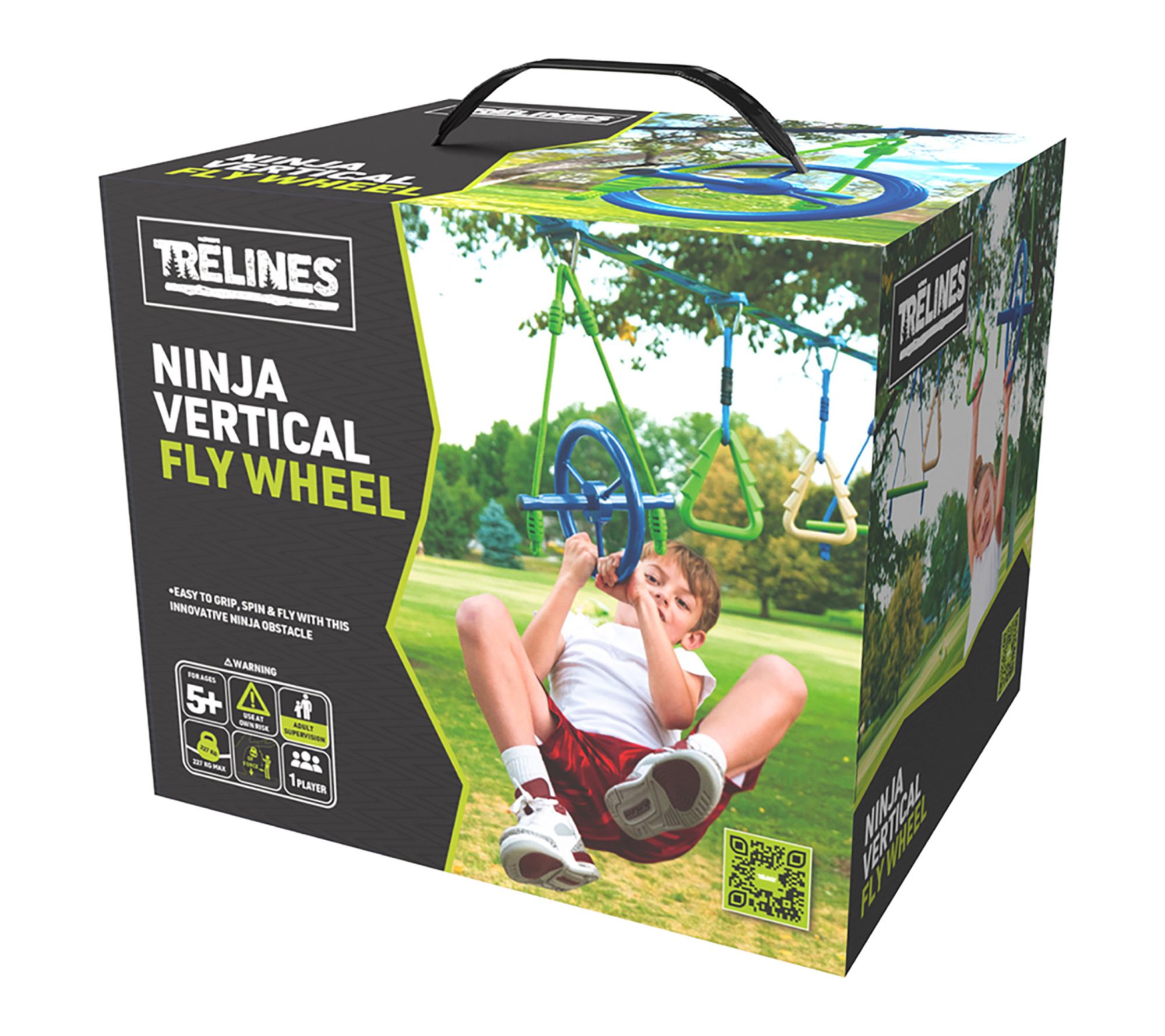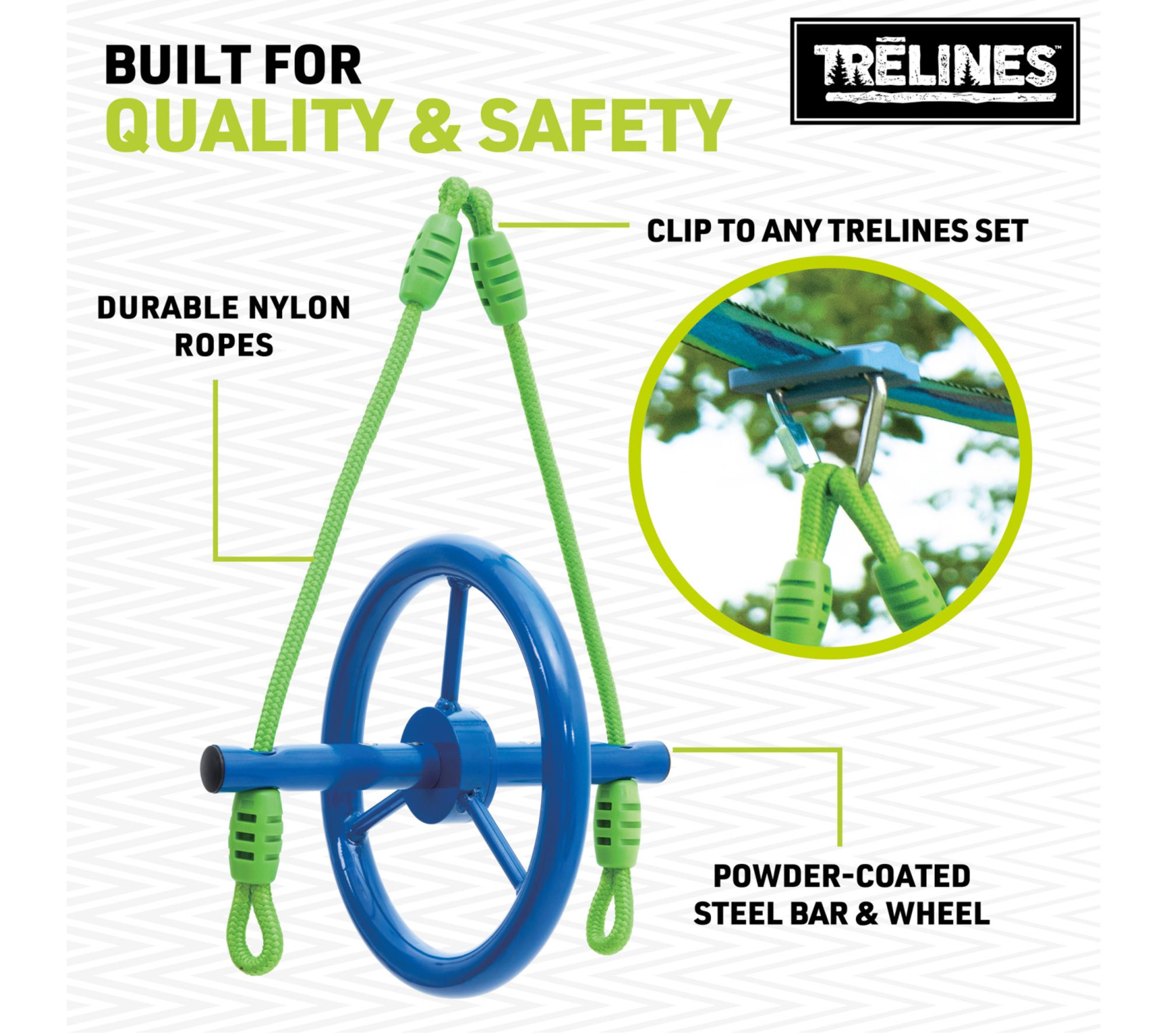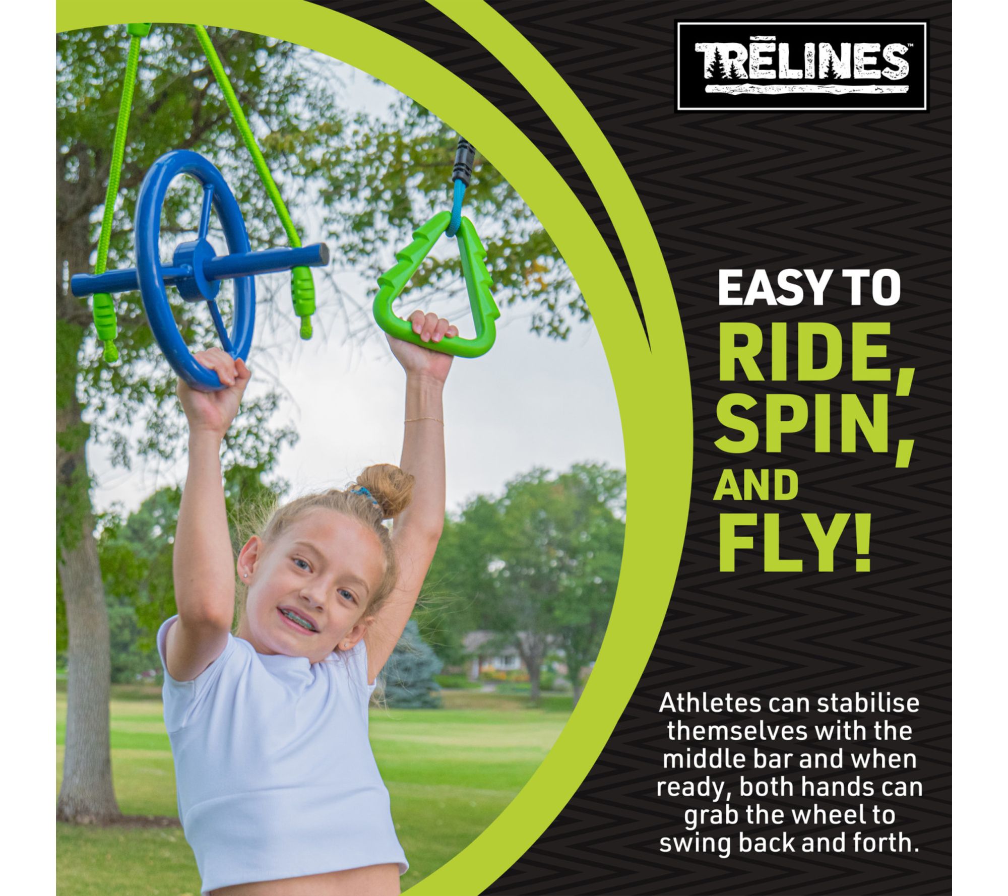Bring the excitement of a ninja obstacle course to your backyard with this action-packed ride-on fly wheel. Kids can test their strength and agility as they grip, spin, and swing across the wheel -- perfect for friendly competitions or solo play. Designed to add a thrilling challenge to any Trelines kit, this activity toy keeps young adventurers moving and engaged. From Trelines.