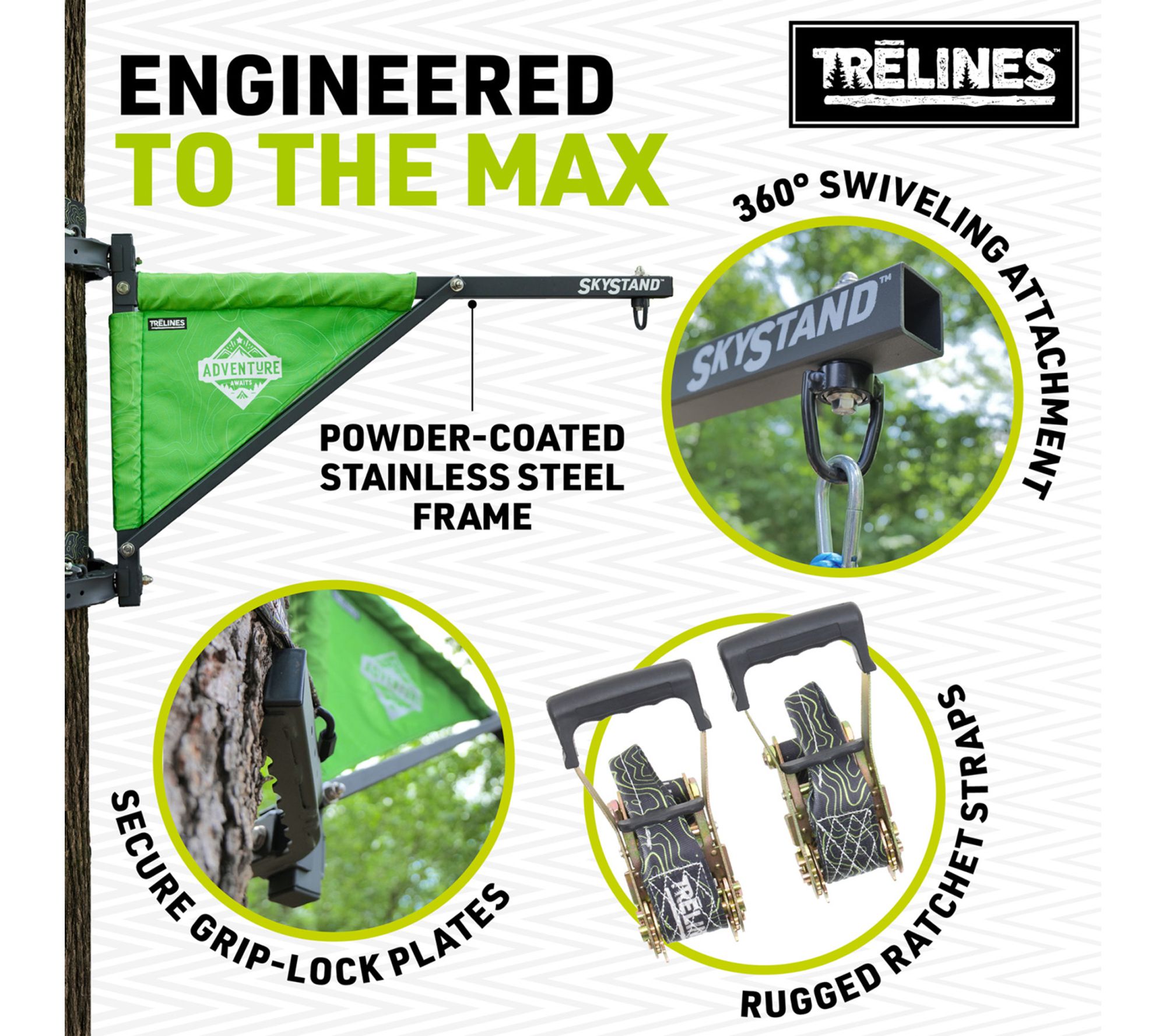 • Includes tree mount frame, two ratchet straps, secure grip-lock plates, and 360 swivel attachment