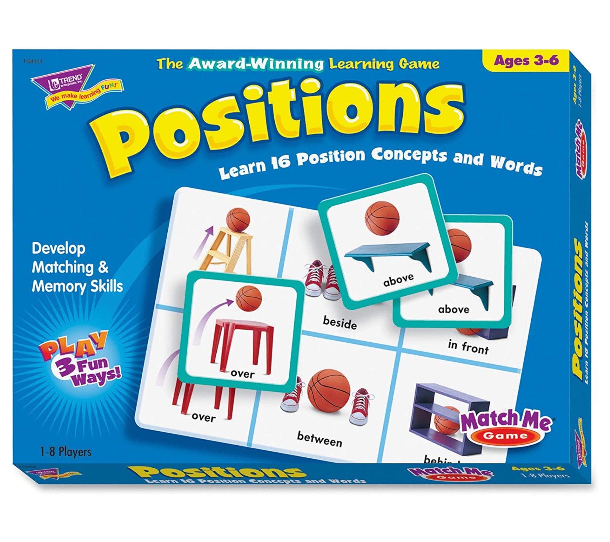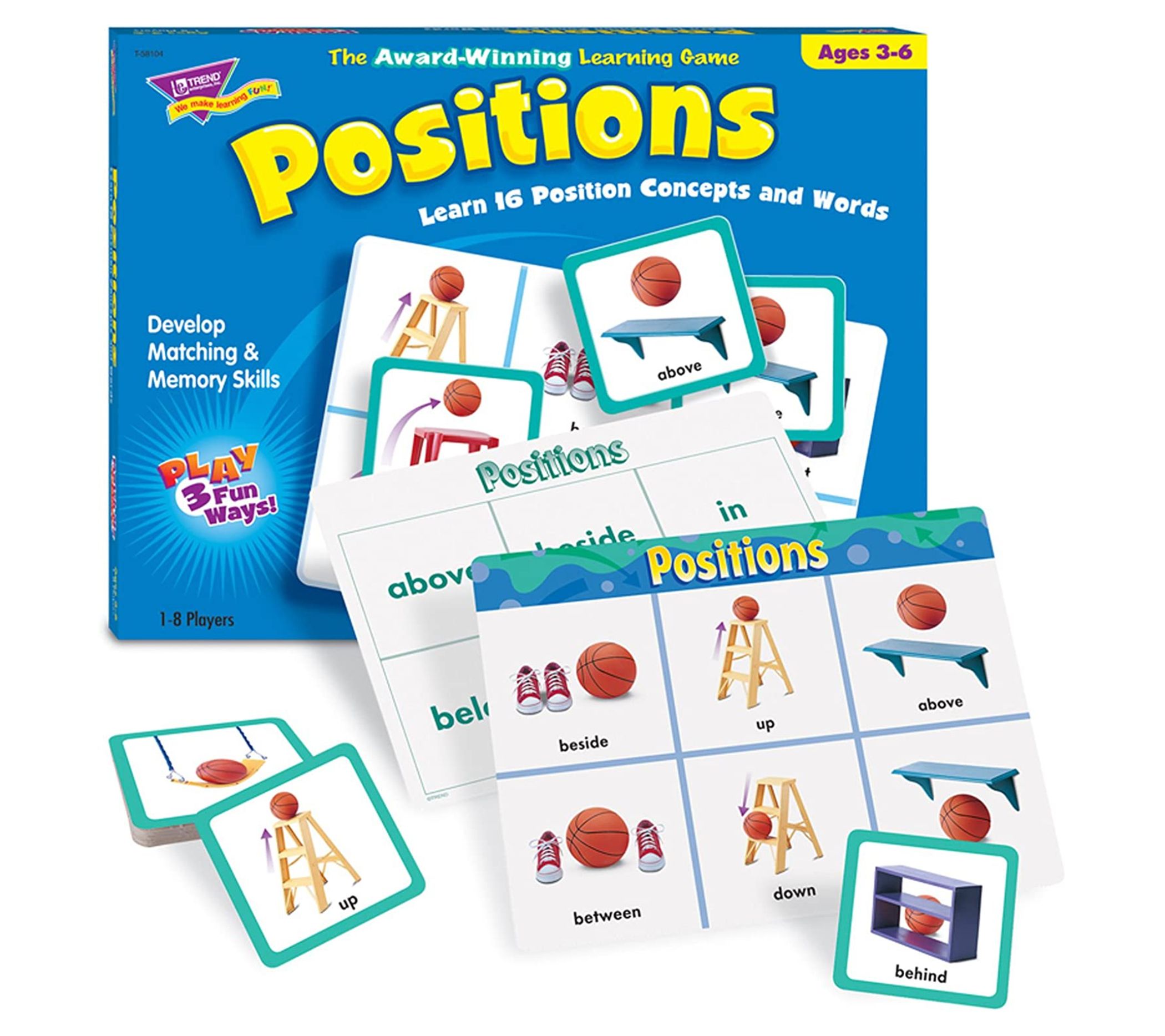 Young students have a blast as they work to build matching skills and learn positions with this fun game, featuring eight two-sided boards and a stack of sturdy, colorful cards. From TREND Enterprises.