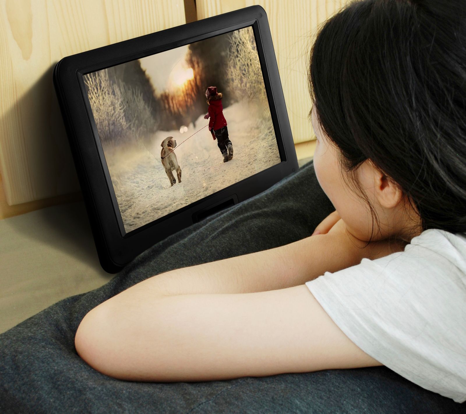 Ready and waiting to play your favorite films when you're traveling, this portable DVD player keeps your family entertained during long drives or flights. From Trexonic.