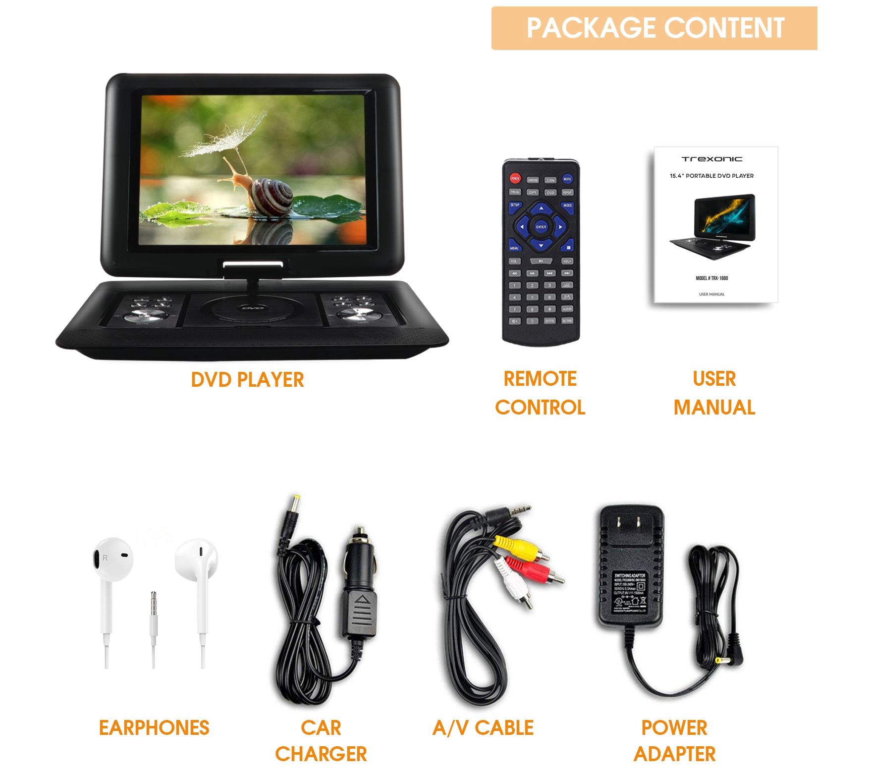• Includes TRX-1680 portable DVD player with remote control, power adapter, headphones, car charger, A/V cables, and manual
