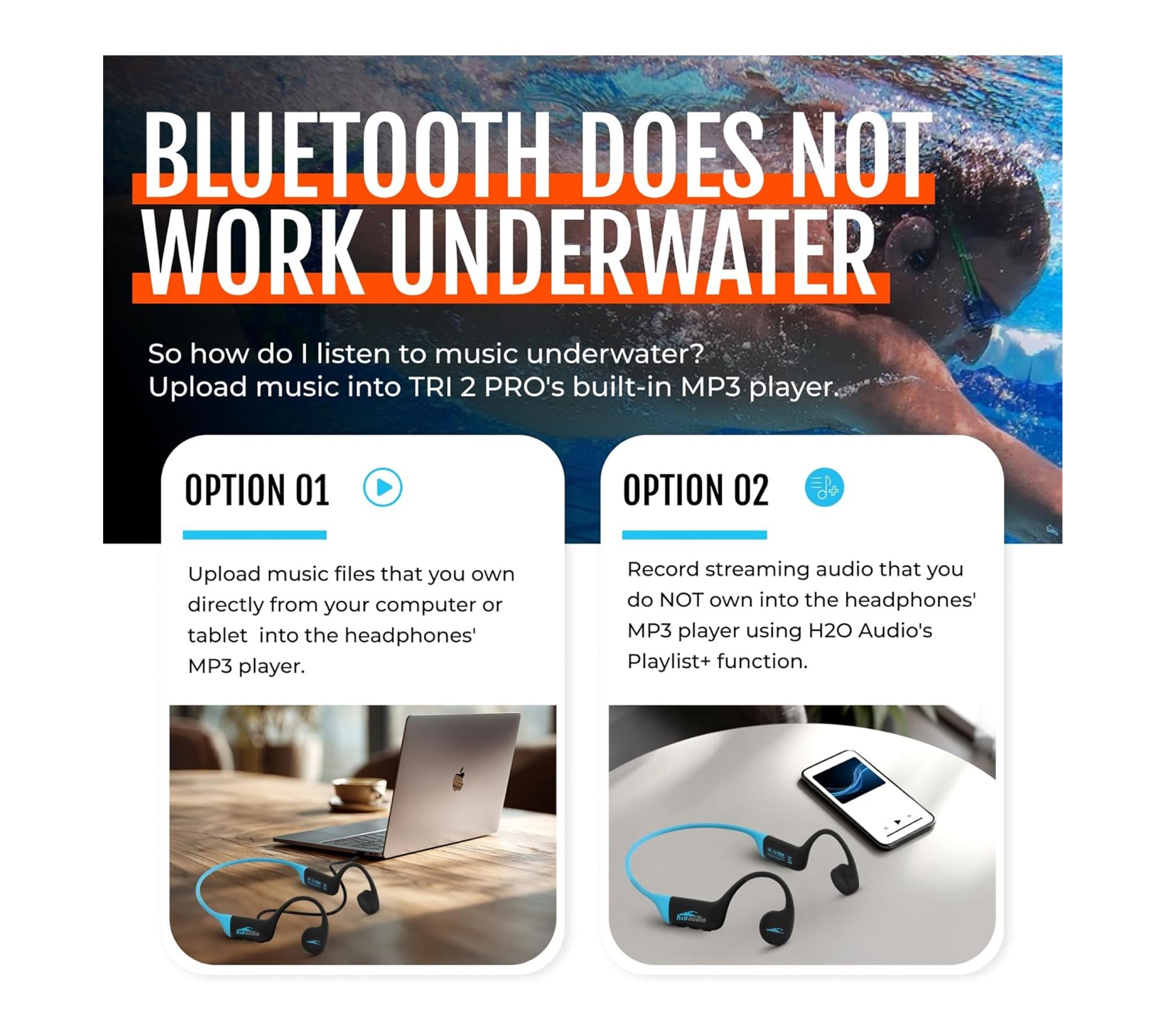 • Built-in MP3 player with 8GB memory for underwater or offline listening