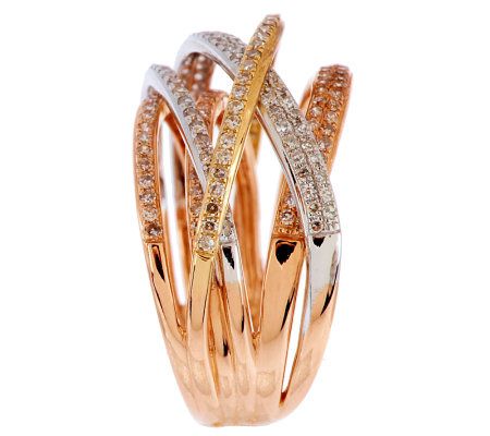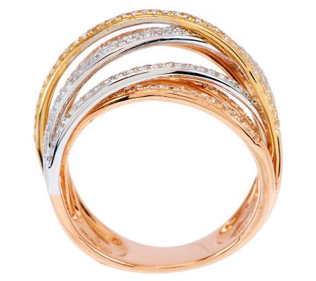 When one shade isn't enough, add this highway ring to your ensemble. Interlocking strands of 14K yellow gold, 14K rose gold, and 14K white gold--each paved with a row of white, round diamonds--add a dash of color to your look. From Affinity(R) Diamond Jewelry.