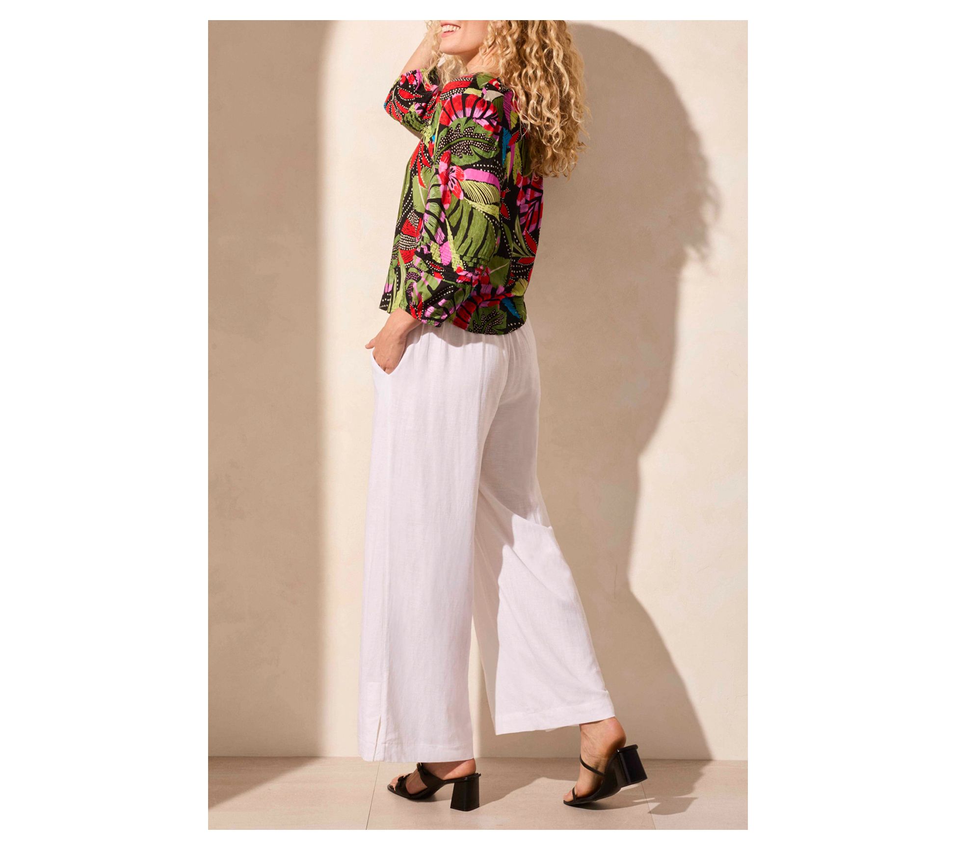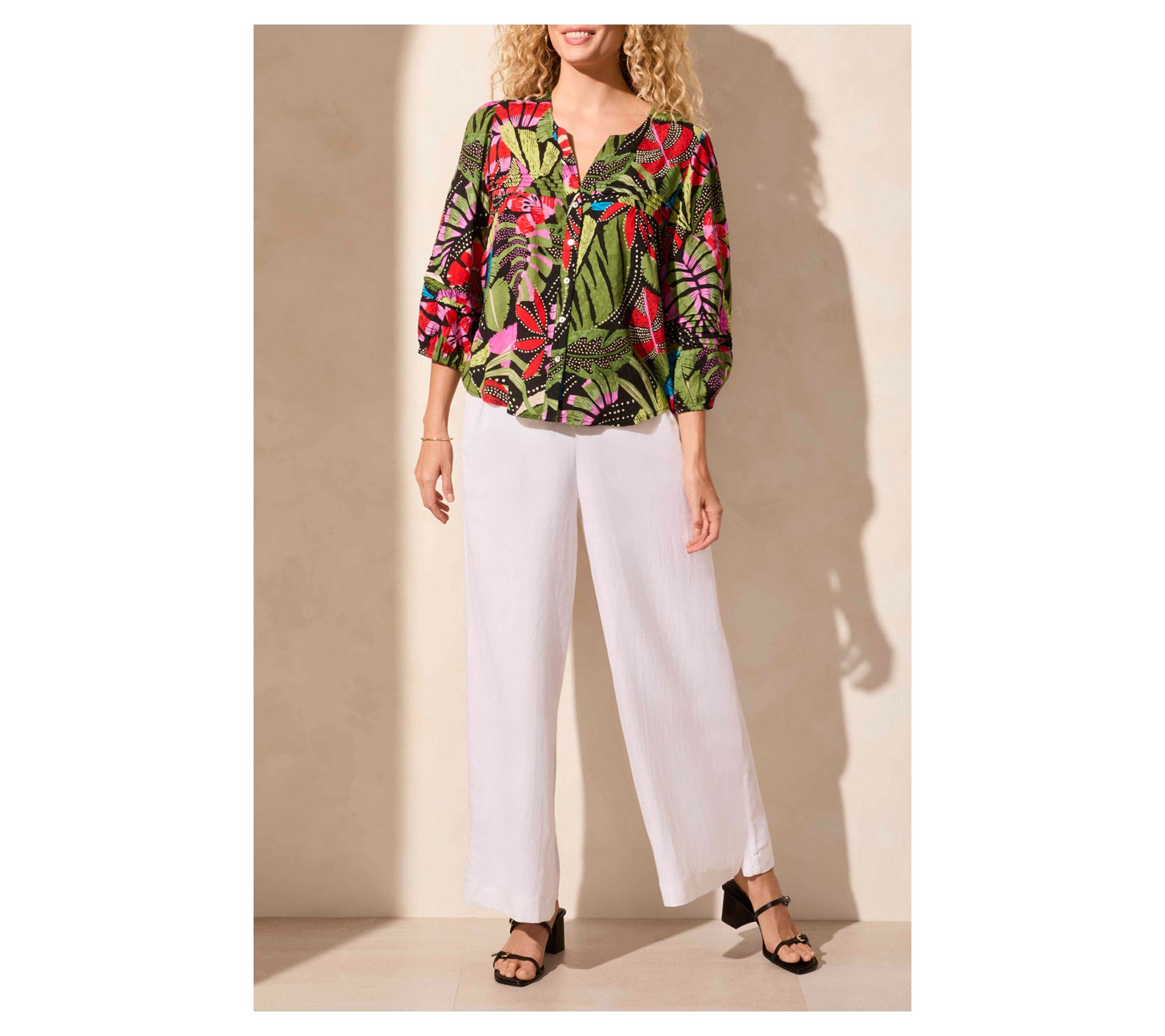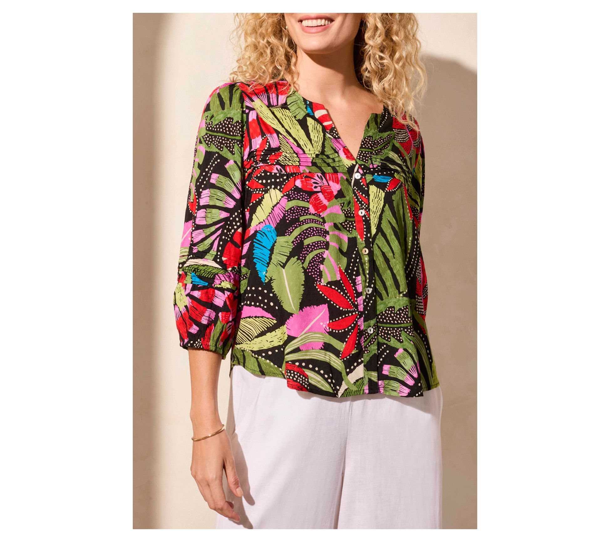 Add lively style to your ensemble with this button-up blouse, showcasing a bright, bold print on lightweight textured challis fabric. Pleating at the yoke and sleeves creates flattering structure, while elastic details make adjusting the 3/4-length sleeves a breeze. From Tribal.