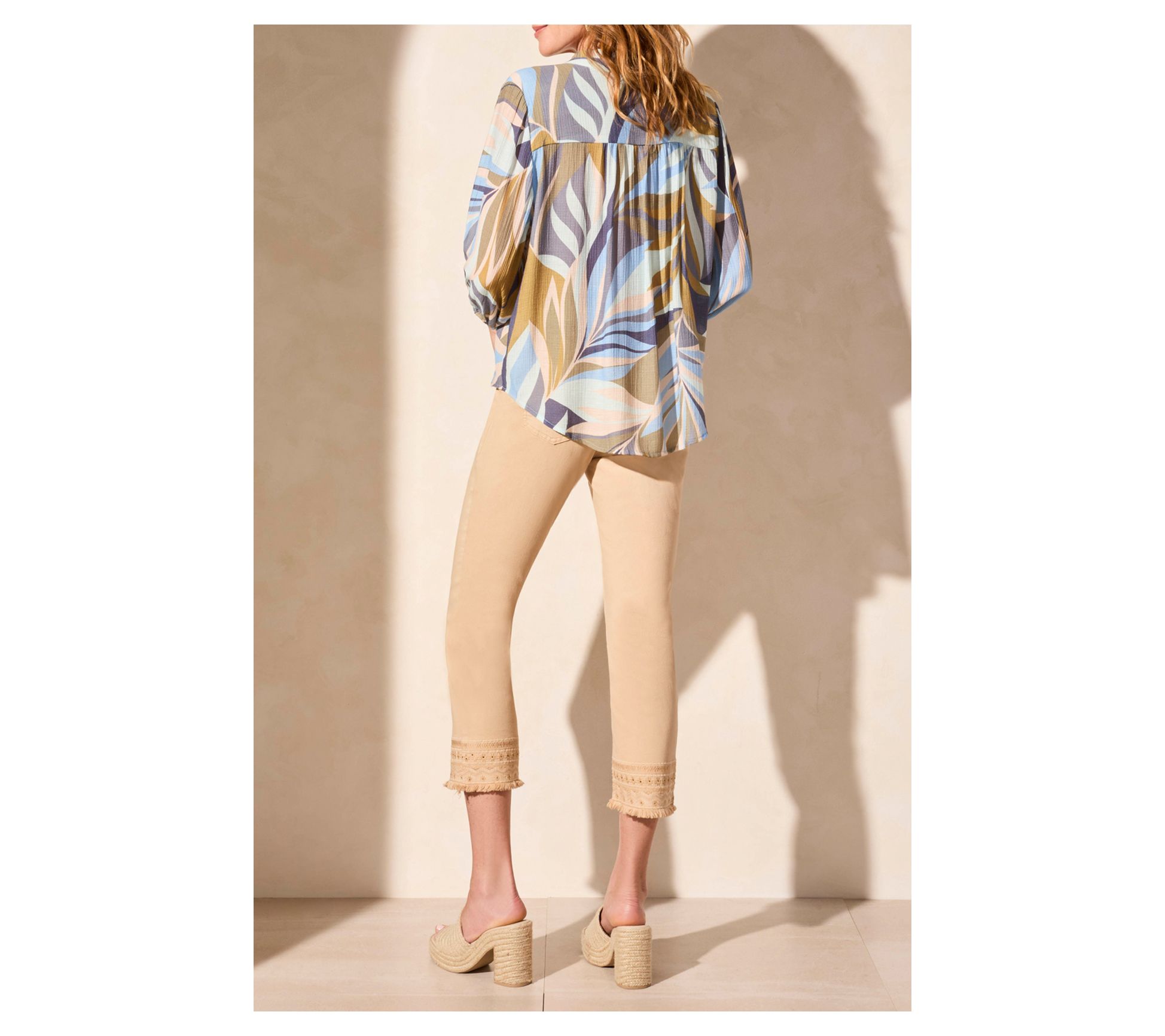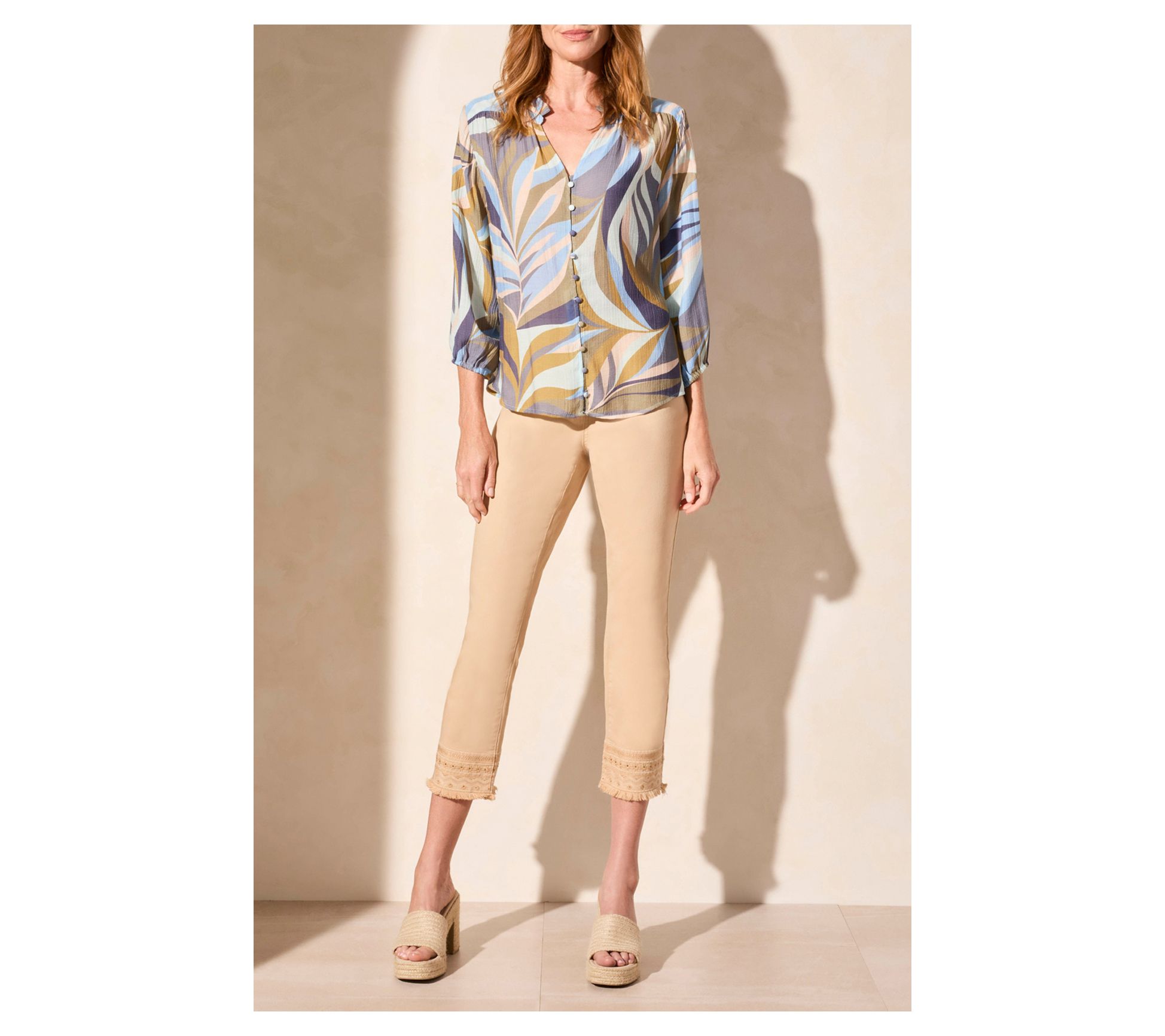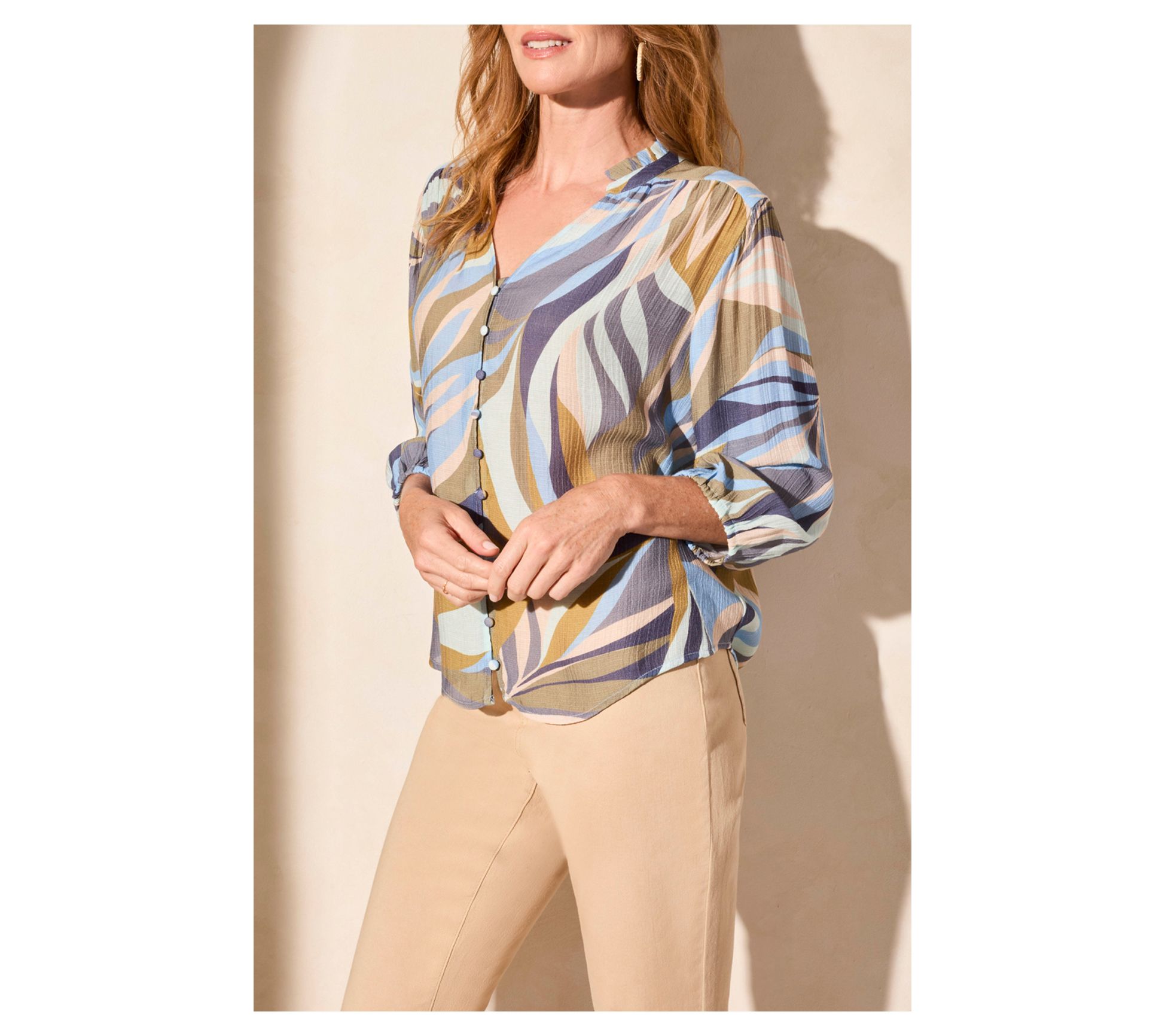 Refresh your wardrobe with this stylish button-front blouse. Its vibrant print paired with a textured woven fabric gives you a refined look suitable for spring and summer outings. The three-quarter-length sleeves with elastic cuffs make it easy to adjust and offer an effortless chic. A delicate ruffle detail at the collar adds a touch of sophistication to your ensemble. From Tribal.