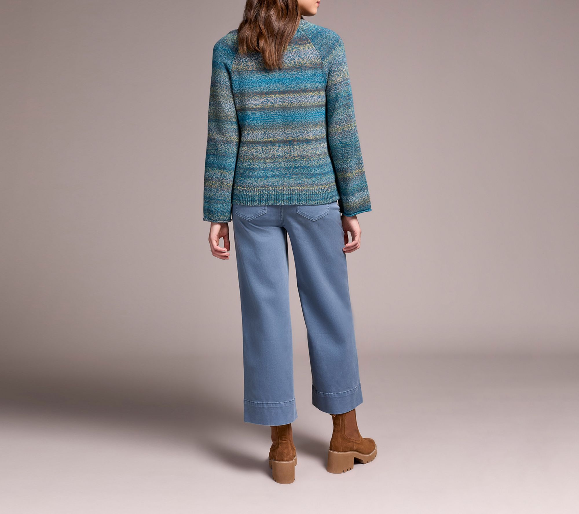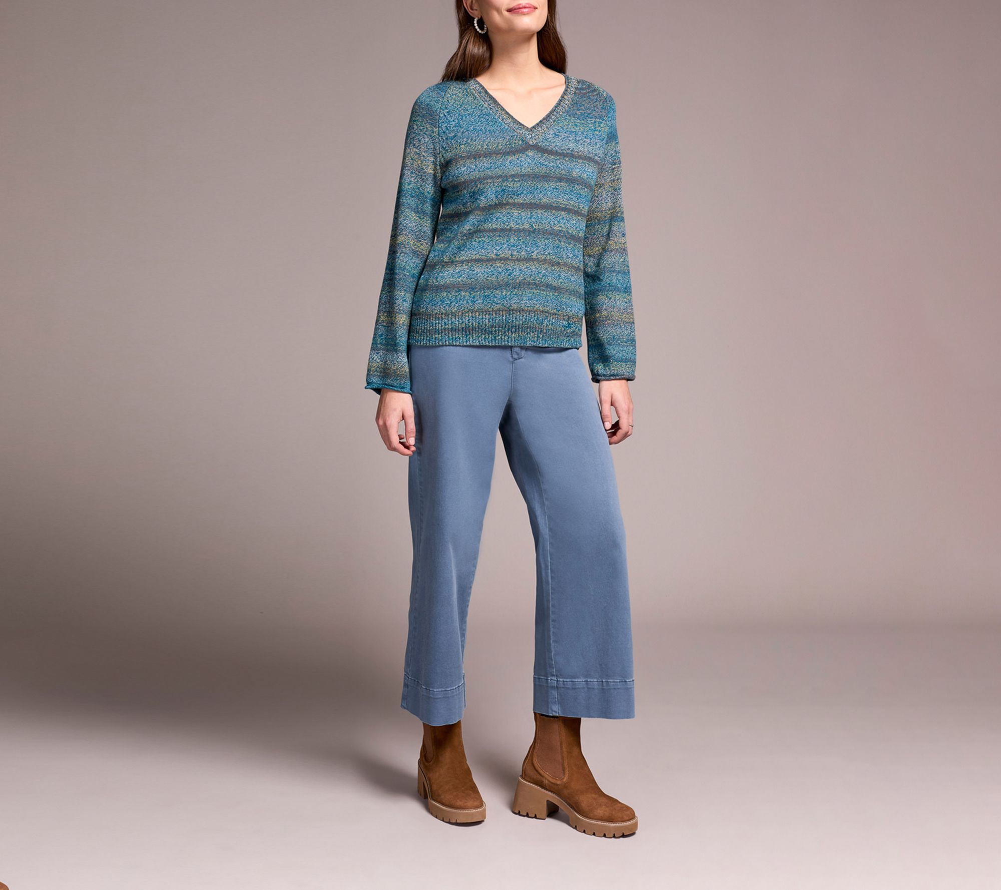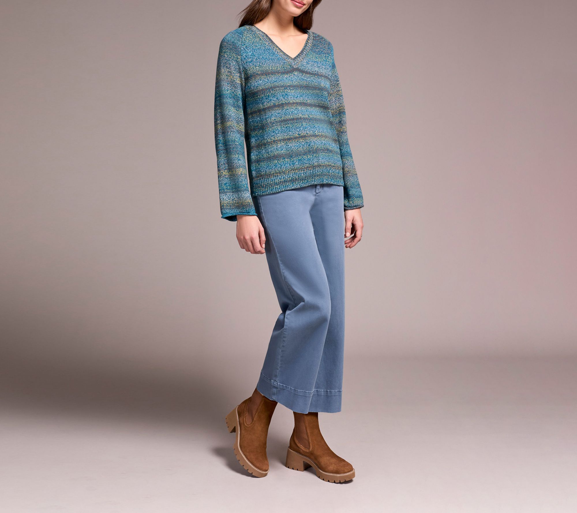 • Features: V-neckline, long sleeves, ribbed collar, abstract stripe pattern