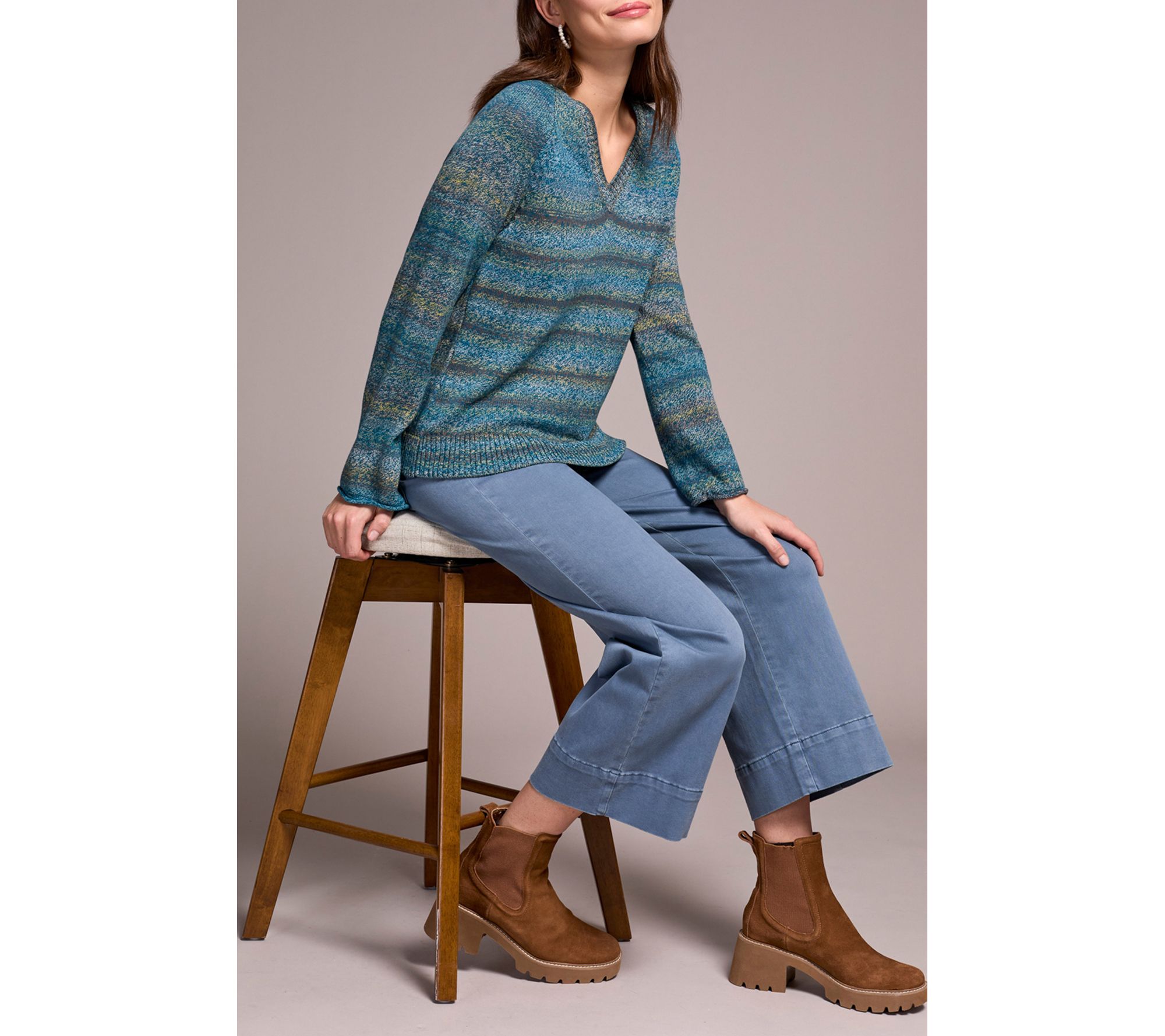 Cooler days are calling for this combed cotton sweater, soft to the touch and easy to layer for a stroll in the crisp air or a cozy evening indoors. Bold abstract stripes and a polished V-neckline bring modern flair to a timeless look, while long sleeves provide warmth without feeling bulky. From Tribal.