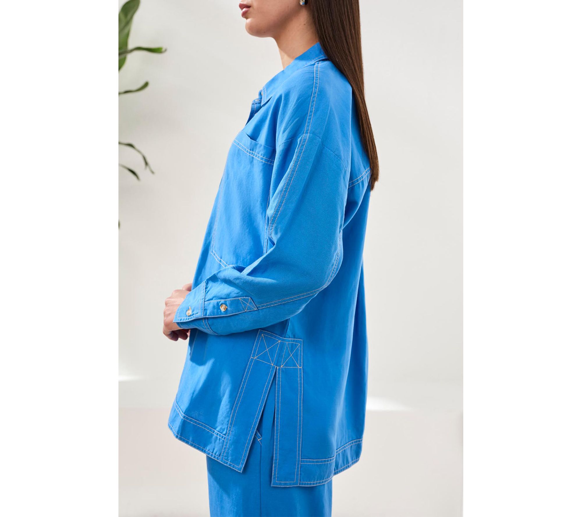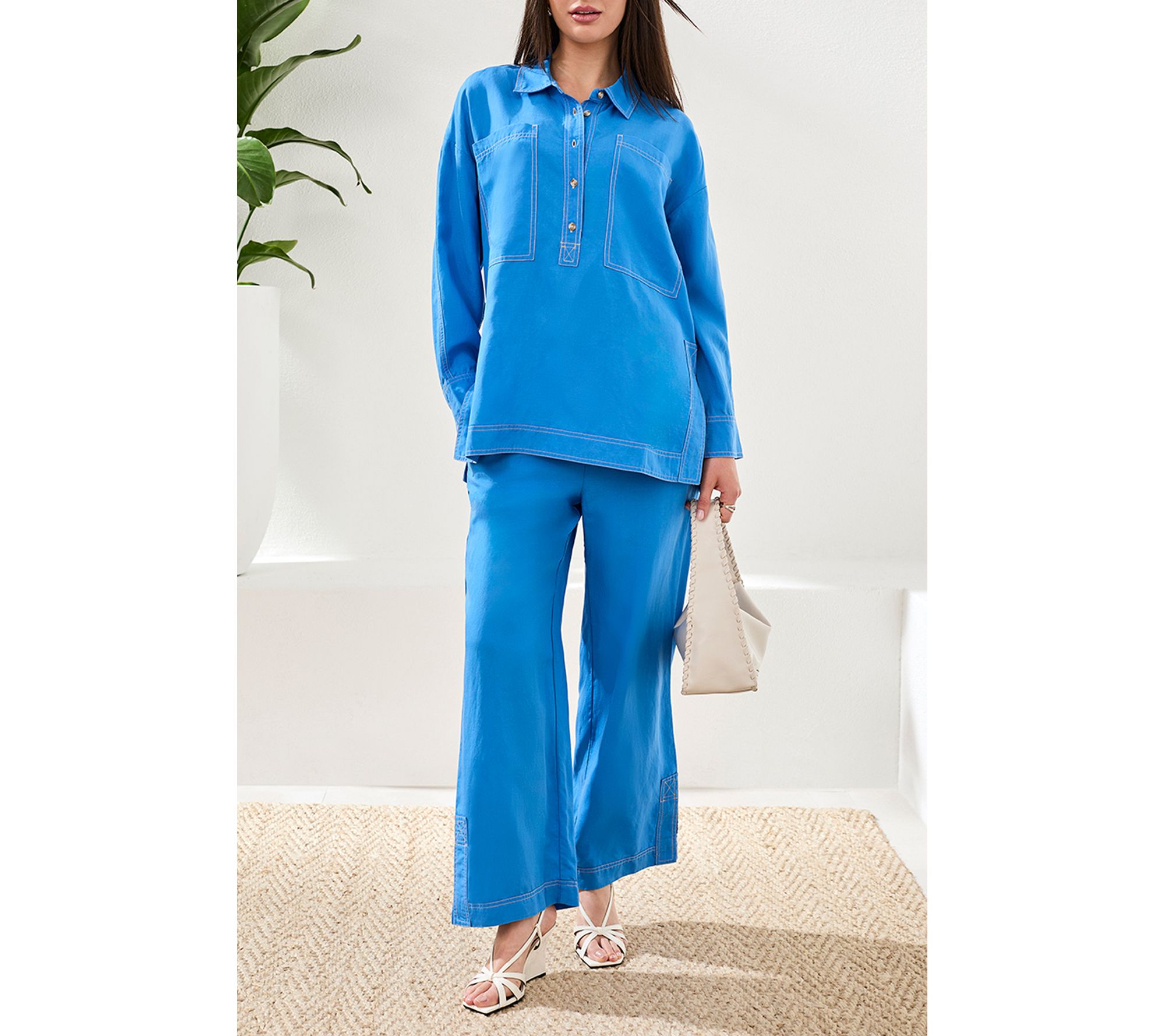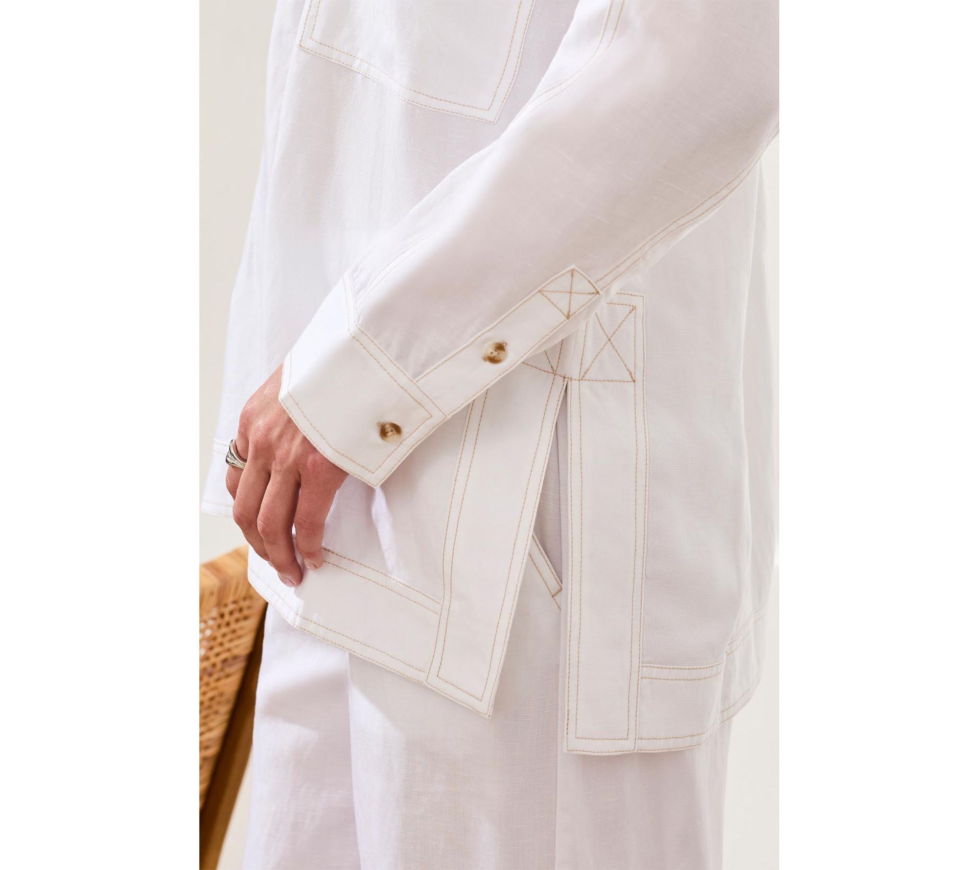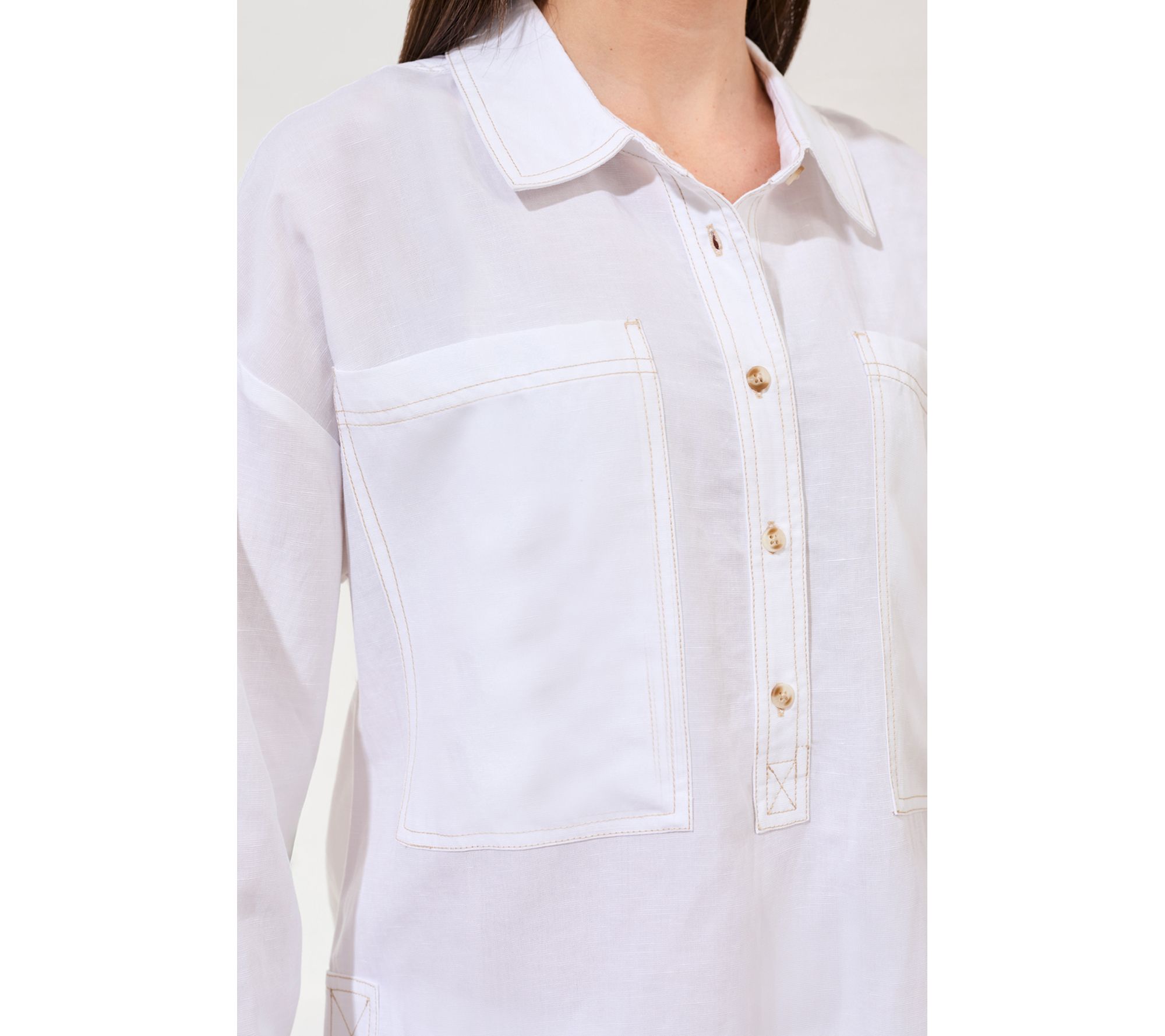 Whether you're setting out for a sunlit brunch or an easy afternoon in the city, this woven big shirt brings effortless style with its airy blend of lyocell and linen. The relaxed silhouette, utility pockets, and clean button-front design give you comfort and versatility for any warm-weather outing. From Tribal.