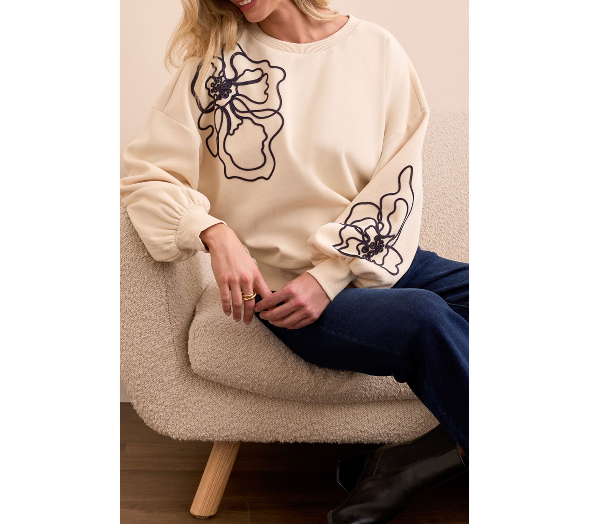 A cozy morning coffee run or an afternoon spent catching up with friends feels even better in this French terry top. Floral embroidery graces the shoulder and sleeve, bringing a sophisticated touch to your everyday routine, while the relaxed silhouette and brushed-back knit offer all-day comfort with a chic twist. From Tribal.