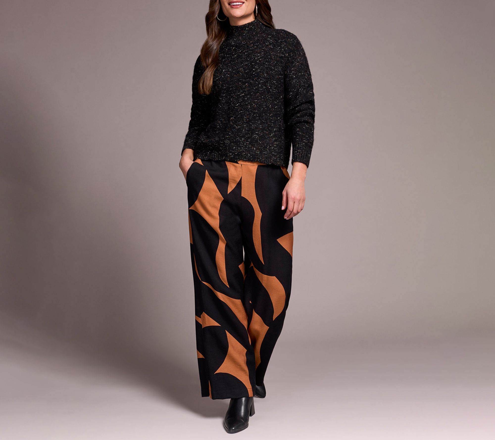Features: mock neck, long sleeves, drop shoulders, ribbed sleeves and hem, cable texturing on front