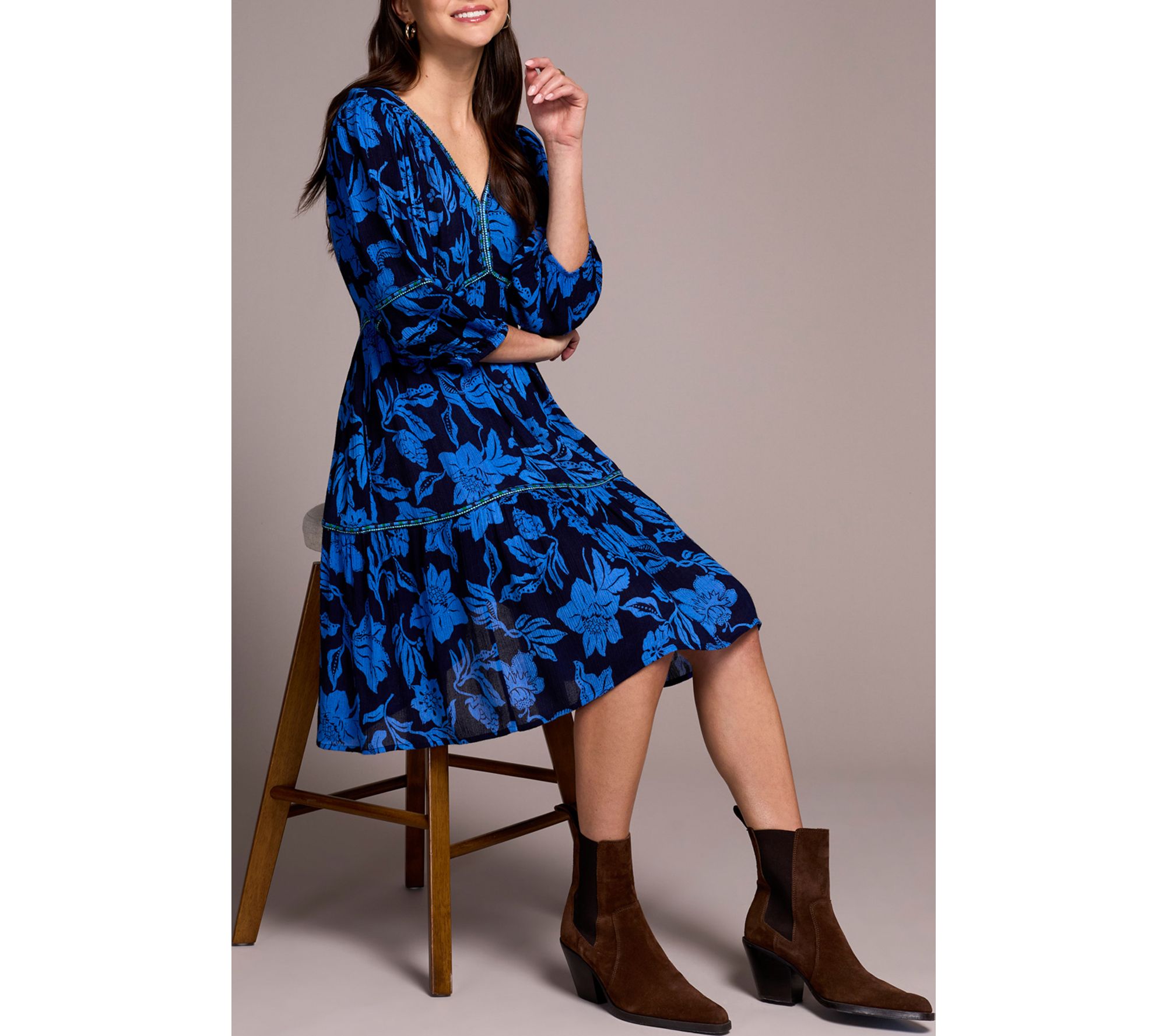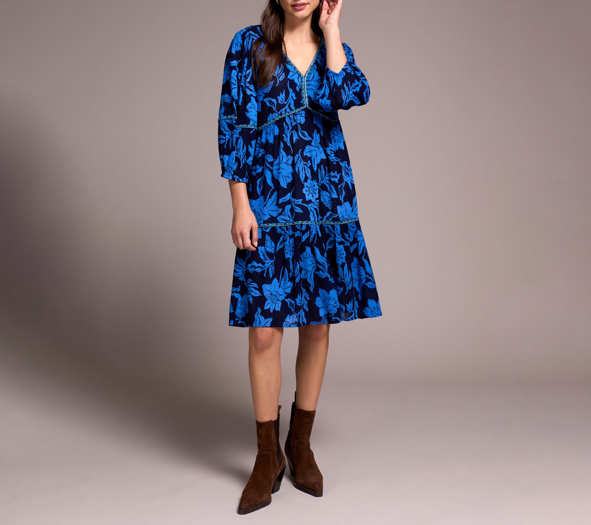 A woven dress with intricate embroidery and a vibrant tribal jacquard pattern makes every outing feel inspired. Designed to move gracefully from weekday lunches to weekend errands, its flattering V-neckline frames your look while 3/4-length sleeves and knee-length styling add ease and elegance you can wear all season. From Tribal.