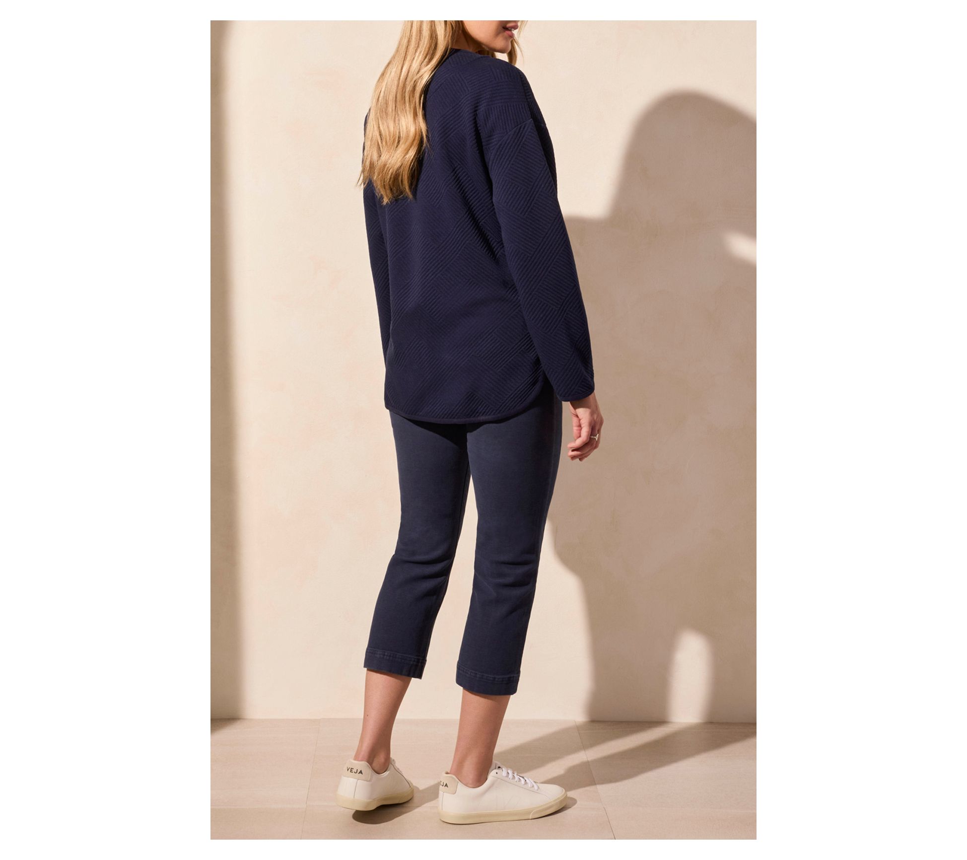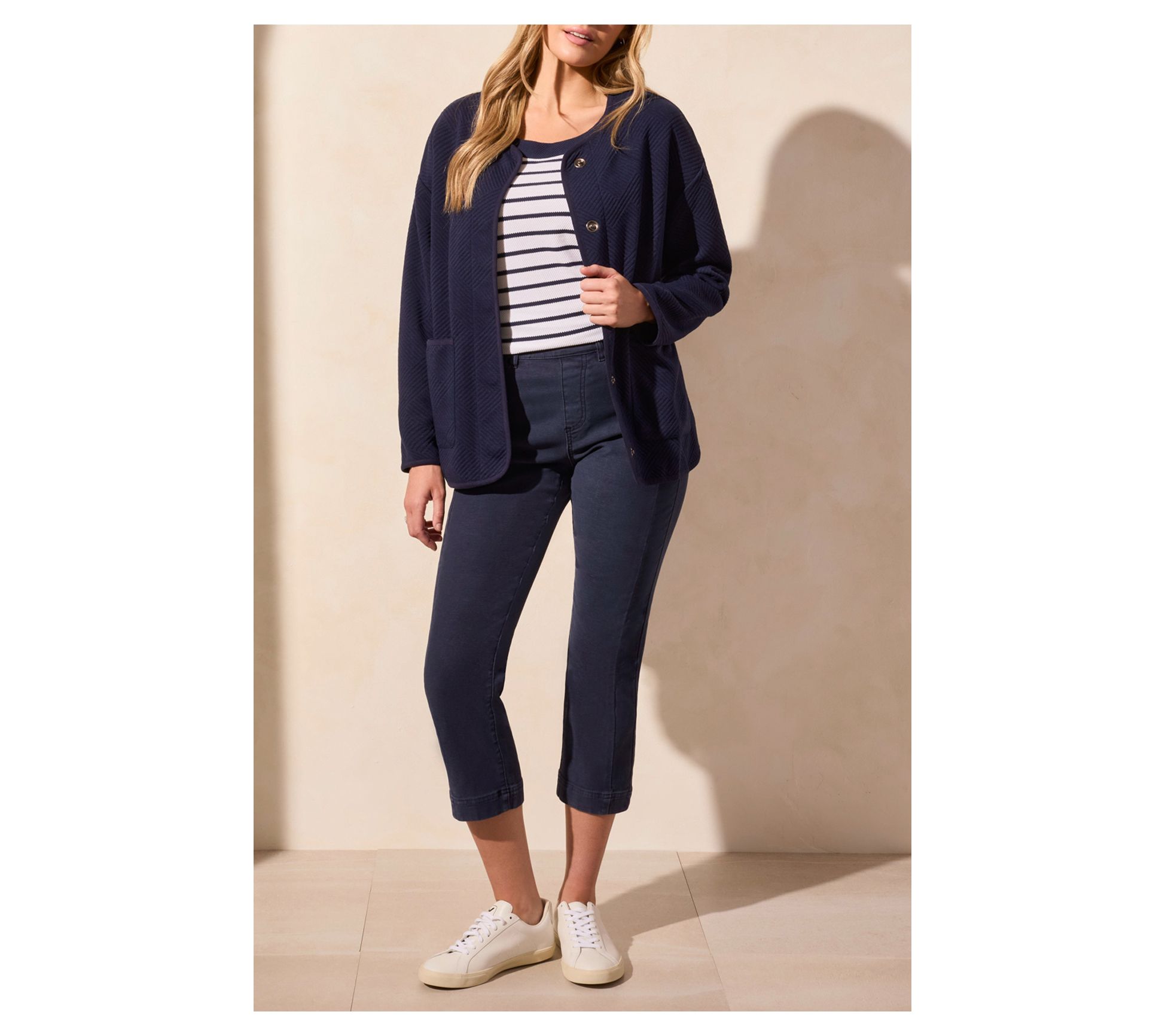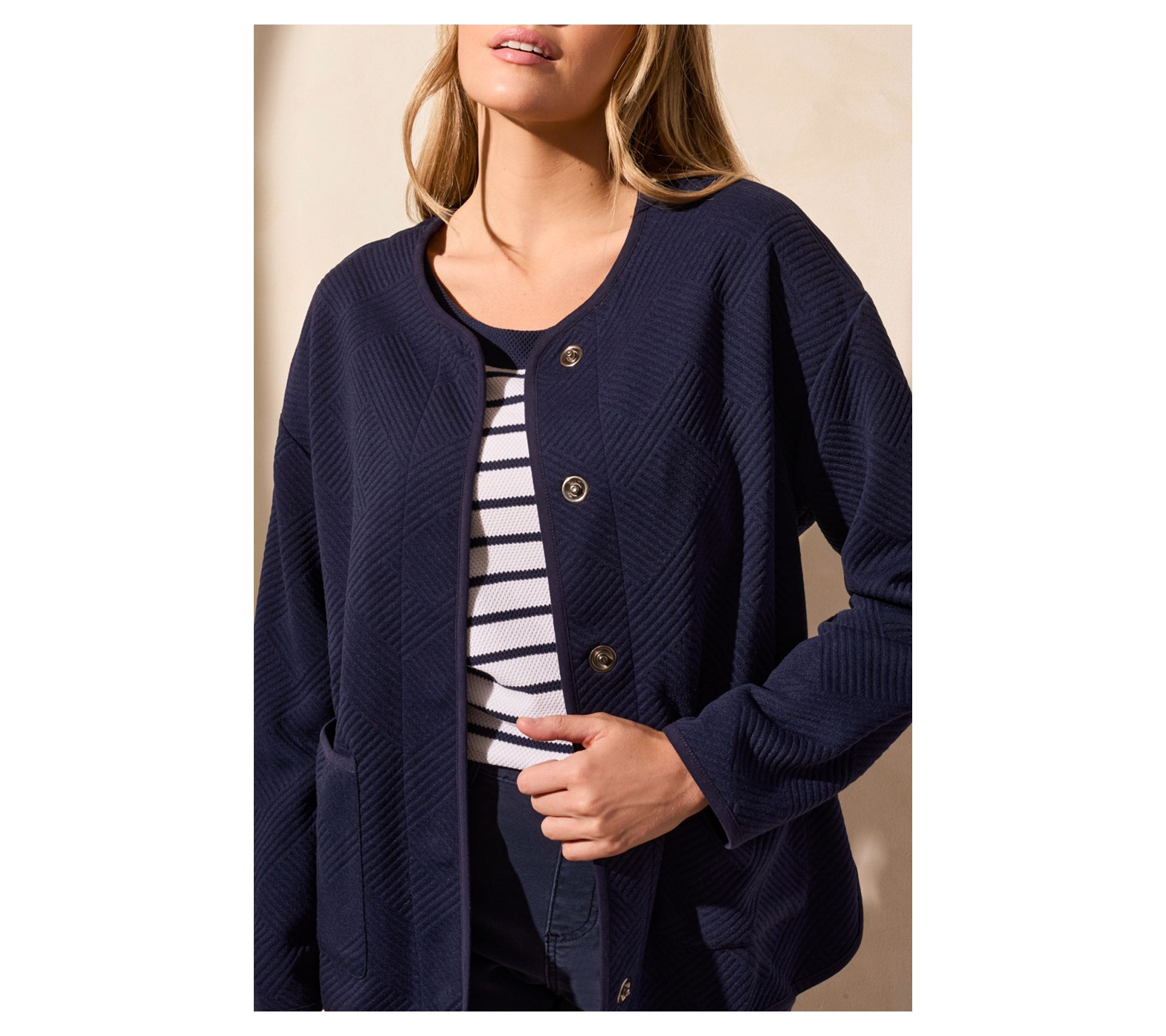 Cooler days don't stand a chance with this quilted knit long-sleeve cardigan. Perfect for layering, its relaxed fit easily slips over any ensemble, providing both warmth and style. Front patch pockets offer convenient storage or a cozy spot for chilly hands, while the hidden snap button closure keeps out the cold breeze. From Tribal.