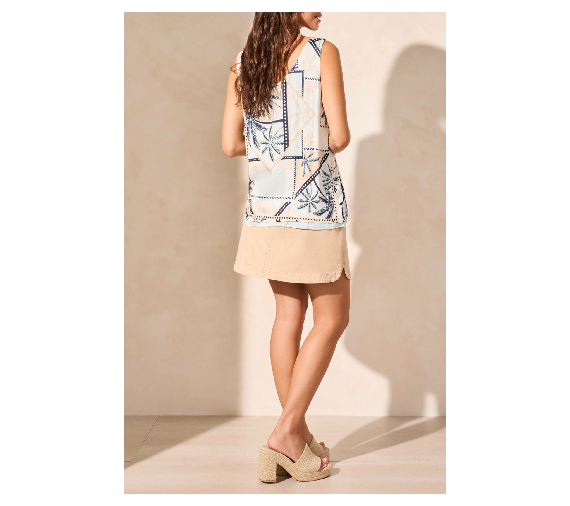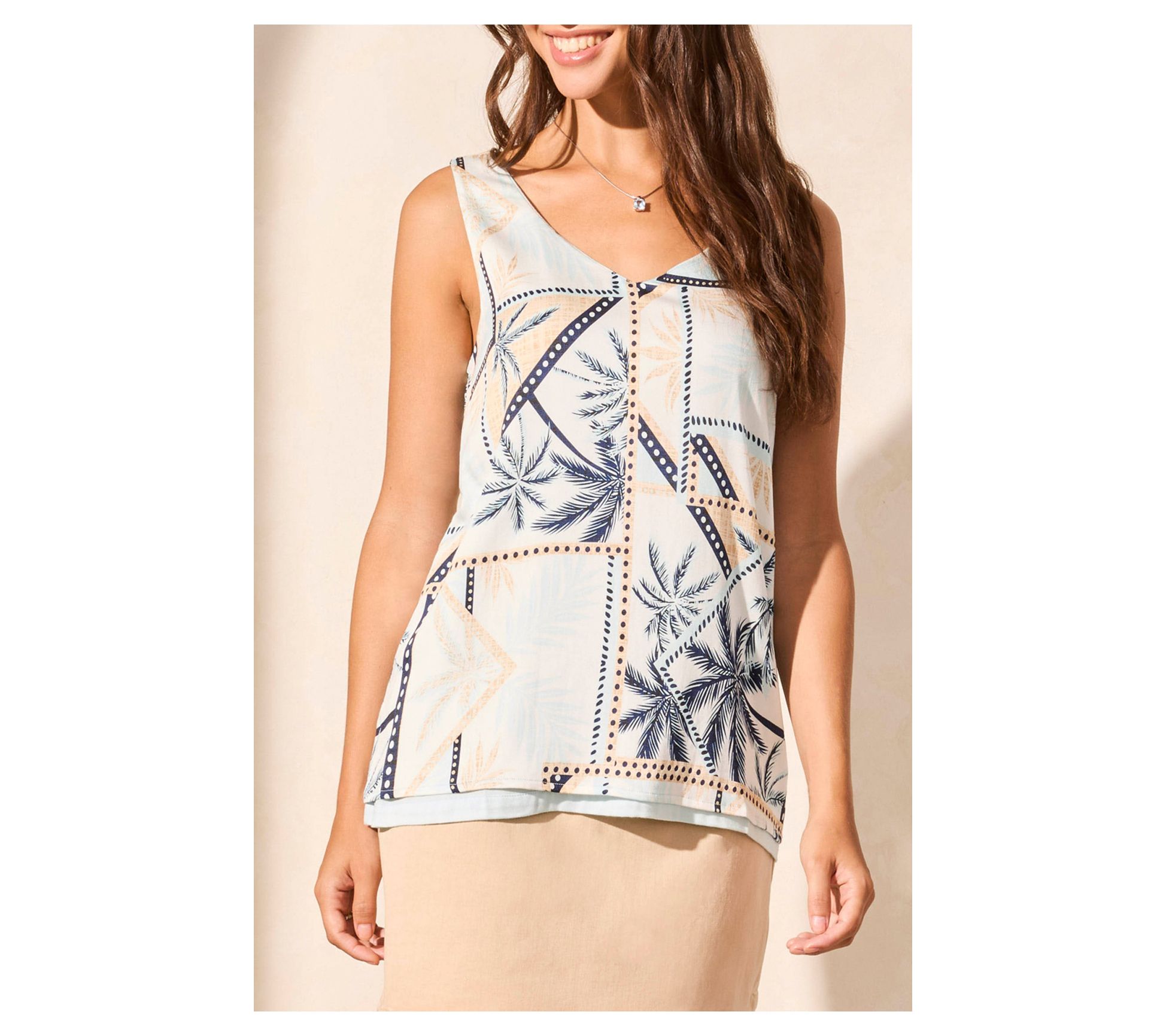 Meet your new go-to style solution with this versatile V-neck cami, offering the perfect blend of fashion and function. Designed for those unpredictable days, it seamlessly switches between a solid and a playful print, giving you endless options for chic appearances. Its flowy fit and stretchy challis fabric make it ideal for wearing on repeat. From Tribal.