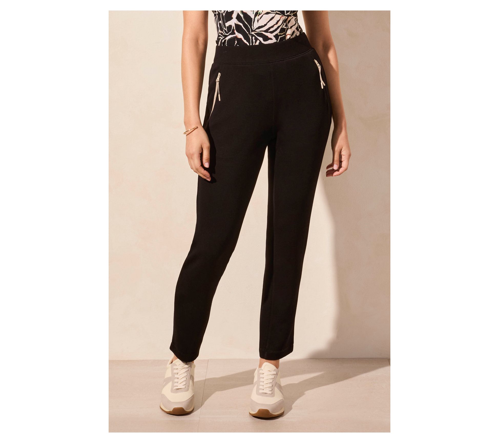 Slip into the ease and comfort of these scuba knit pants and allow your style to remain effortlessly chic. The pull-on design with a stretchy elastic waistband emphasizes all-day wearability, while the slim-leg fit delivers a contemporary silhouette. The contrast zipper accents at the pockets offer a modern touch, making them versatile for both casual outings and more polished occasions. From Tribal.