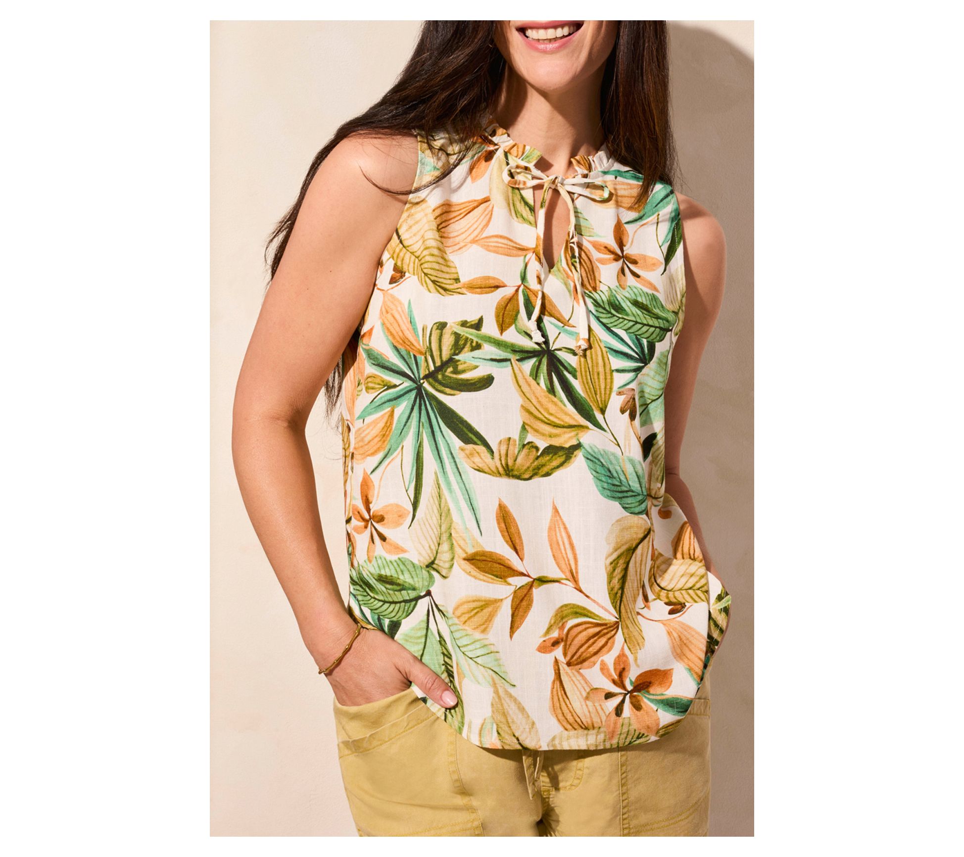 Enjoy the warm seasons with this tropical inspired sleeveless frill neck linen blouse. Perfect for both spring and summer outings, this blouse is crafted from a breathable linen blend that feels soft against the skin, keeping you cool and comfortable. The playful frill around the split neckline adds a touch of flair, making it an ideal choice for a range of casual occasions. From Tribal.