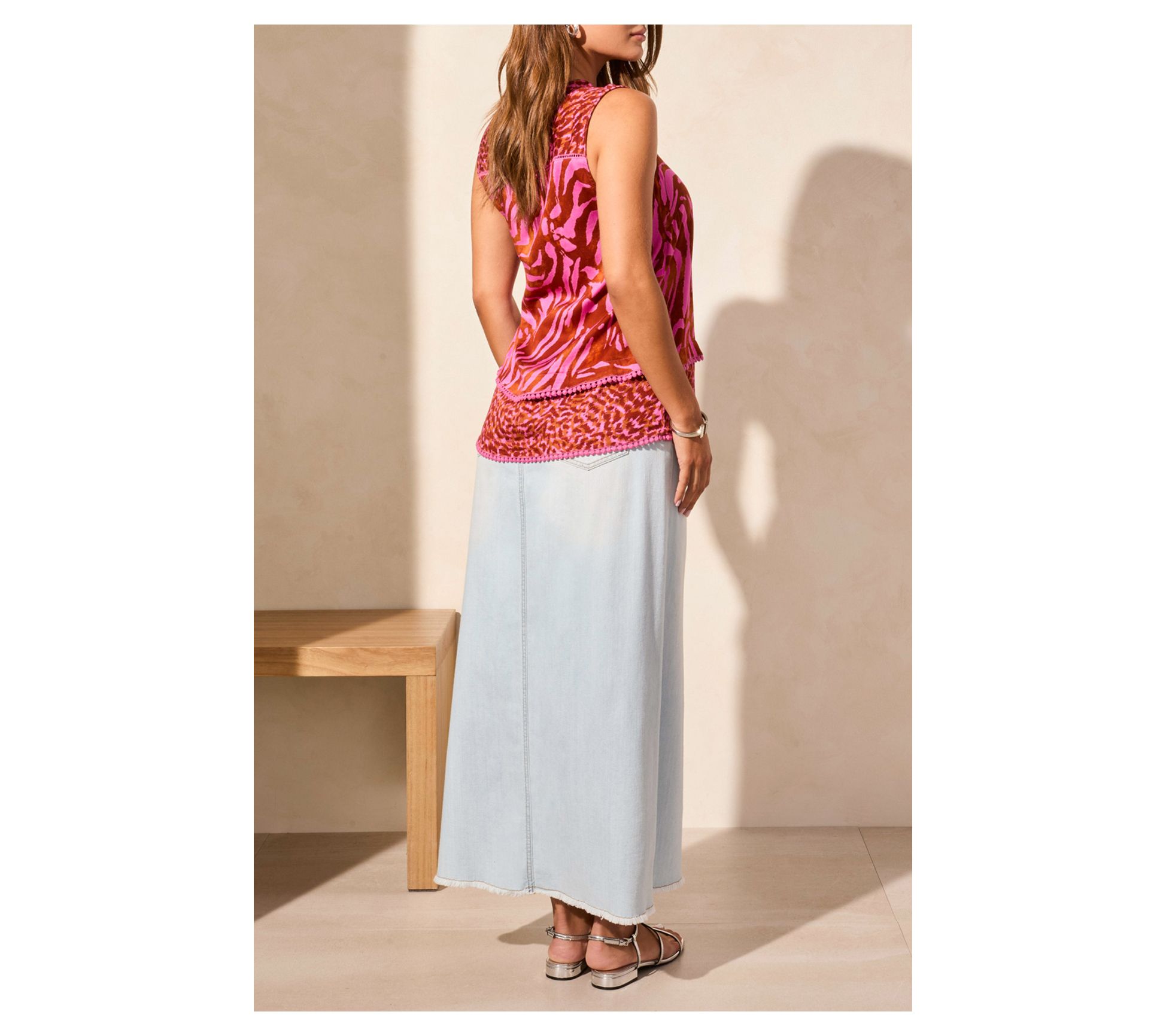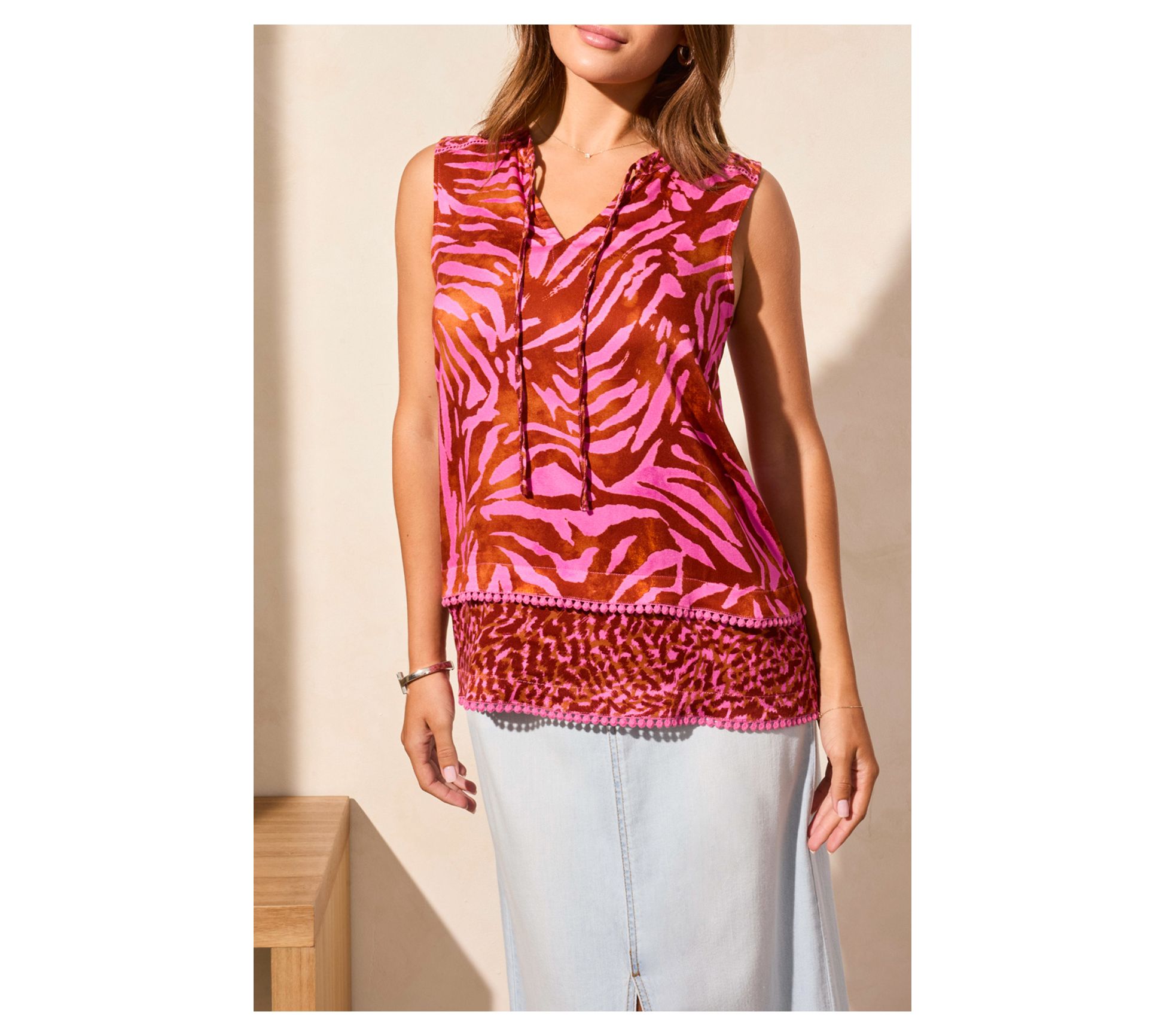Liven up your look with this bold sleeveless top, crafted from brightly patterned challis fabric that offers a touch of comfortable stretch. The notch at the neckline draws attention to your face, providing a poised finishing touch. From Tribal.