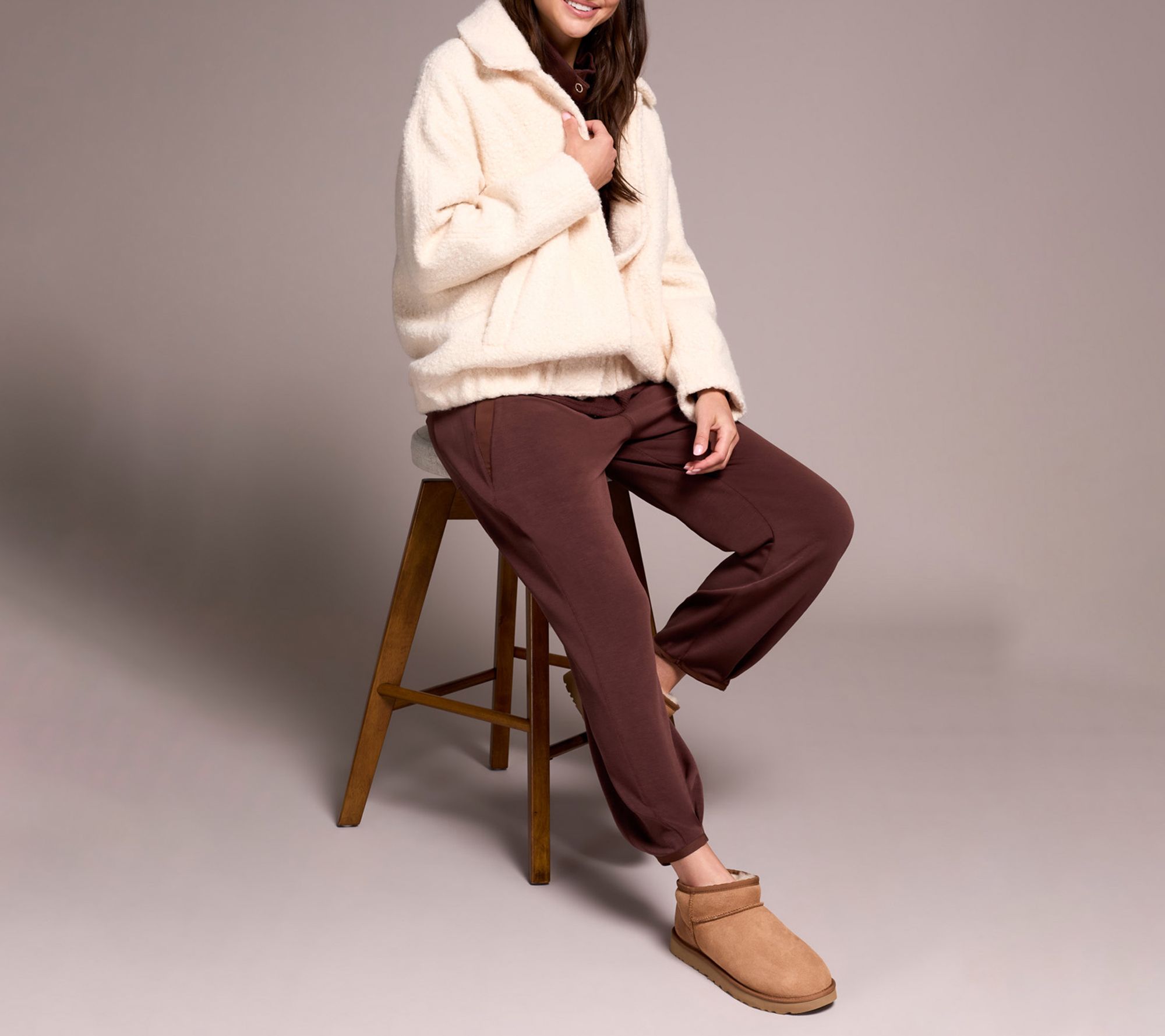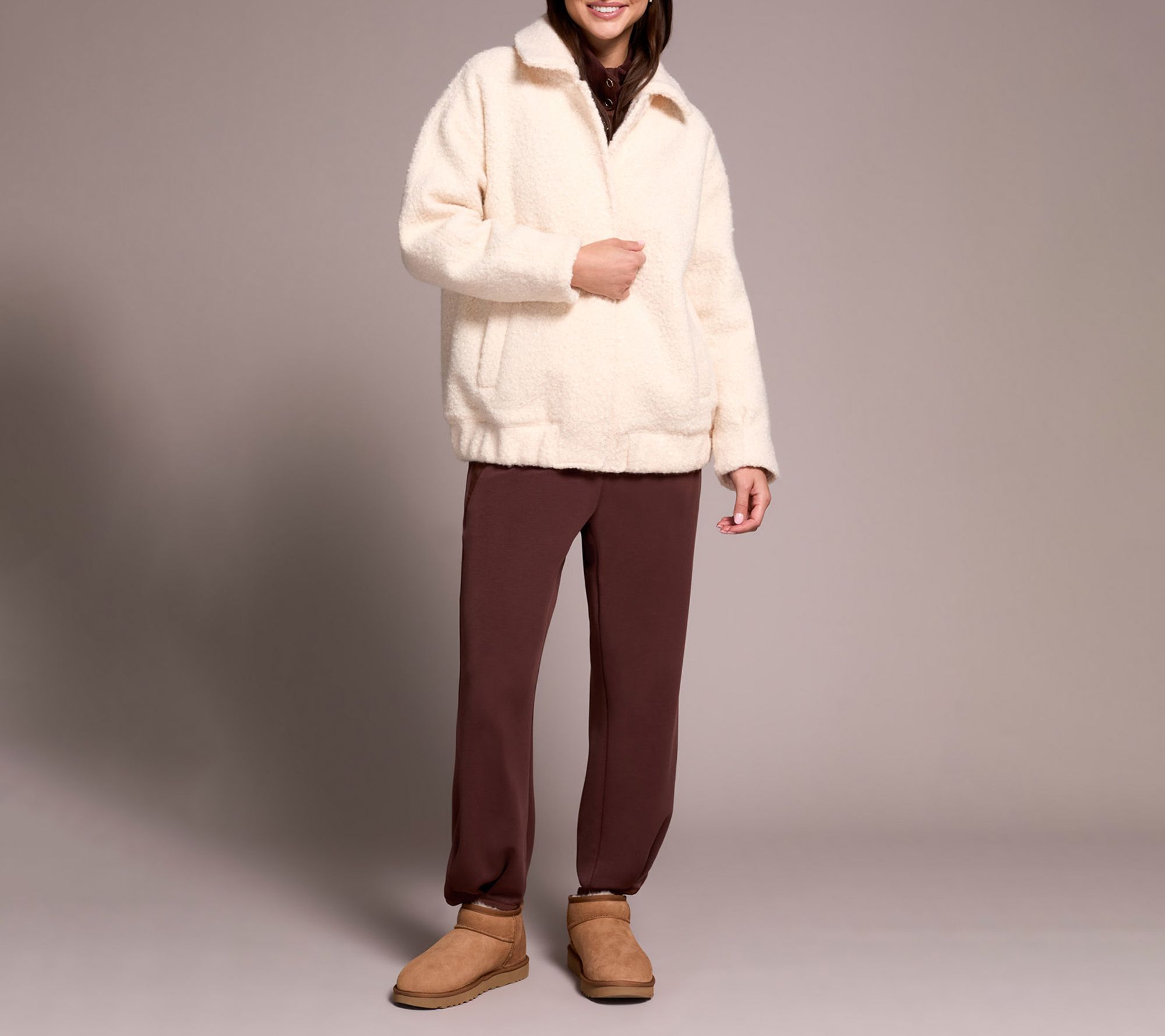 A lightweight bomber jacket brings a touch of modern flair to chilly days, whether you're meeting friends for coffee or making your morning commute. The boucle fabric lends a soft, textured feel, while the elastic waistband and handy side pockets add both comfort and style to your outerwear rotation. From Tribal.