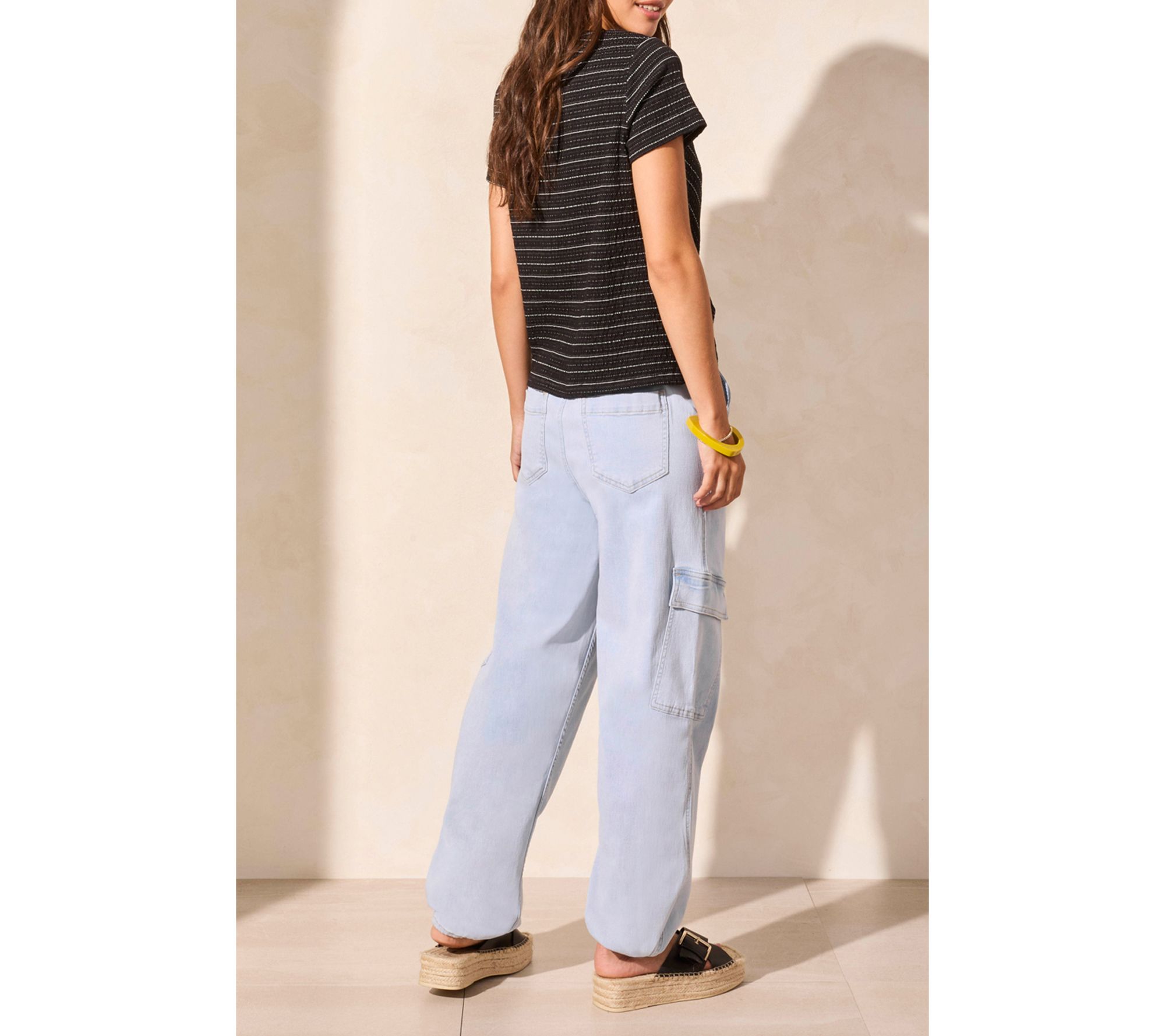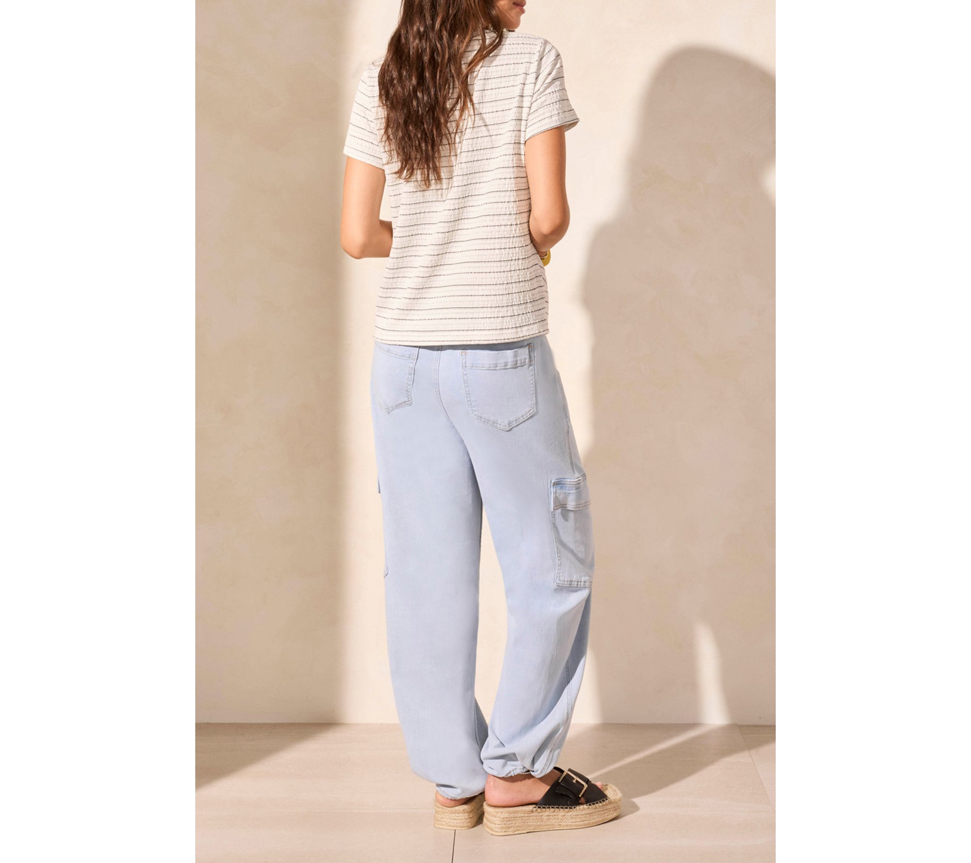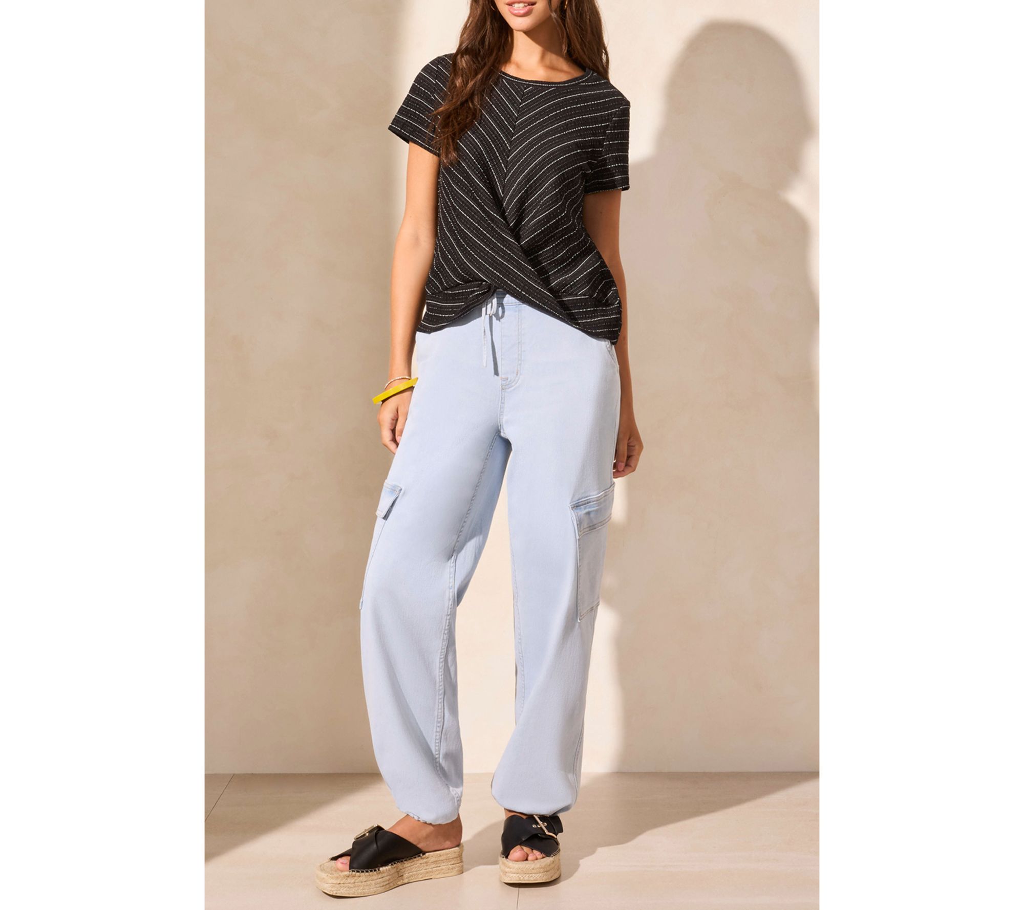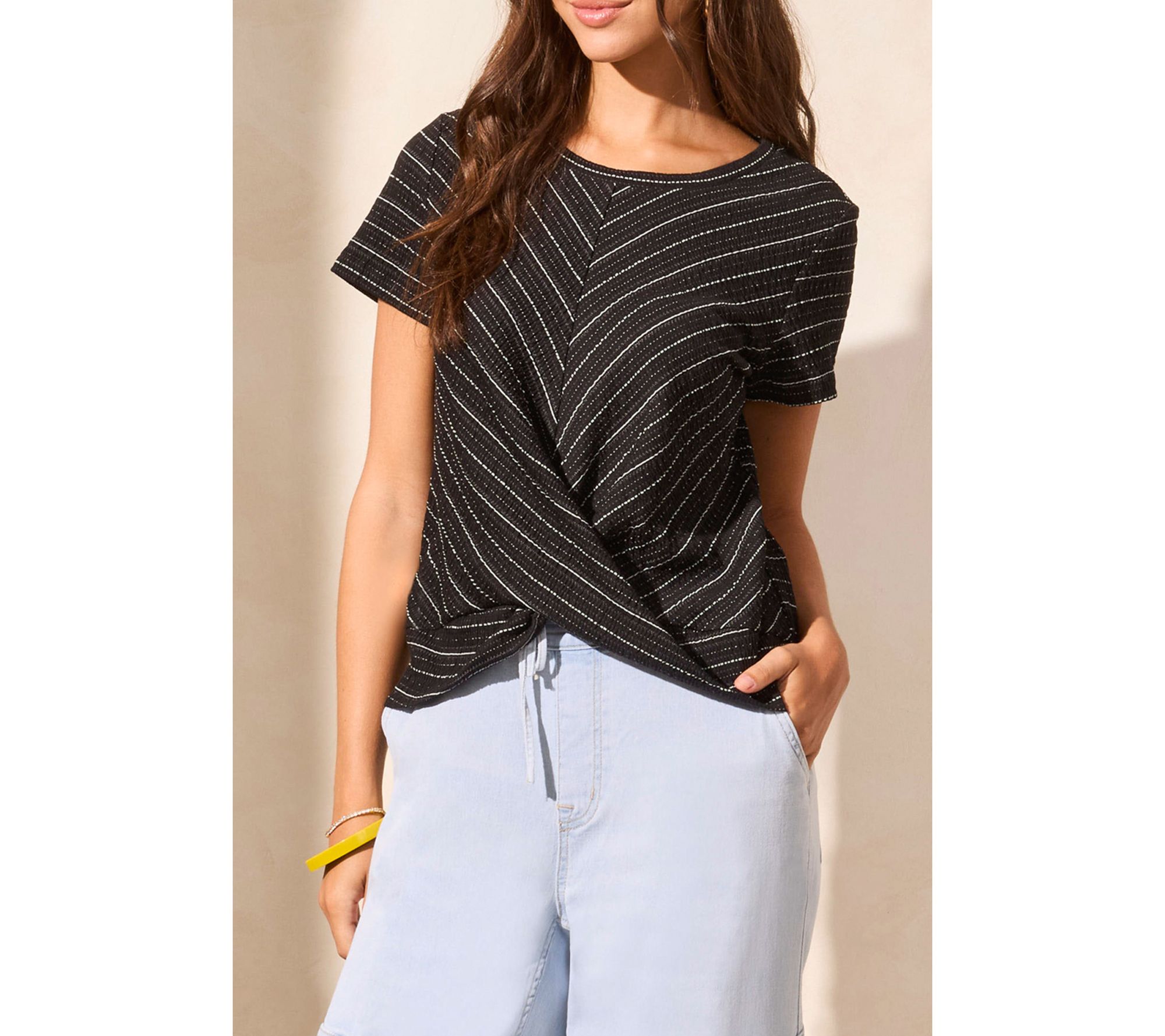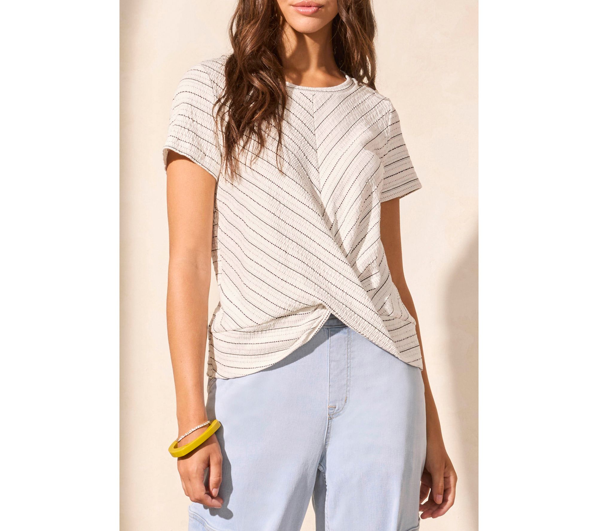• Features: crew neckline, short sleeves, twist-knot hem, textured stripe pattern