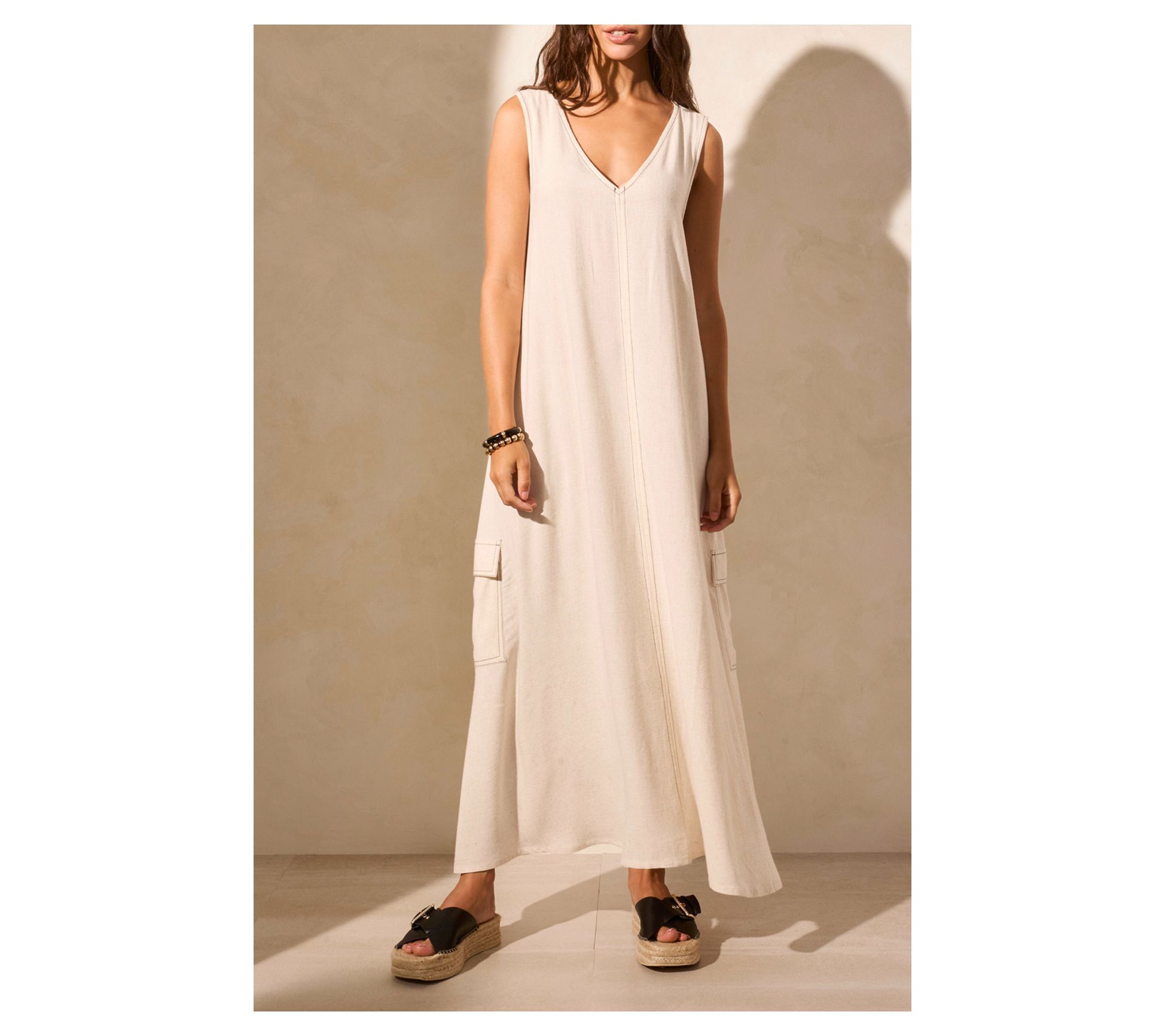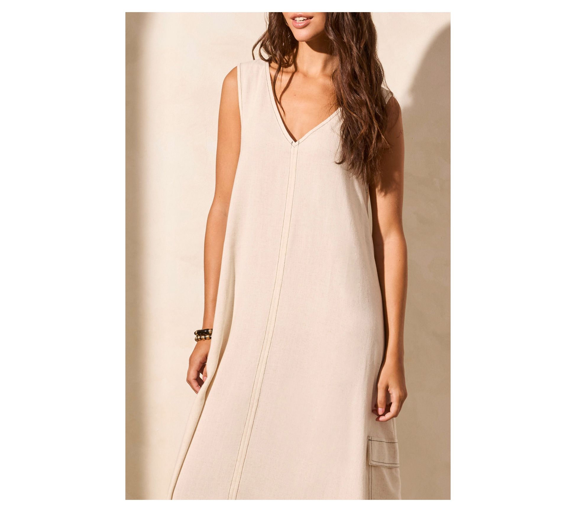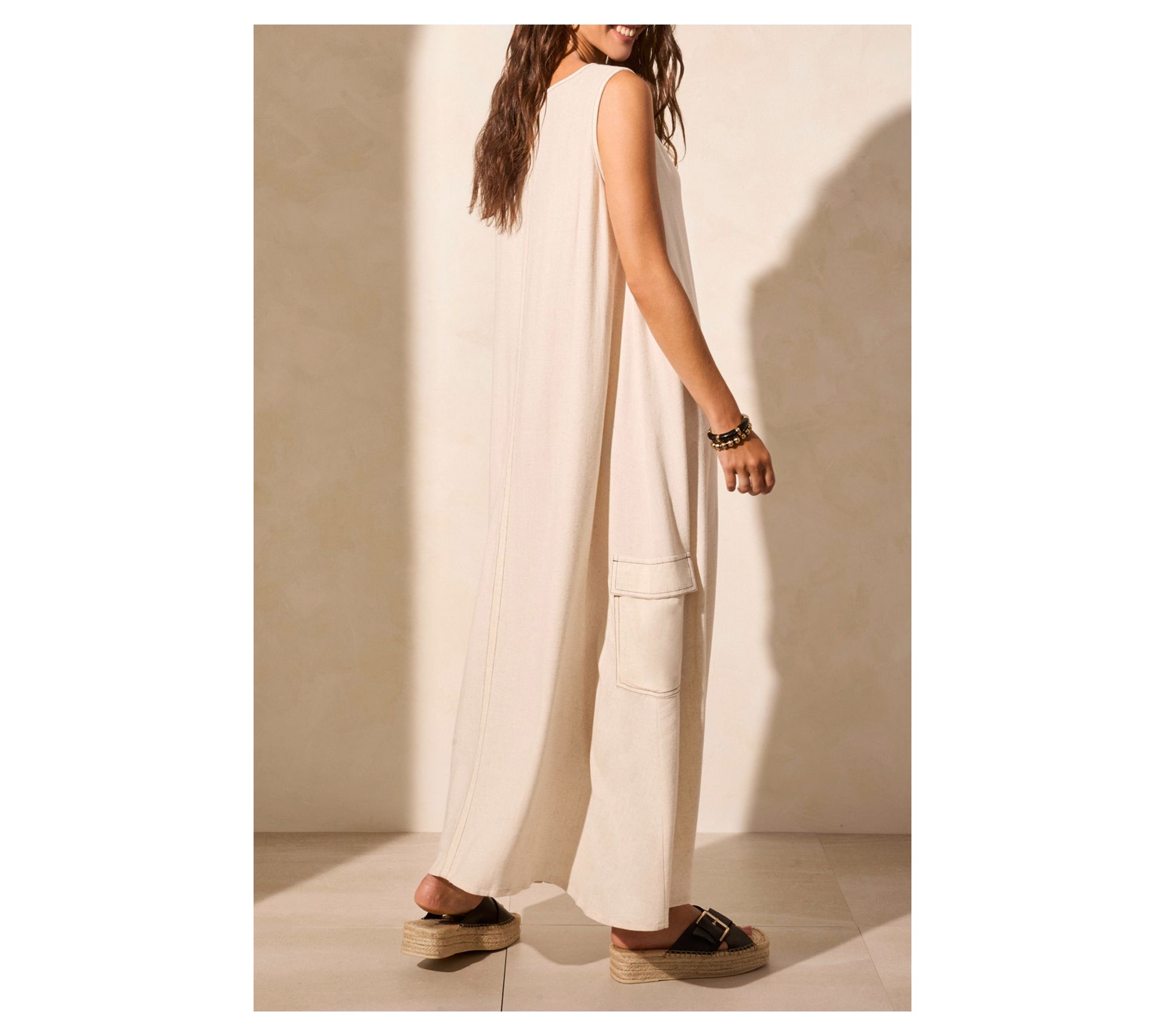 Breeze through the day in this relaxed shift dress, featuring classic cargo pockets for a charming, casual vibe with convenient pockets. The sleeveless cut and airy linen blend offer an easy, laid-back feel for sunny days. From Tribal.