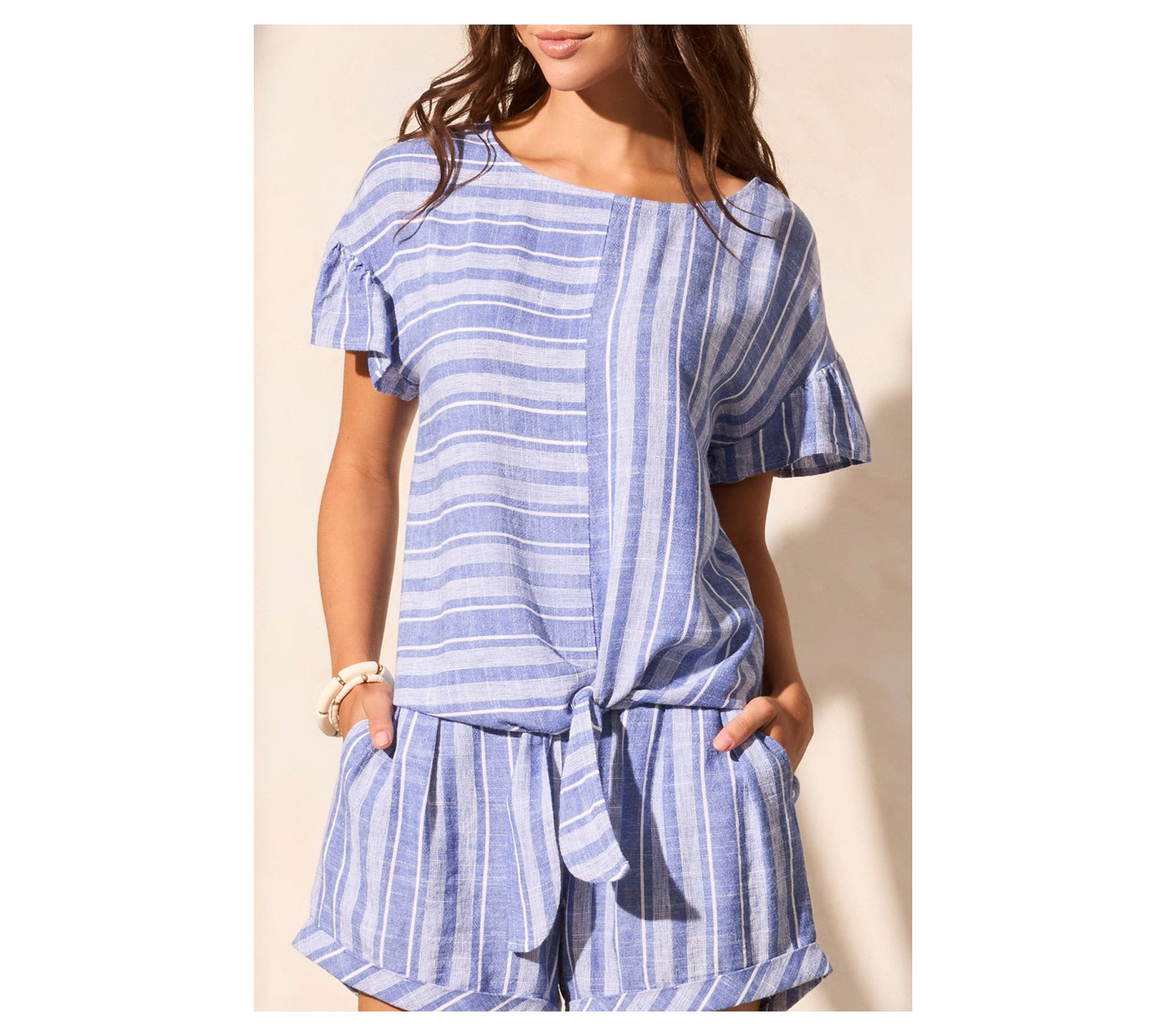 • Features: tie-front, frilled sleeves, boat neckline