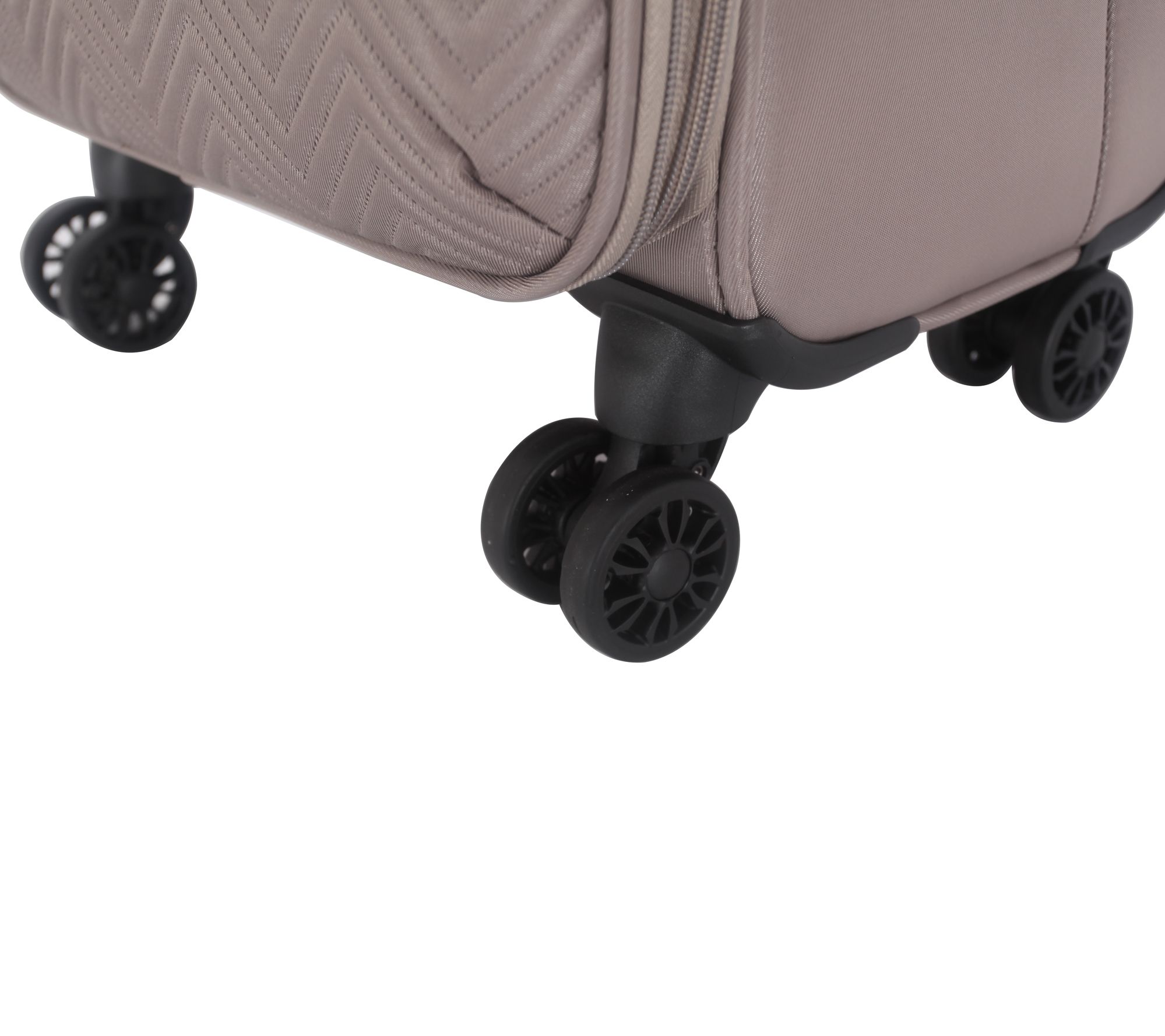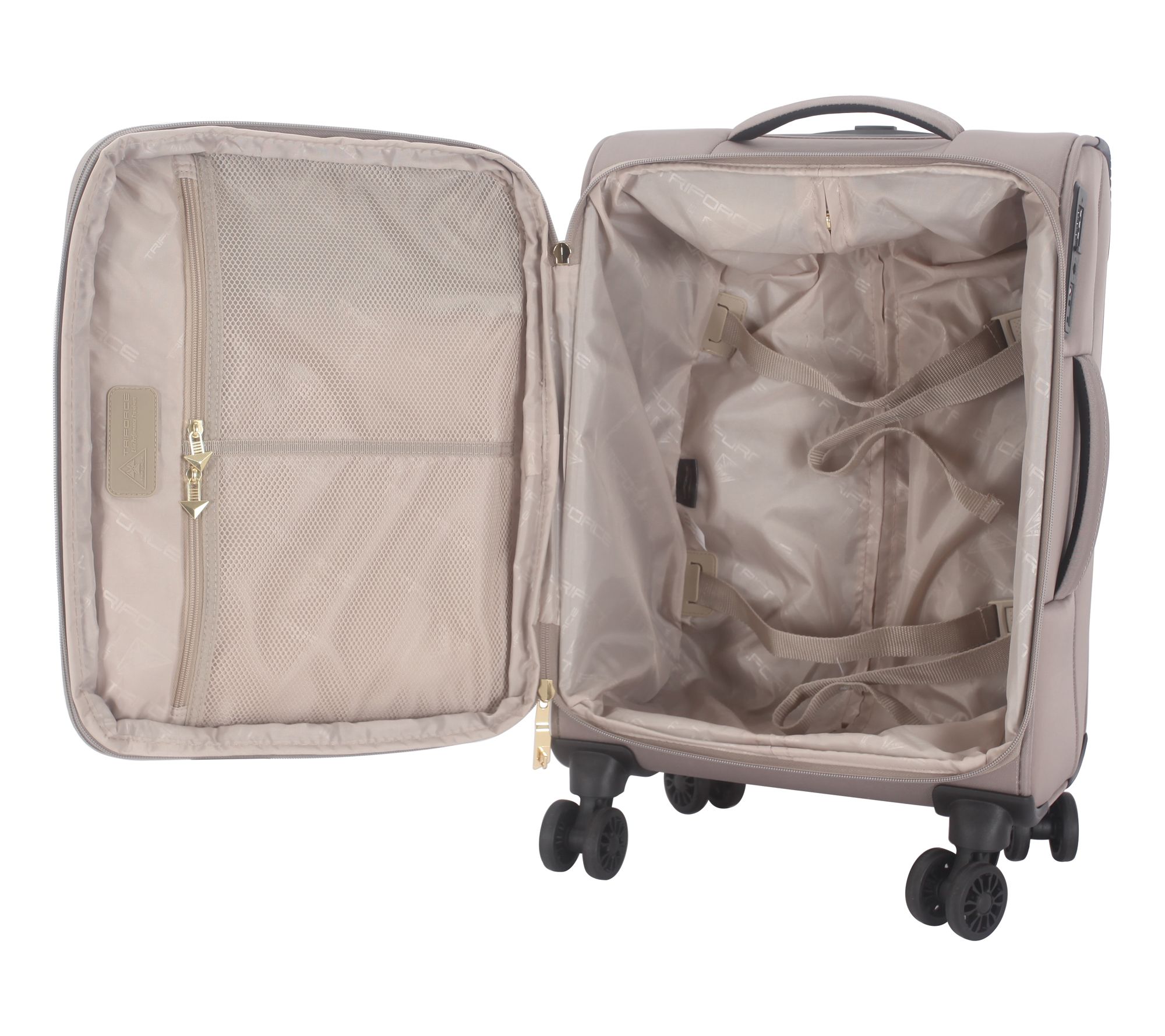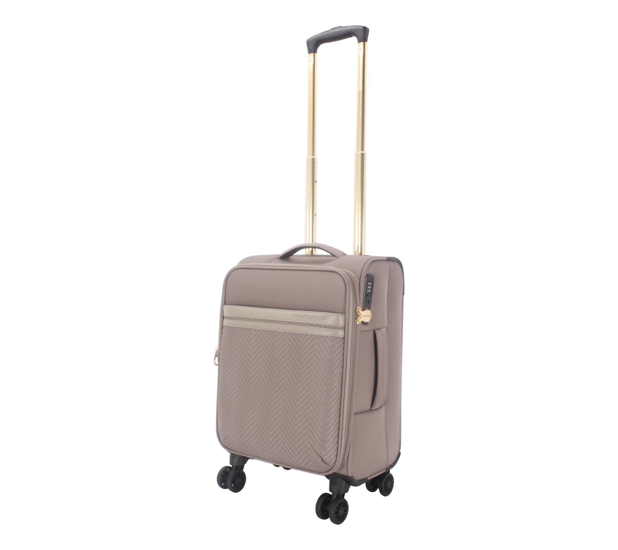 From departure to arrival, you'll stay well organized with this stylish softside carry-on from Triforce. Featuring a modern chevron or houndstooth design, this lightweight yet sturdy travel companion glides along gleaming with goldtone hardware. Overbought while souvenir shopping? With an expandable interior, you can pack more of your personals for the return trip. And, when it's time for "wheels up," you've got eight spinner wheels to get you quickly to your gate. Now, where to? From Triforce.