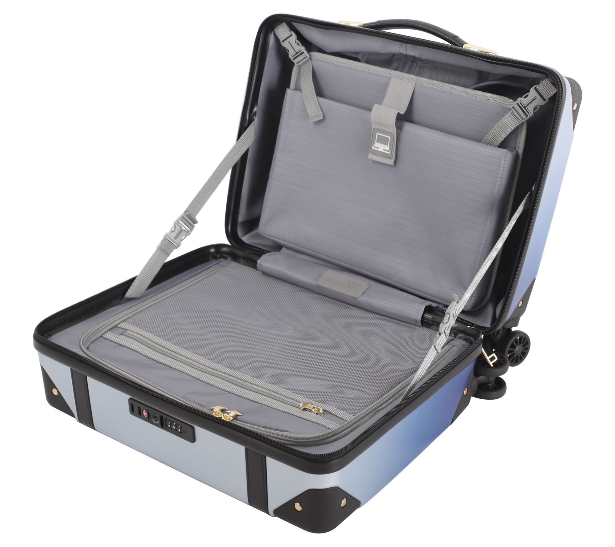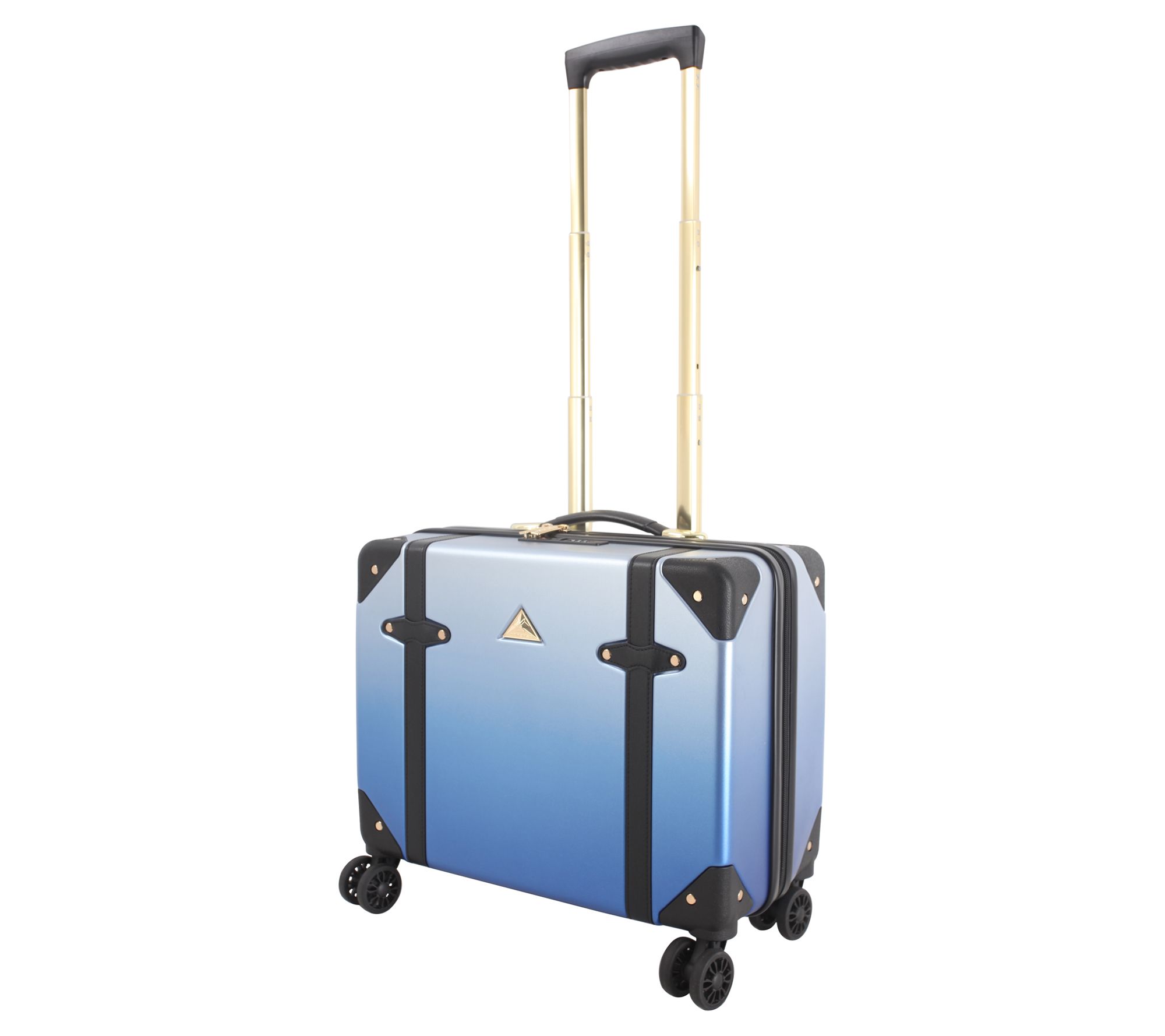 • ABS/PC exterior, textured finish, goldtone hardware and accents, contrasting trim and corner guards, eight spinner wheels, aluminum telescoping handle, carry handles