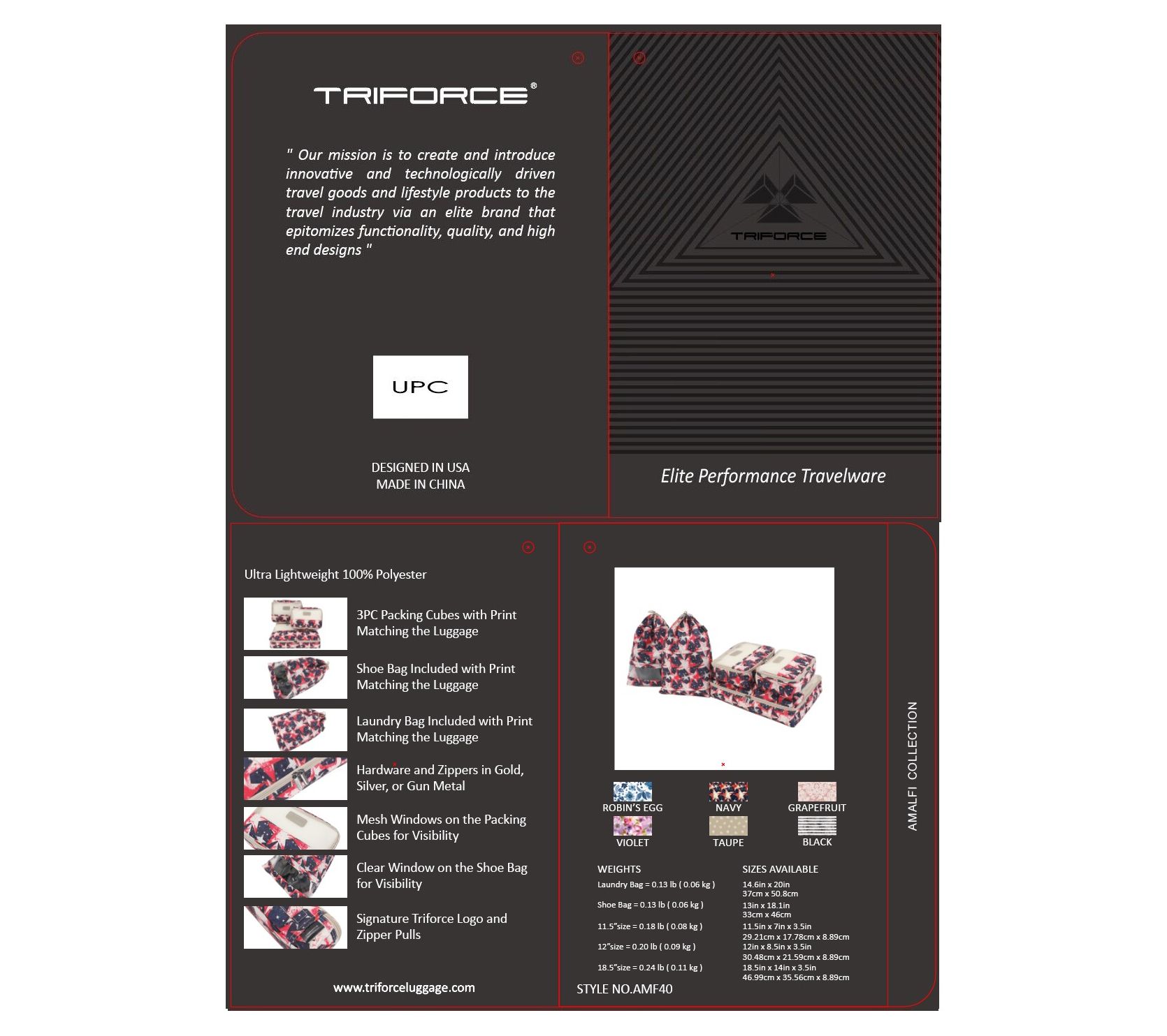 Keep your essentials sorted and your travels stress-free with this handy set of packing cubes, laundry bag, and shoe bag -- each thoughtfully designed to help you identify contents quickly with mesh and clear windows. The lightweight polyester construction makes packing a breeze, while coordinating prints give your luggage a sleek, polished look. From Triforce.
