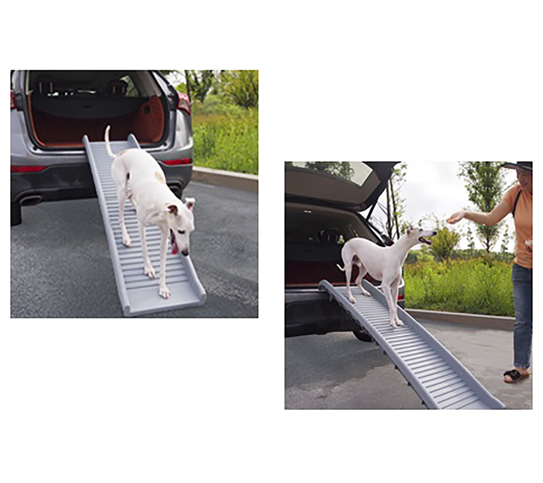 Make traveling with your furry friends a breeze with this folding pet ramp. Designed for both cats and dogs, this durable ramp offers effortless climbs in and out of all cars, small trucks, and SUVs. It's lightweight, portable, and folds easily, making it perfect for trips short and long. From Trimate.
