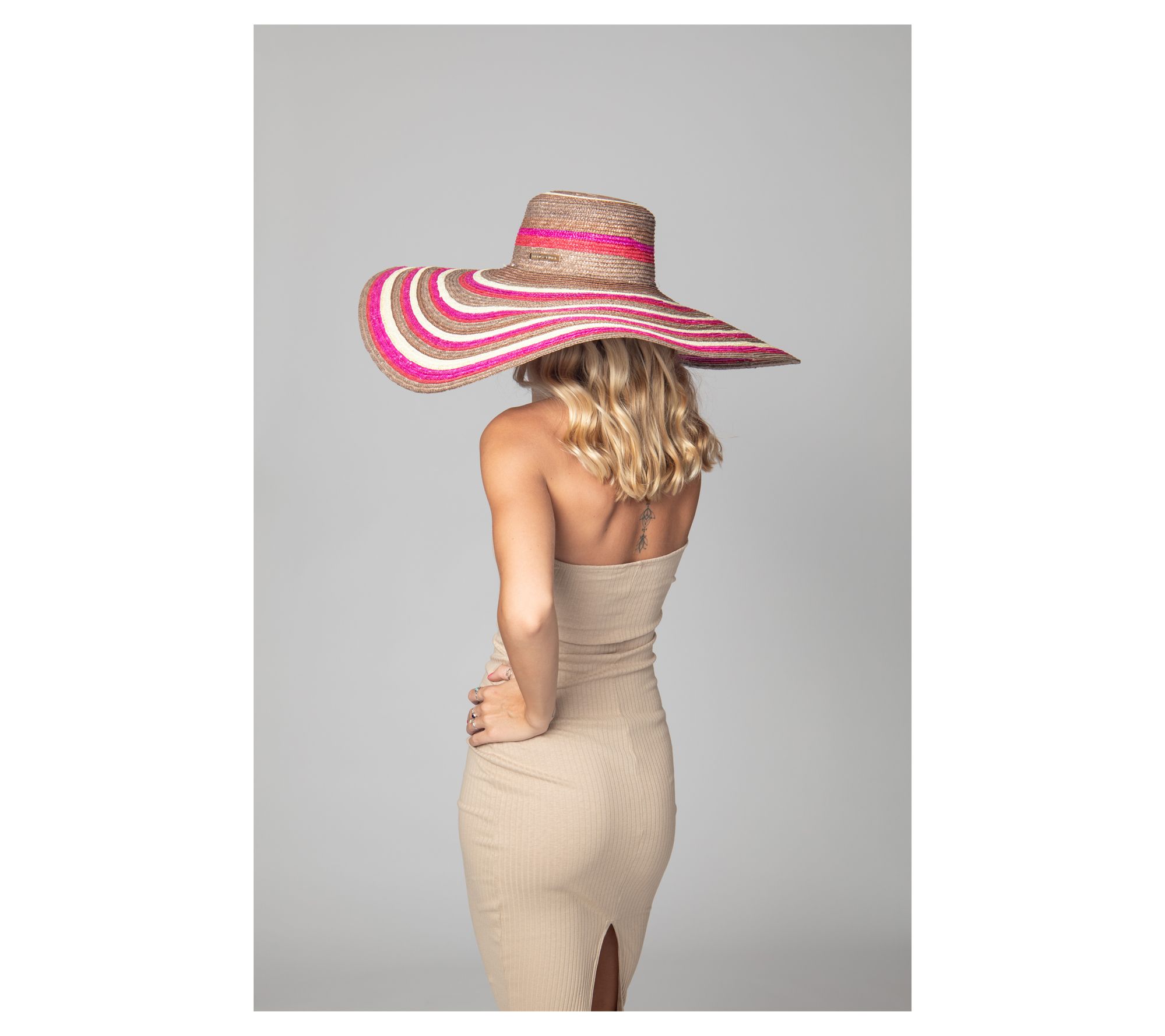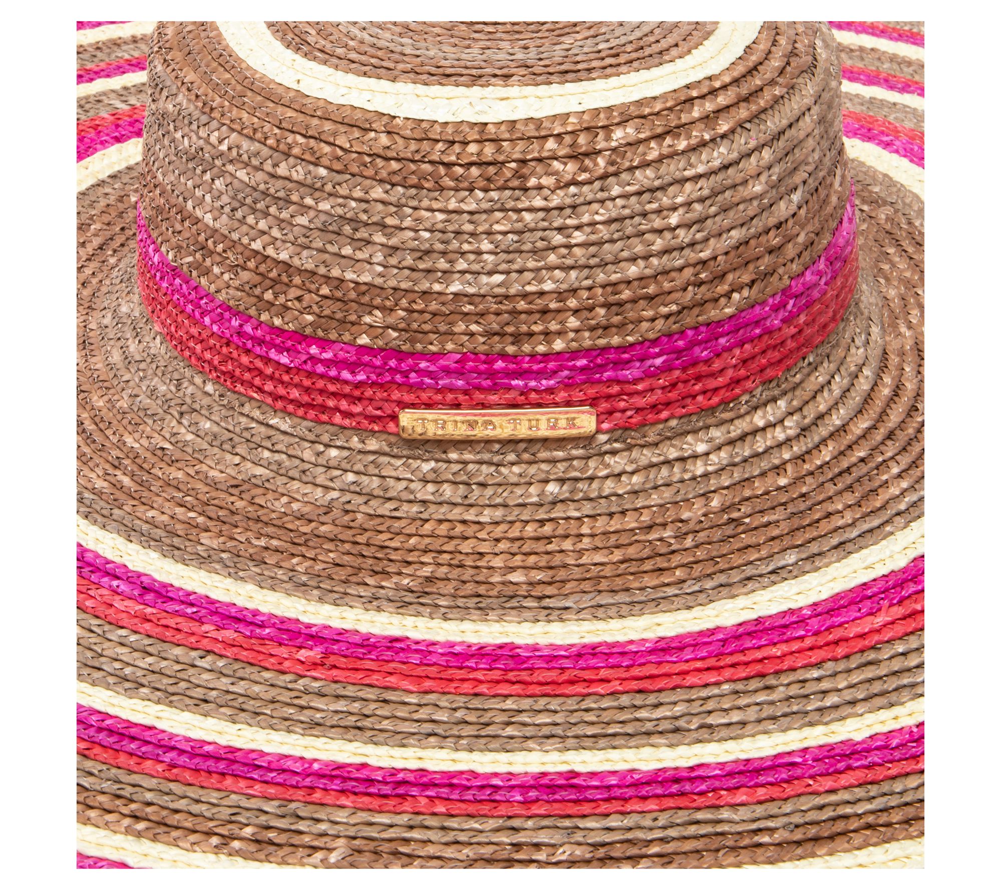 Shield yourself from the sun in style with the Tuscan floppy sun hat by Trina Turk. This sophisticated piece, crafted from 100% wheat straw, features a wide 9.5" brim and a chic goldtone metal logo plaque. Whether you're lounging by the pool or enjoying a summer day out, the adjustable fit ensures comfort. From Trina by Trina Turk.