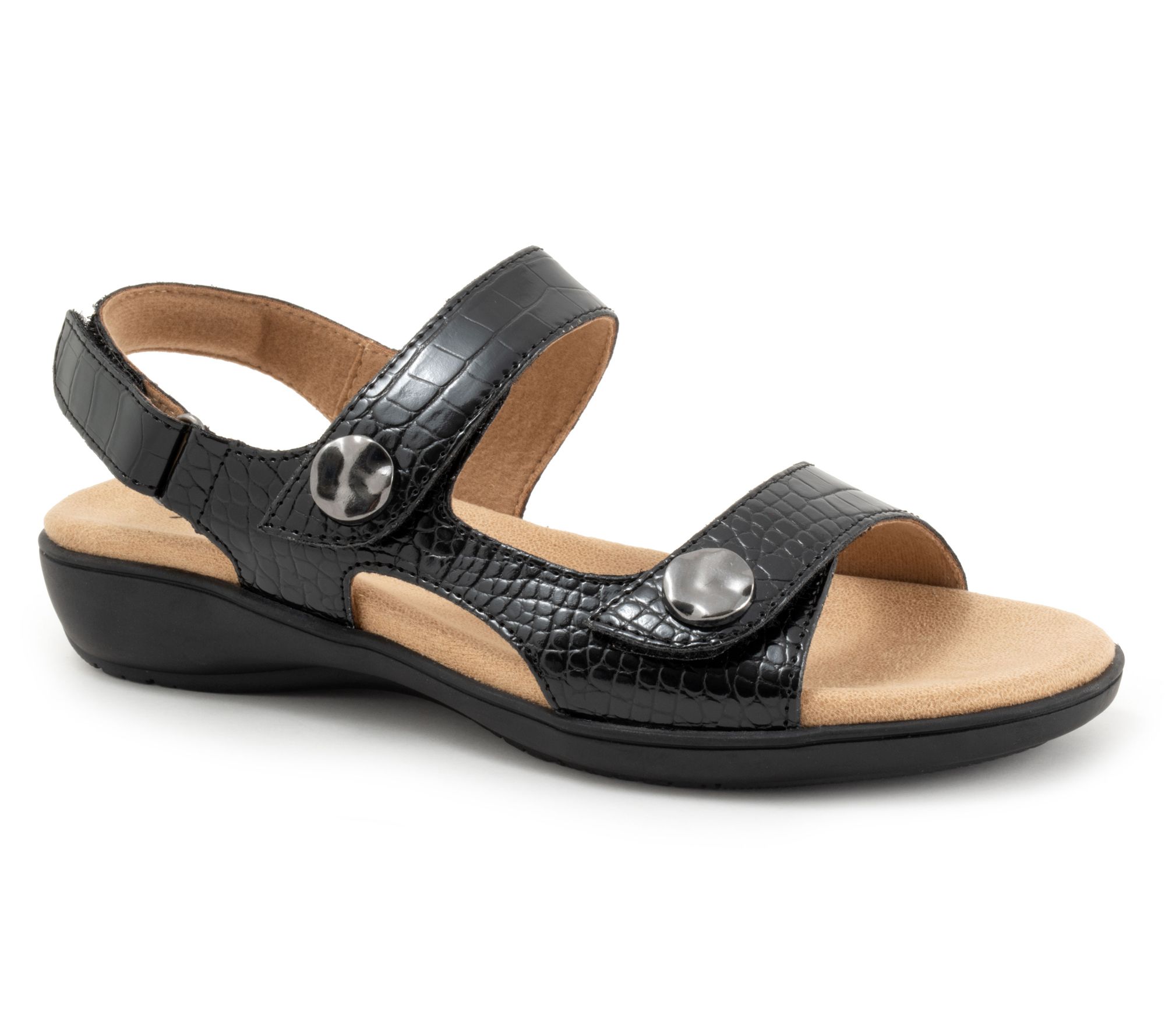• Croco-embossed faux leather upper, adjustable straps, hook-and-loop closure, rounded toe