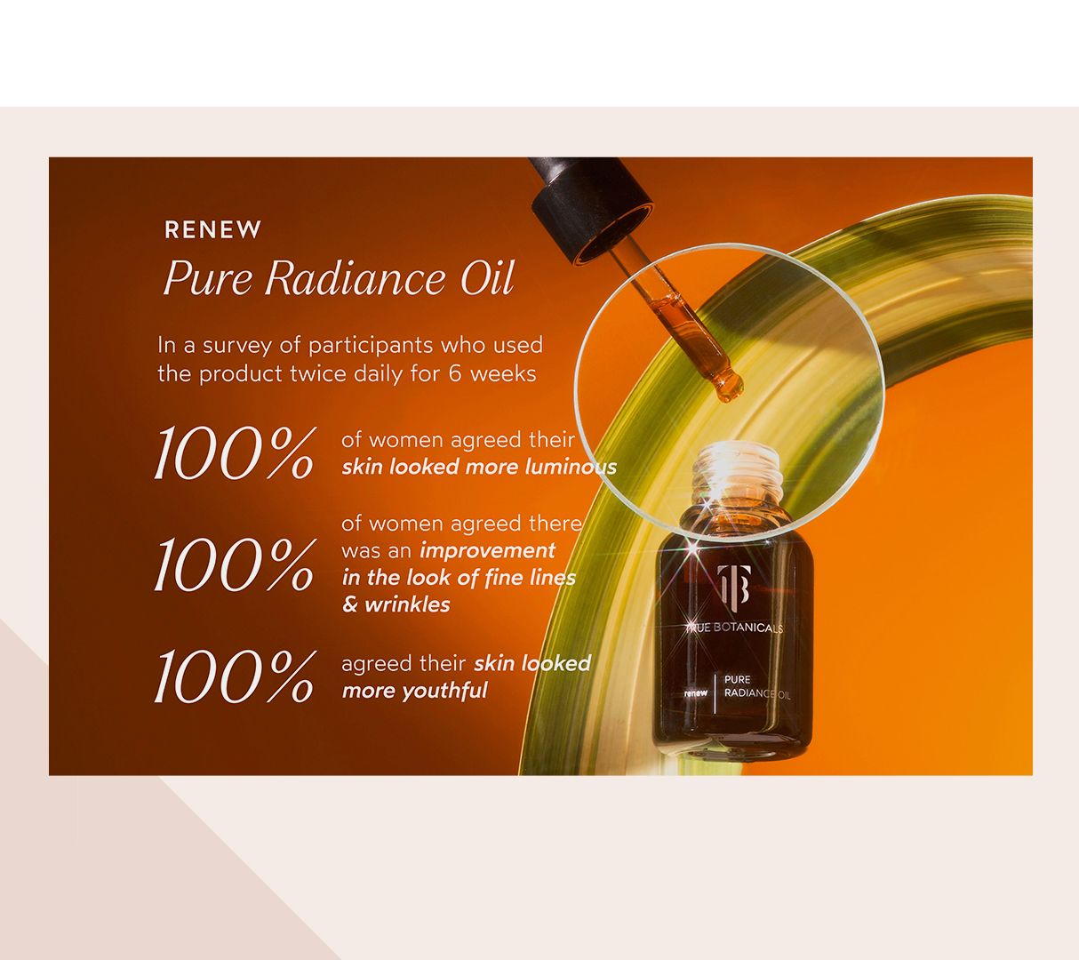 True Botanicals Renew Pure Radiance Oil helps target signs of aging and is shown to reduce the appearance of fine lines and wrinkles and increase hydration levels. A revolutionary blend of omega 3 fatty acids, 14 easily absorbable seed oils, algae extract, and astaxanthin helps to deliver more hydrated, visibly plump, and youthful-looking skin.