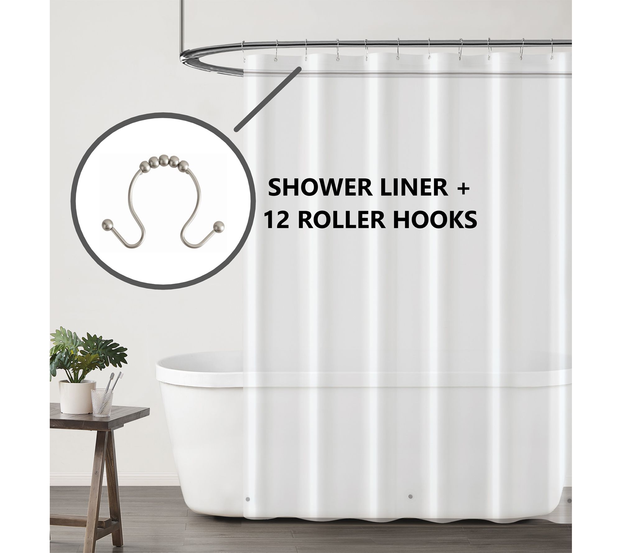 • Includes one shower liner (70W x 72L) and twelve shower curtain hooks