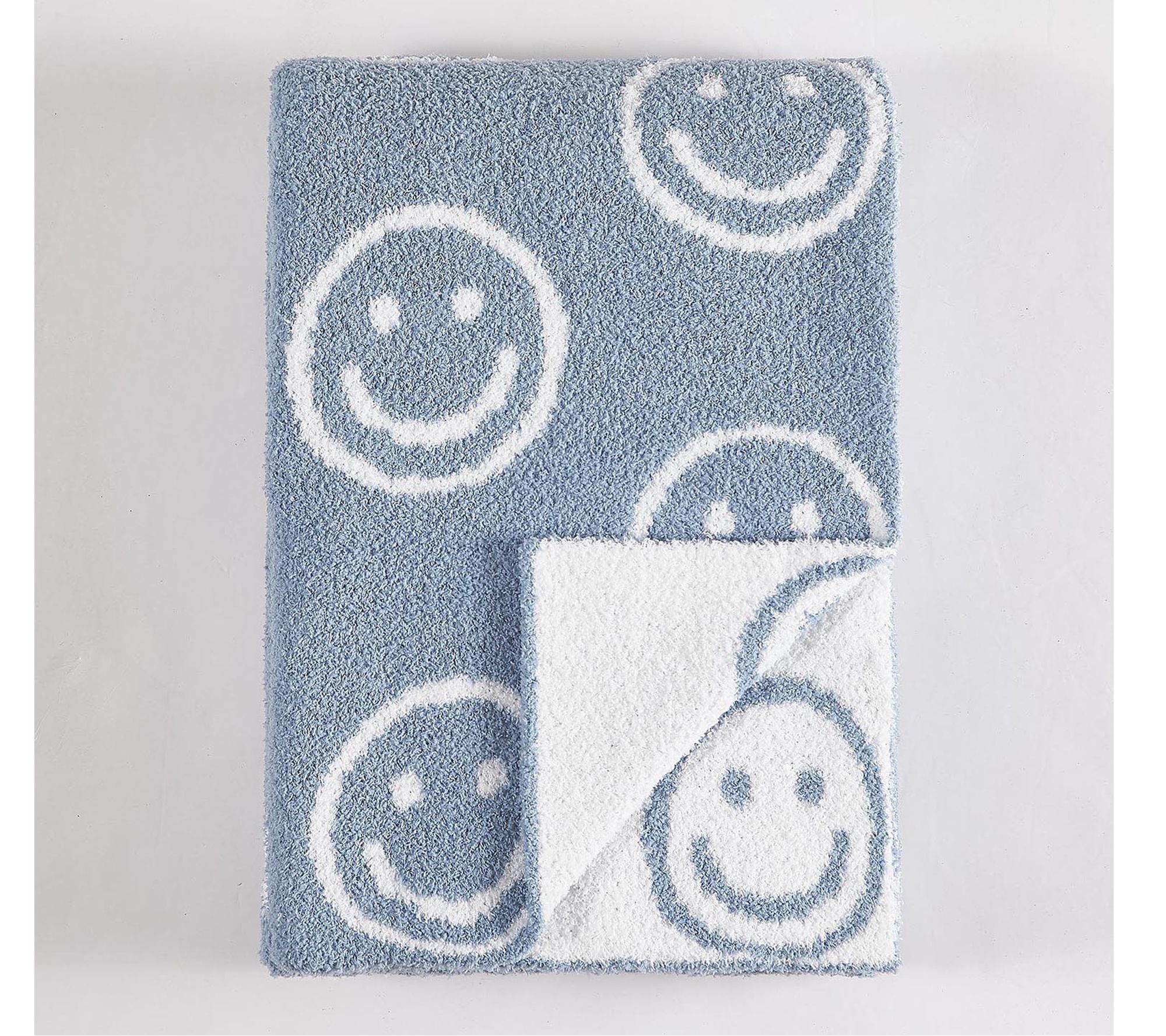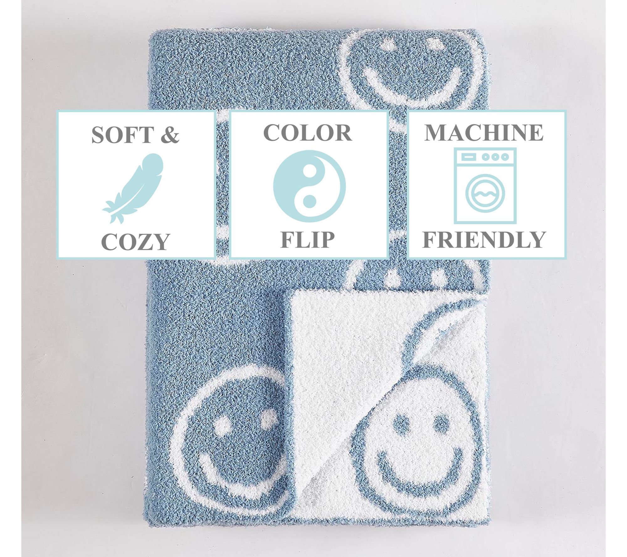 Cheerful style meets cozy comfort with this reversible throw, featuring playful smiley faces that instantly brighten your room. The oversized, feather yarn knit is ideal for curling up on the sofa during movie night or layering across your bed for a fun accent and extra warmth. This versatile blanket brings joy and softness to every relaxing moment. From Truly Soft.
