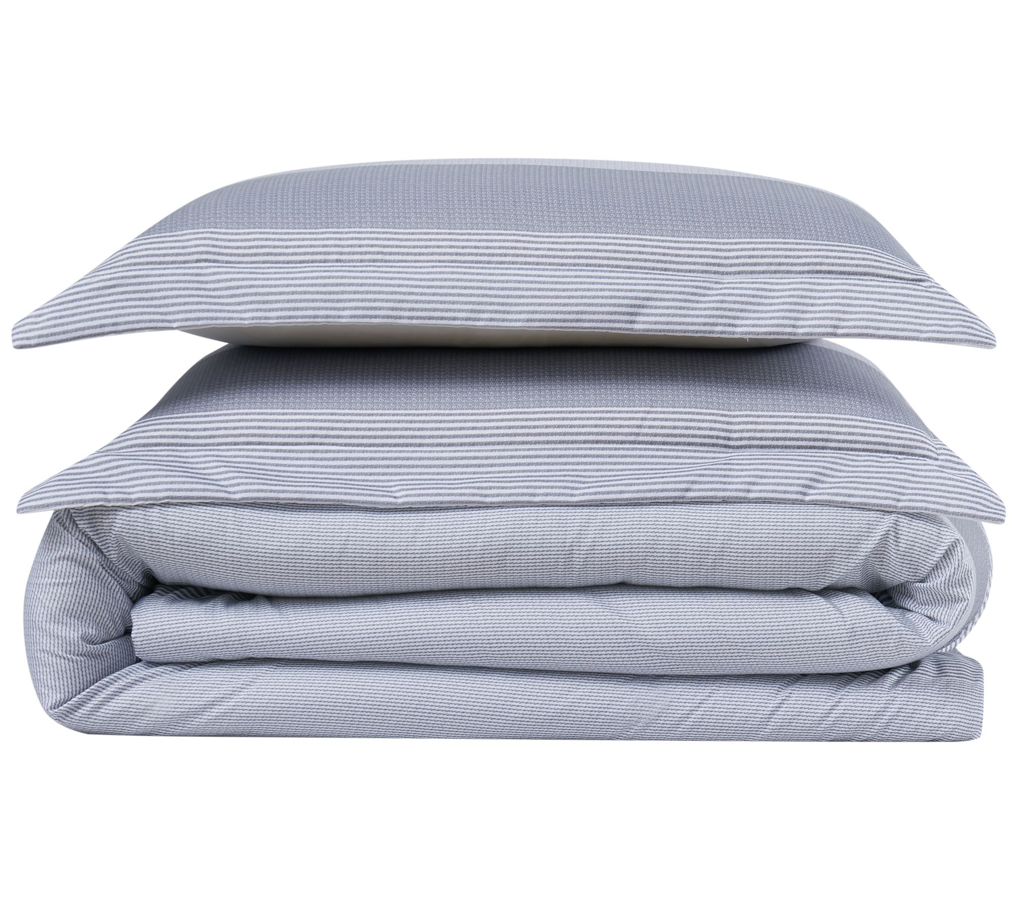 Bring a modern touch to your bedroom decor with the varying shades and stripes of grays on this luxurious comforter set specially treated for extra softness. From Truly Soft.