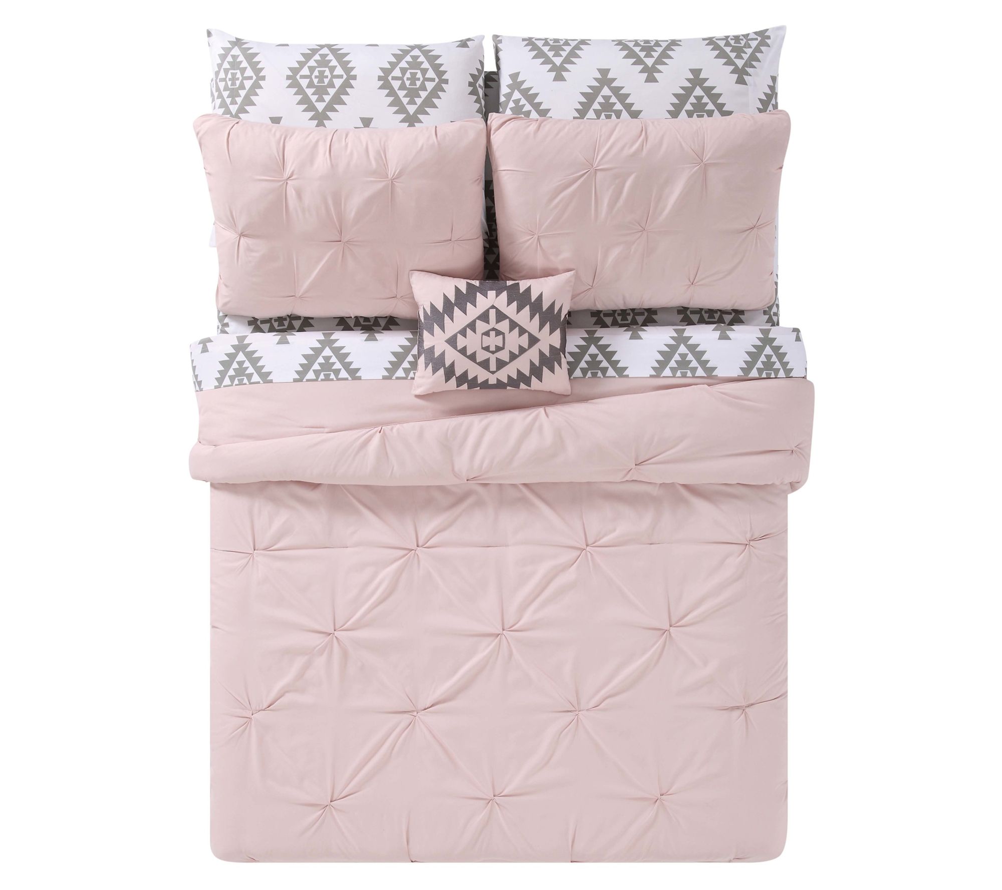 Decorating your bedroom is as easy as opening up this bed in a bag with a pleated comforter and sham, sheets, and a decorative pillow with a southwestern pattern. From Truly Soft.