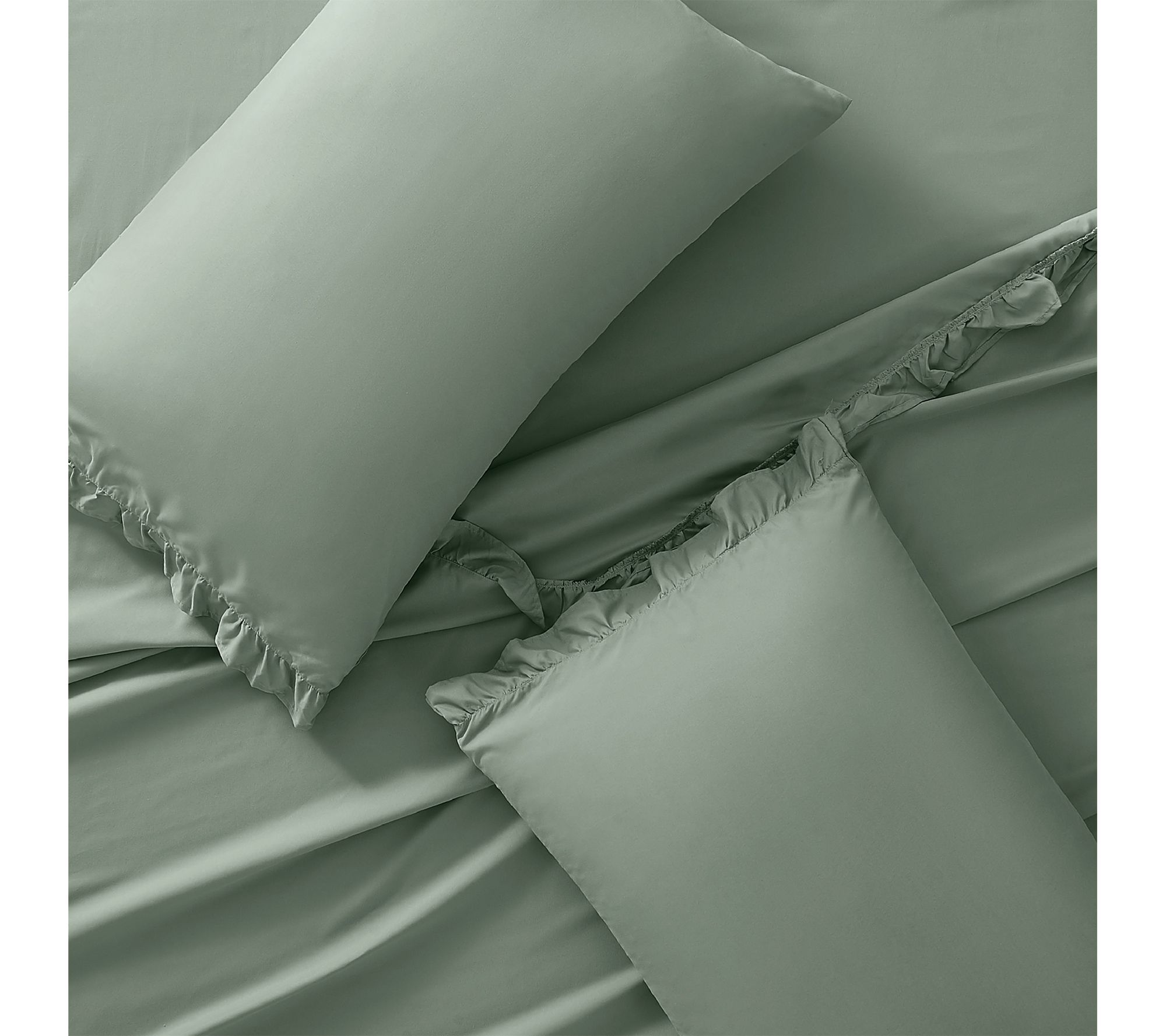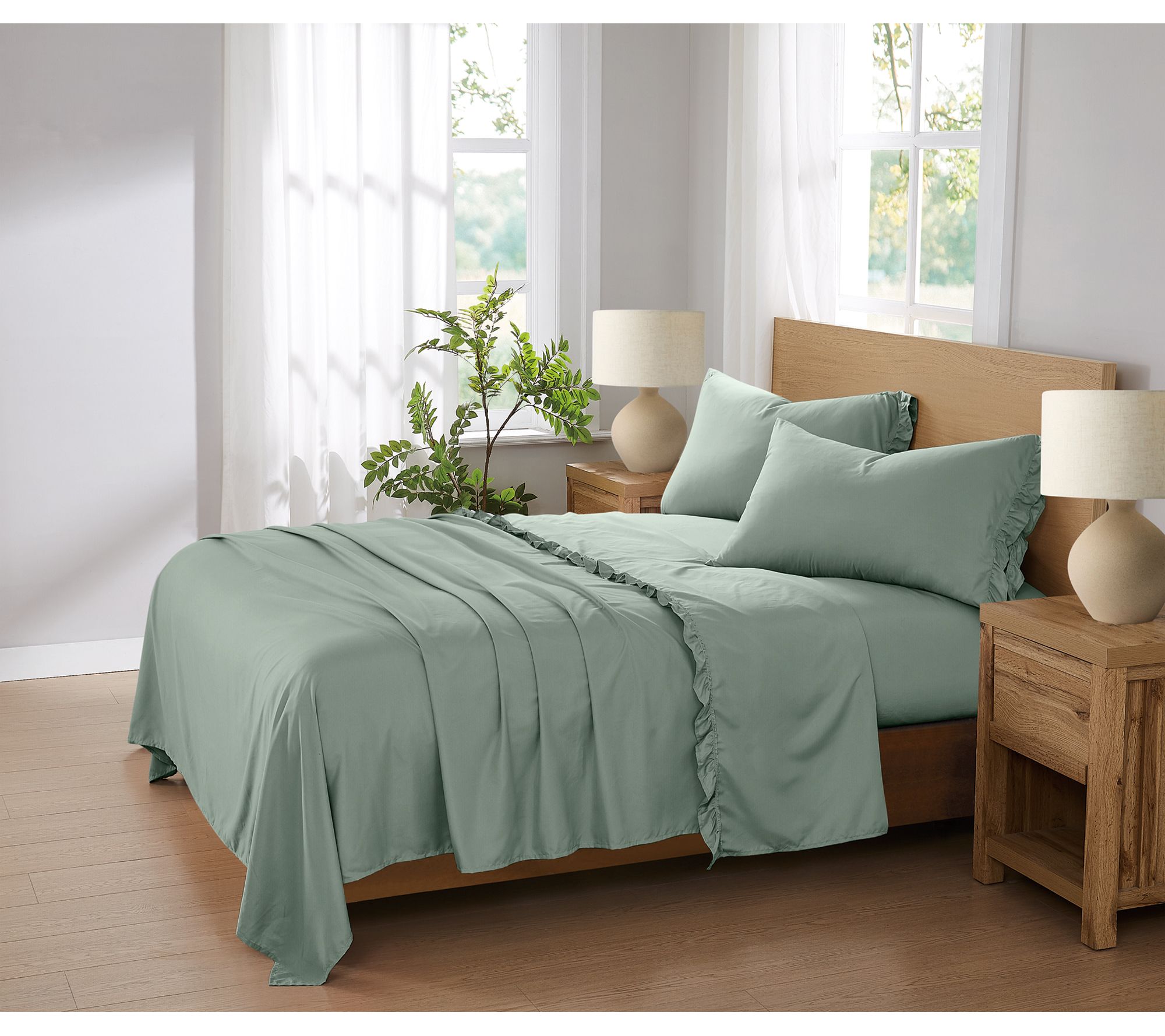 Create a sanctuary of softness in your bedroom with this sheet set, beautifully designed with delicate ruffle accents to bring a touch of elegance and feminine charm to your nightly routine. Sink into ultra-soft comfort every evening, enjoying both the practical durability and timeless style of these solid sheets. From Truly Soft.