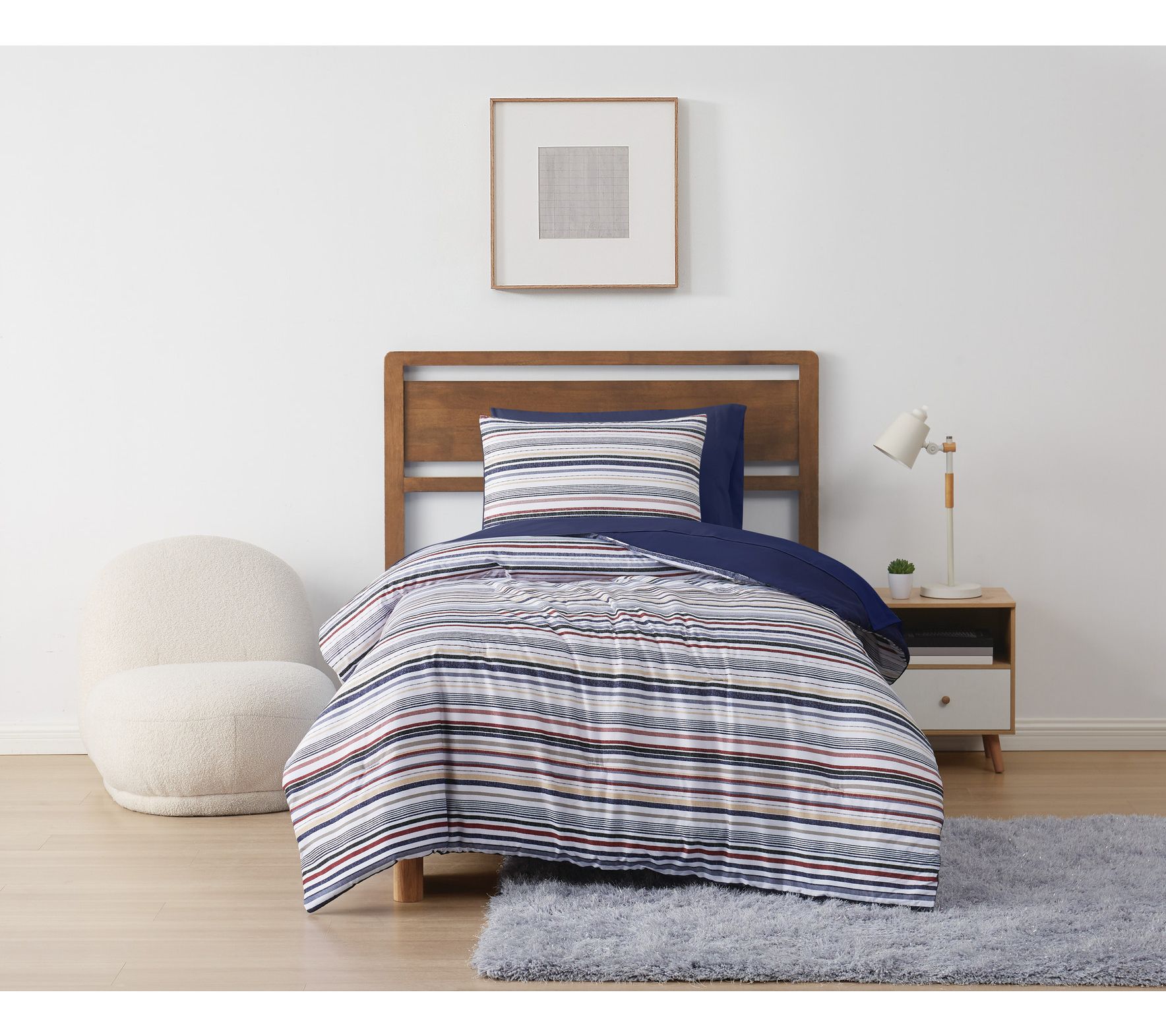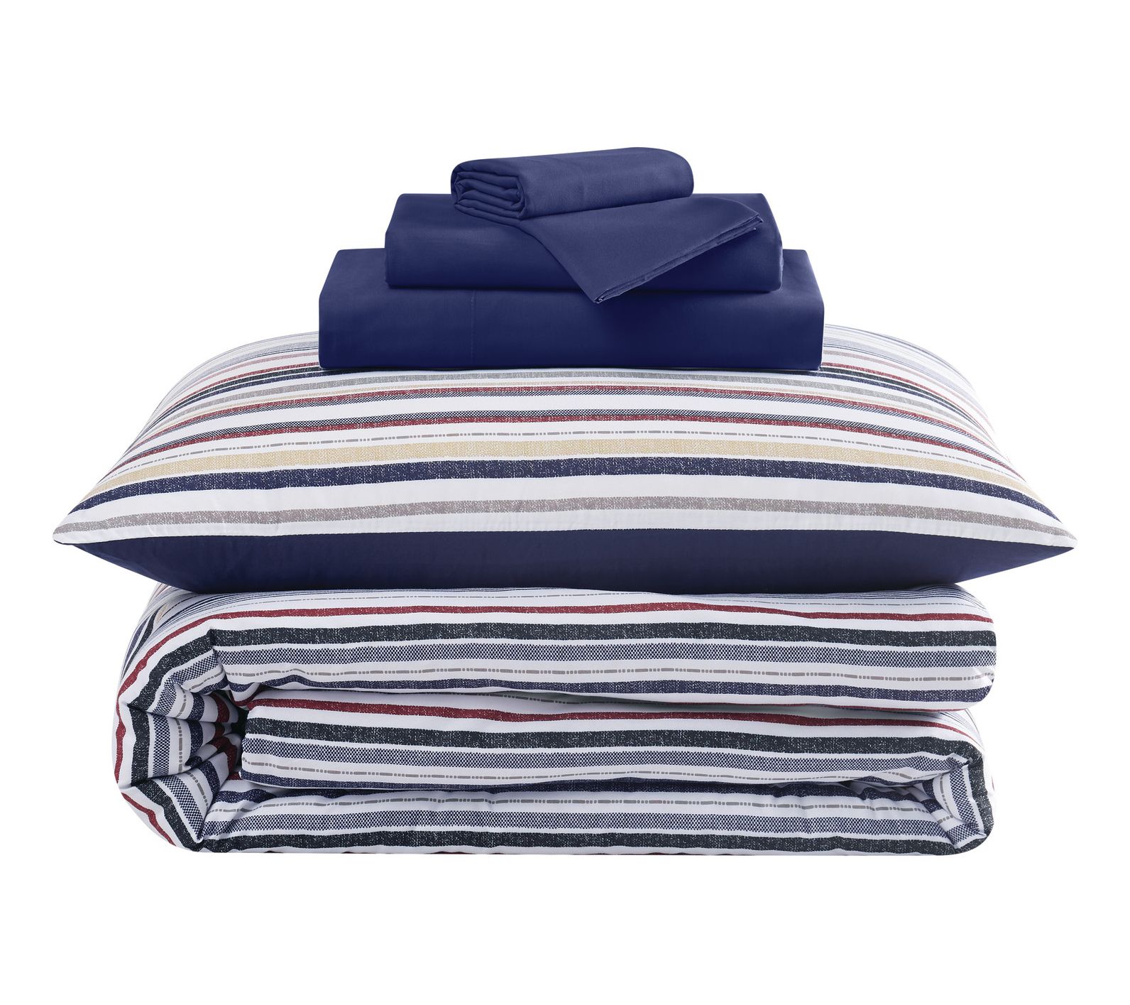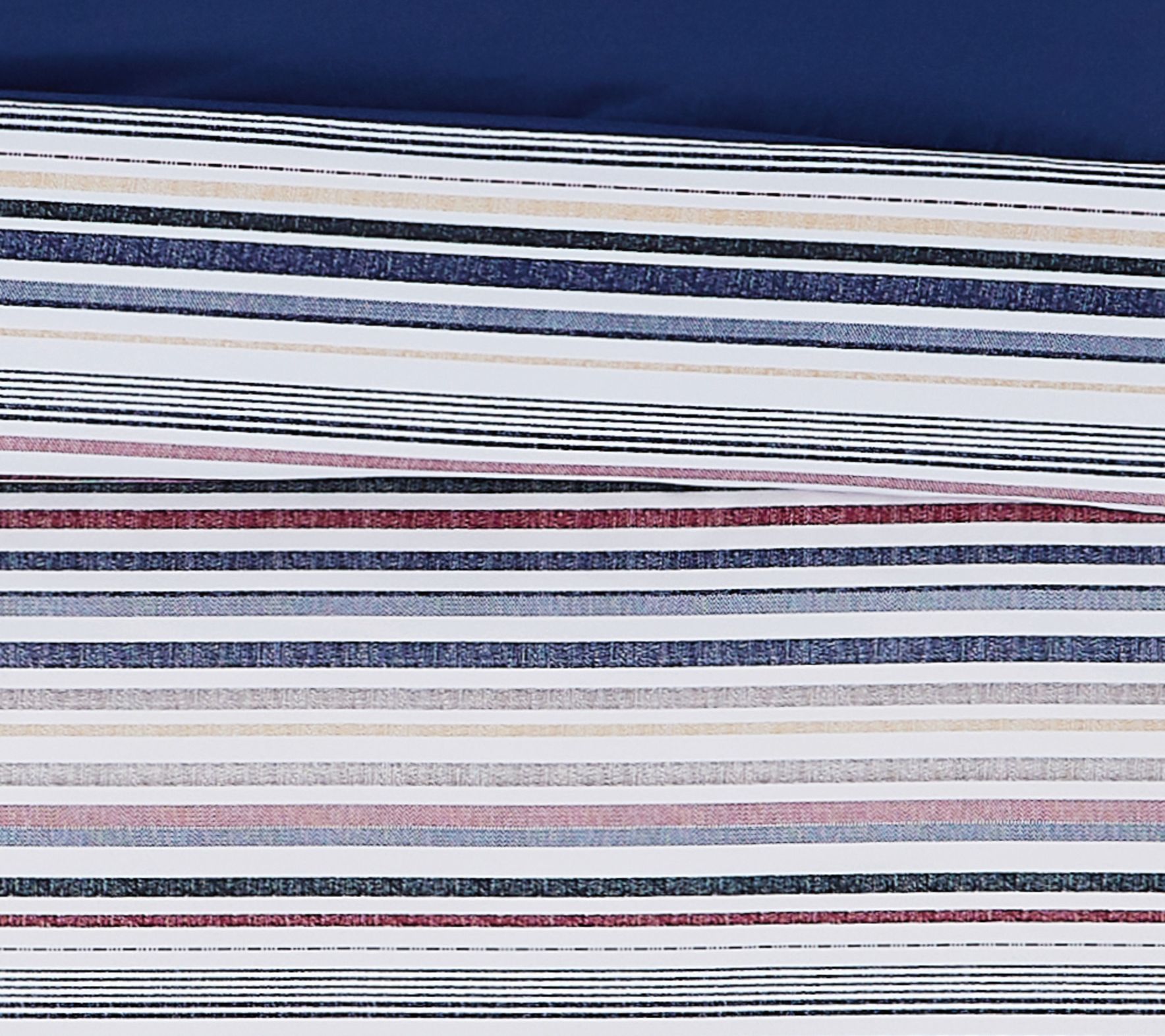 Refresh your bedroom with the harmonious blend of warm and cool tones found in this bag set. This bedding ensemble features a striking stripe pattern with blues, reds, and greys on a crisp white background, complemented by a solid navy reverse. From Truly Soft.