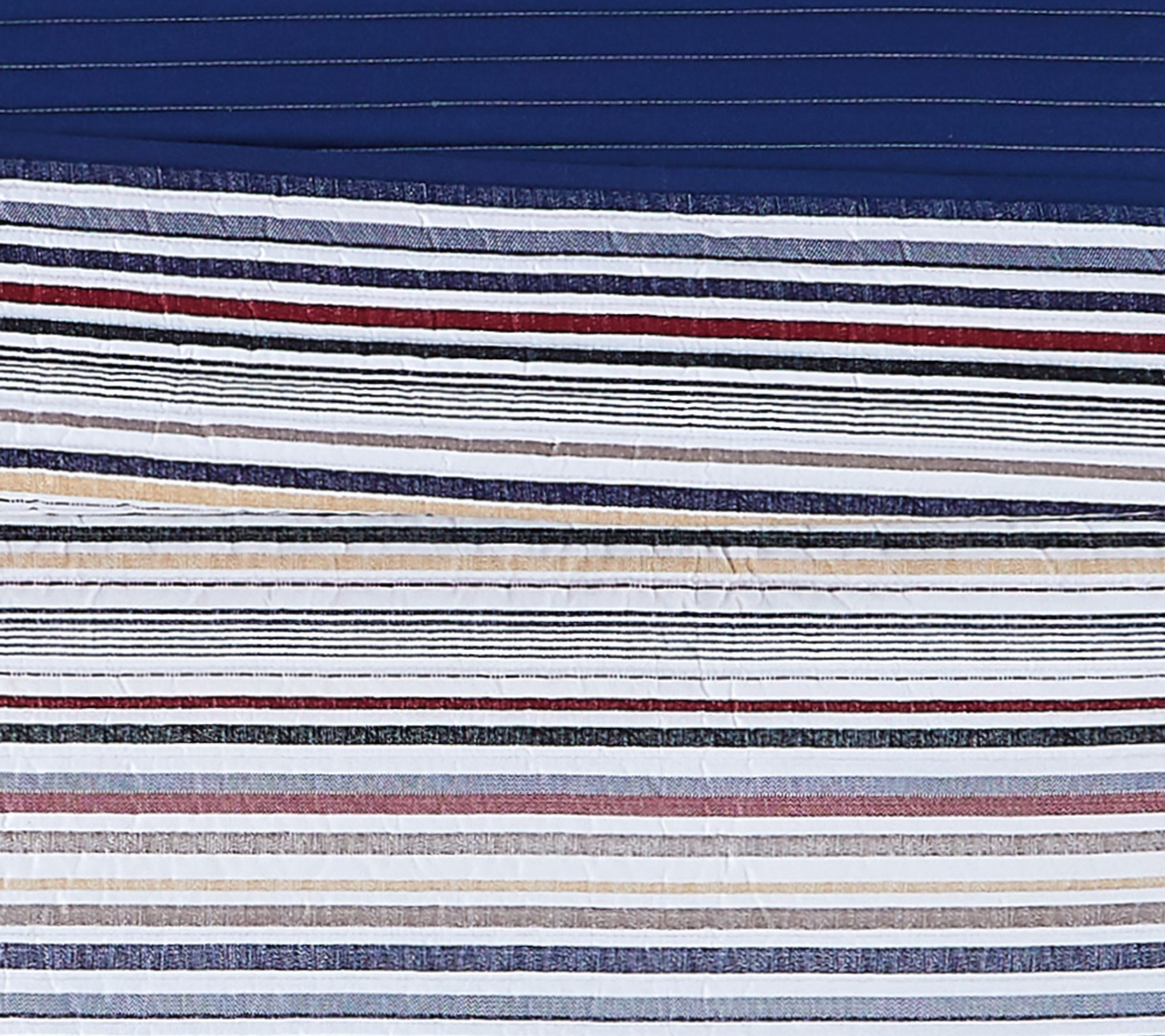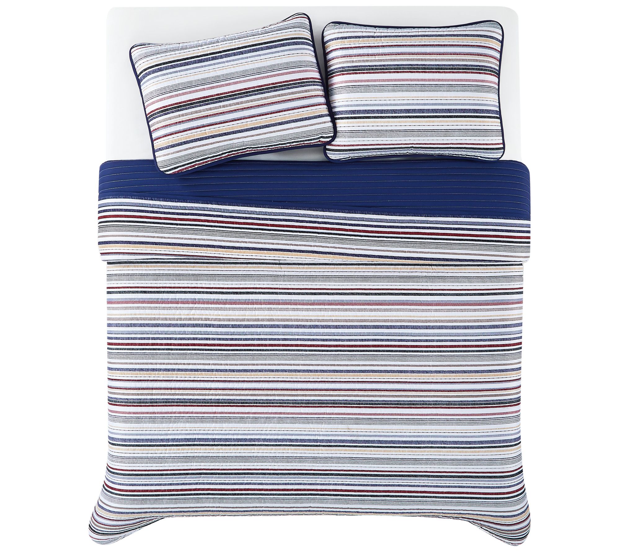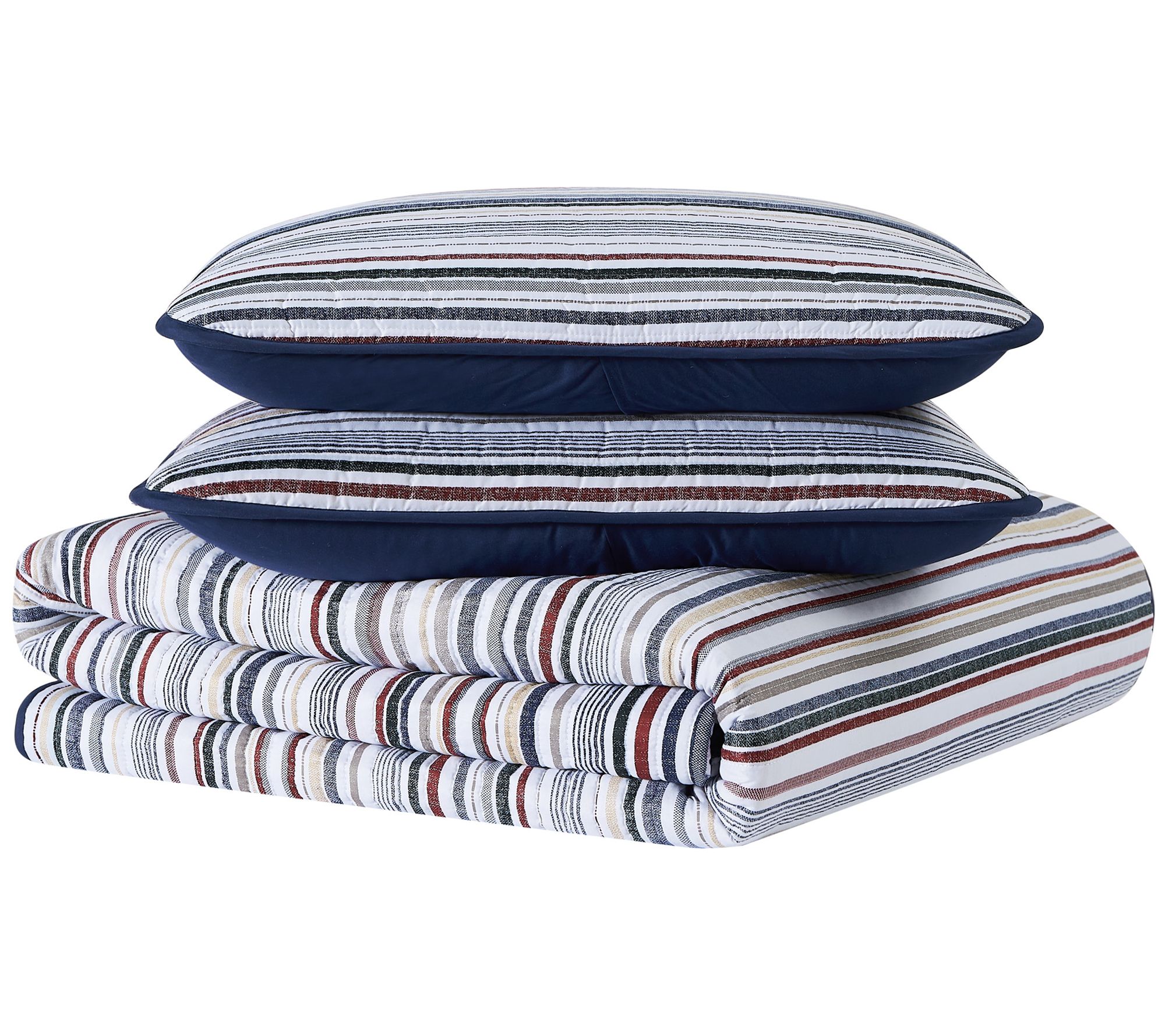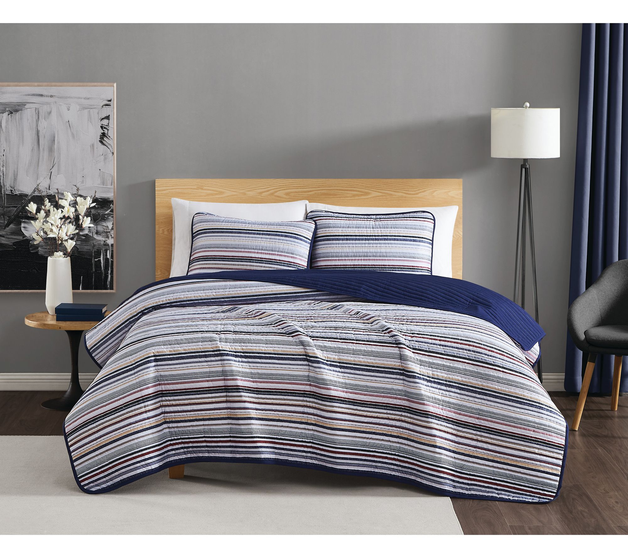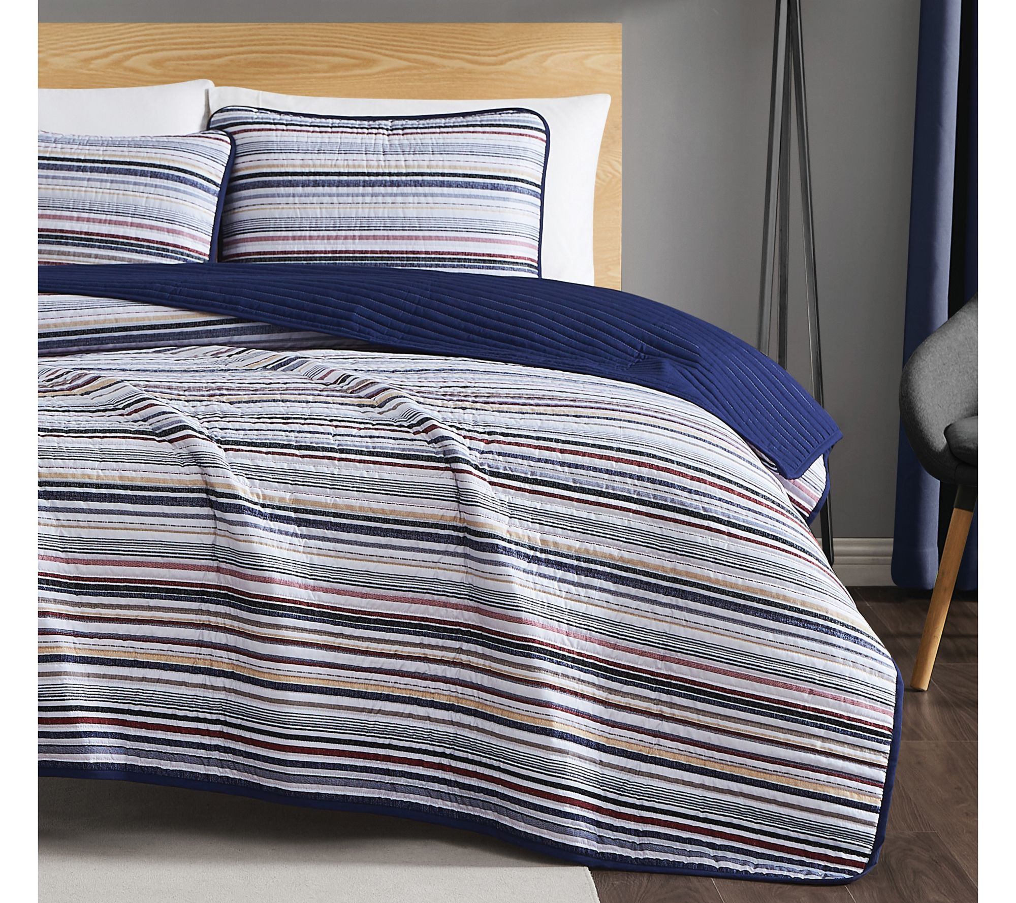 Give your bedroom a refreshing makeover with the Teagan Stripe quilt set. Showcasing crisp stripes of white, blue, gray, and red, it gives your space a touch of timeless style. From Truly Soft.