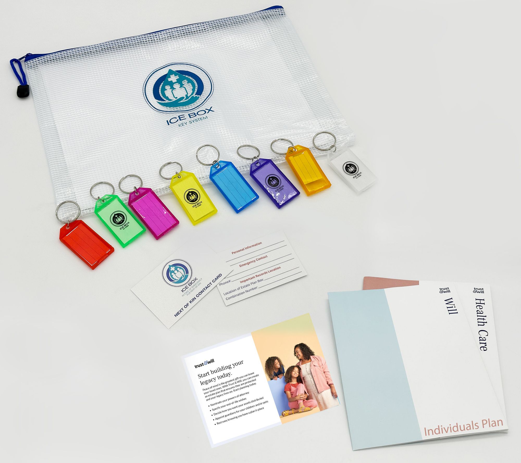 Includes 1-year voucher for will-based estate plan for married or civil union couple with Last Will & Testament, HIPAA Authorization, Living Will (Medical Directive), and Power of Attorney; ICEBox LITE with zip storage envelope, 12 folders, eight key tag labels with chains, erasable pen, next of kin contact information card, and instructions
