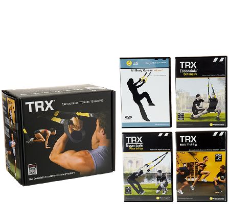 Use this DVD four-pack to help tone your six-pack. TRX develops strength, balance, flexibility, and core stability simultaneously with the use of a suspension trainer, a highly portable training tool that leverages your body weight and gravity for a total body workout. This at-home kit includes everything you need to get started--suspension trainer, door anchor, and four workout DVDs. From TRX.