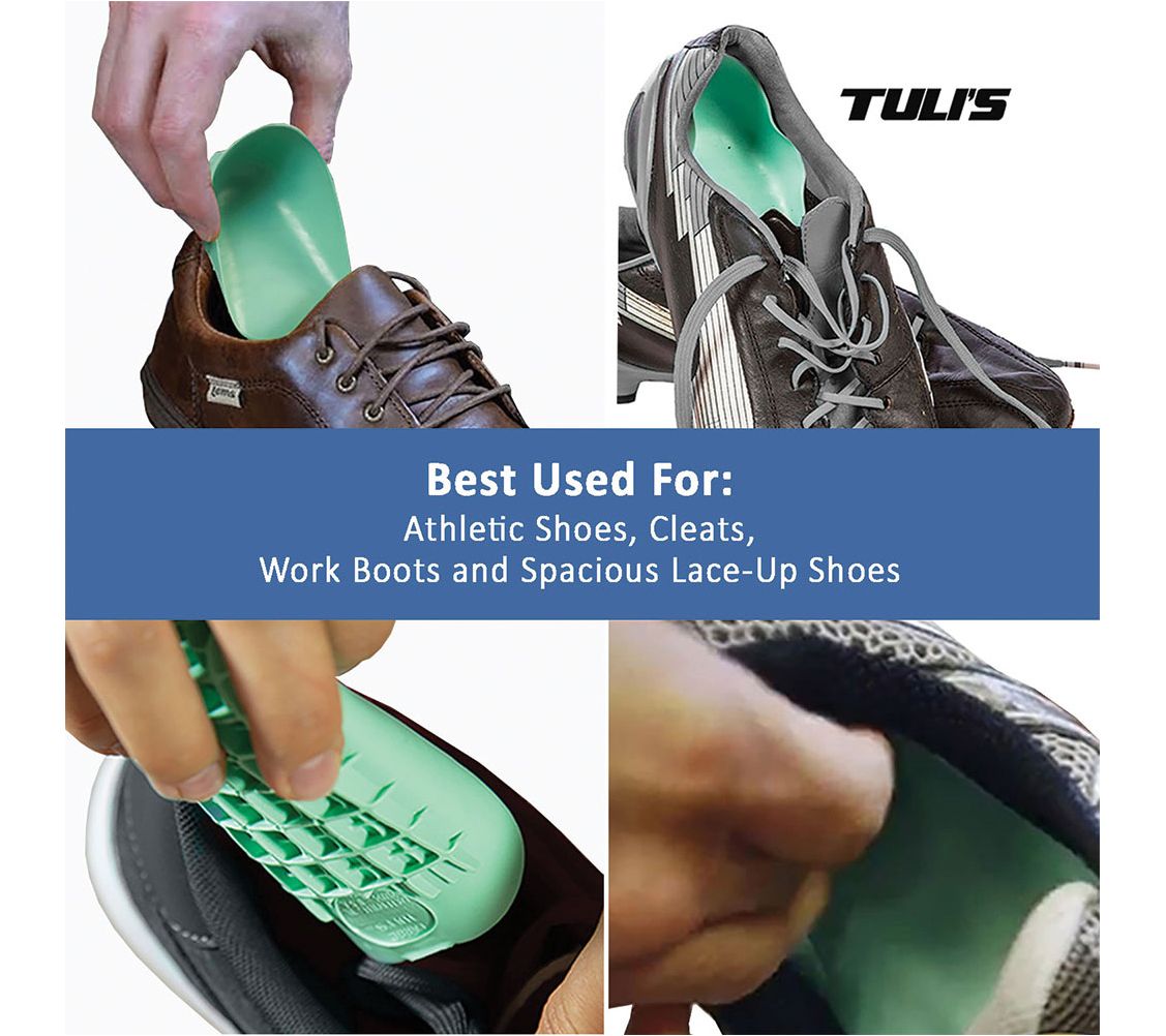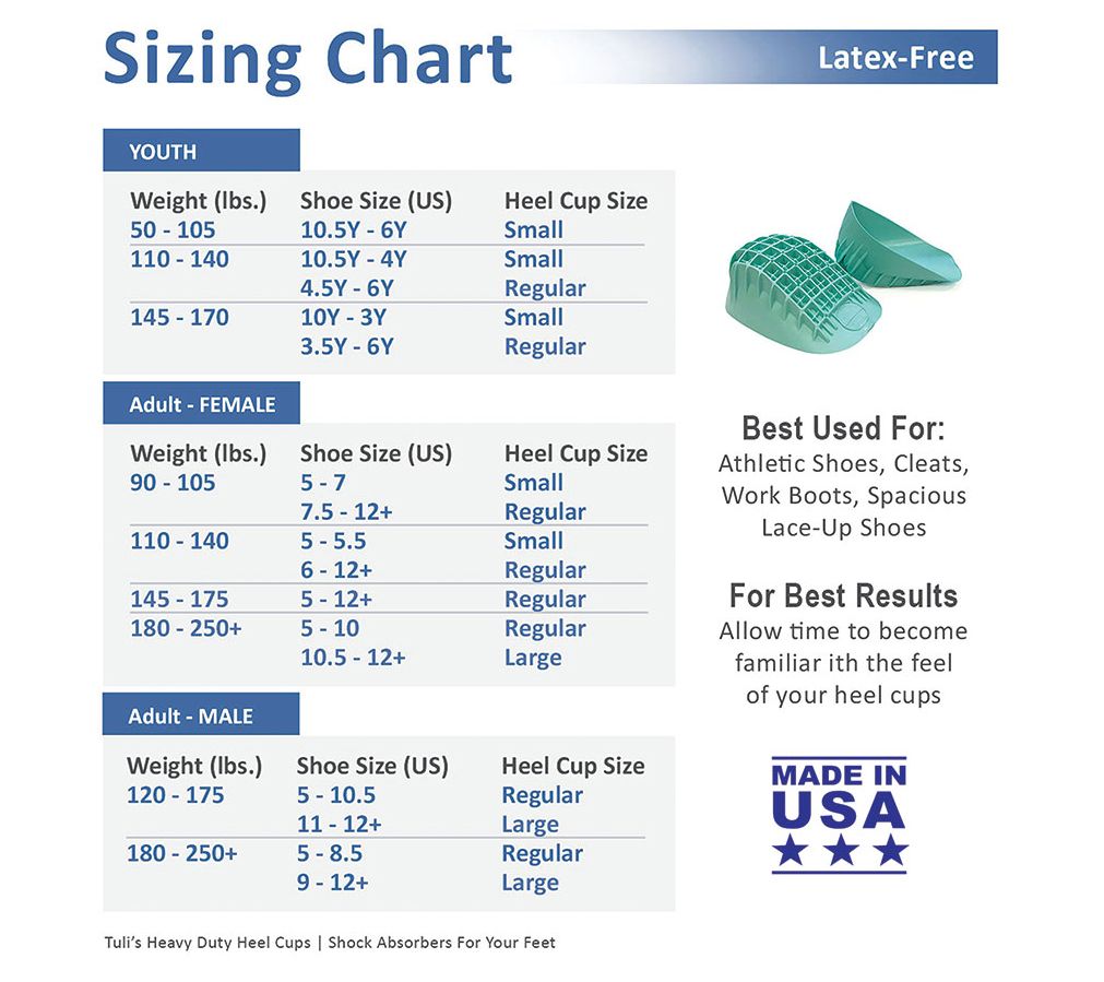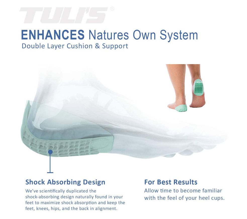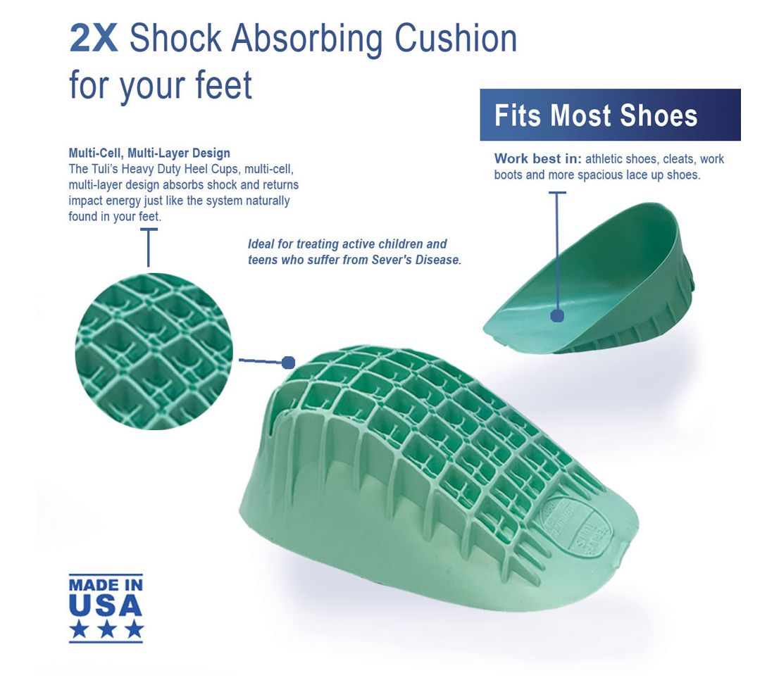 Tuli's Heavy Duty Heel Cups are twice as thick as Tuli's Classic Heel Cups and offer maximum performance and protection when you need it the most. They work best in athletic shoes, cleats. work boots and more spacious lace up shoes. Includes 2 pair. From Medi-Dyne.