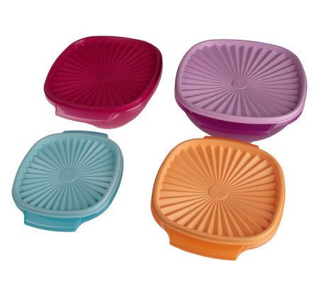 Kitchen essentials. This diverse set of four square, tapered serving bowls with tight-sealing, easy-to-close lids is sure to utilized over and over again. Tapered handles provide a secure, comfortable grip, while the clear, translucent material makes it easy to see inside. From Tupperware.