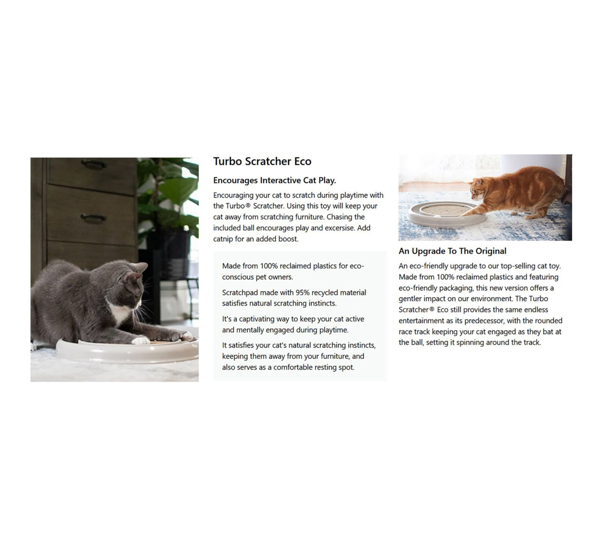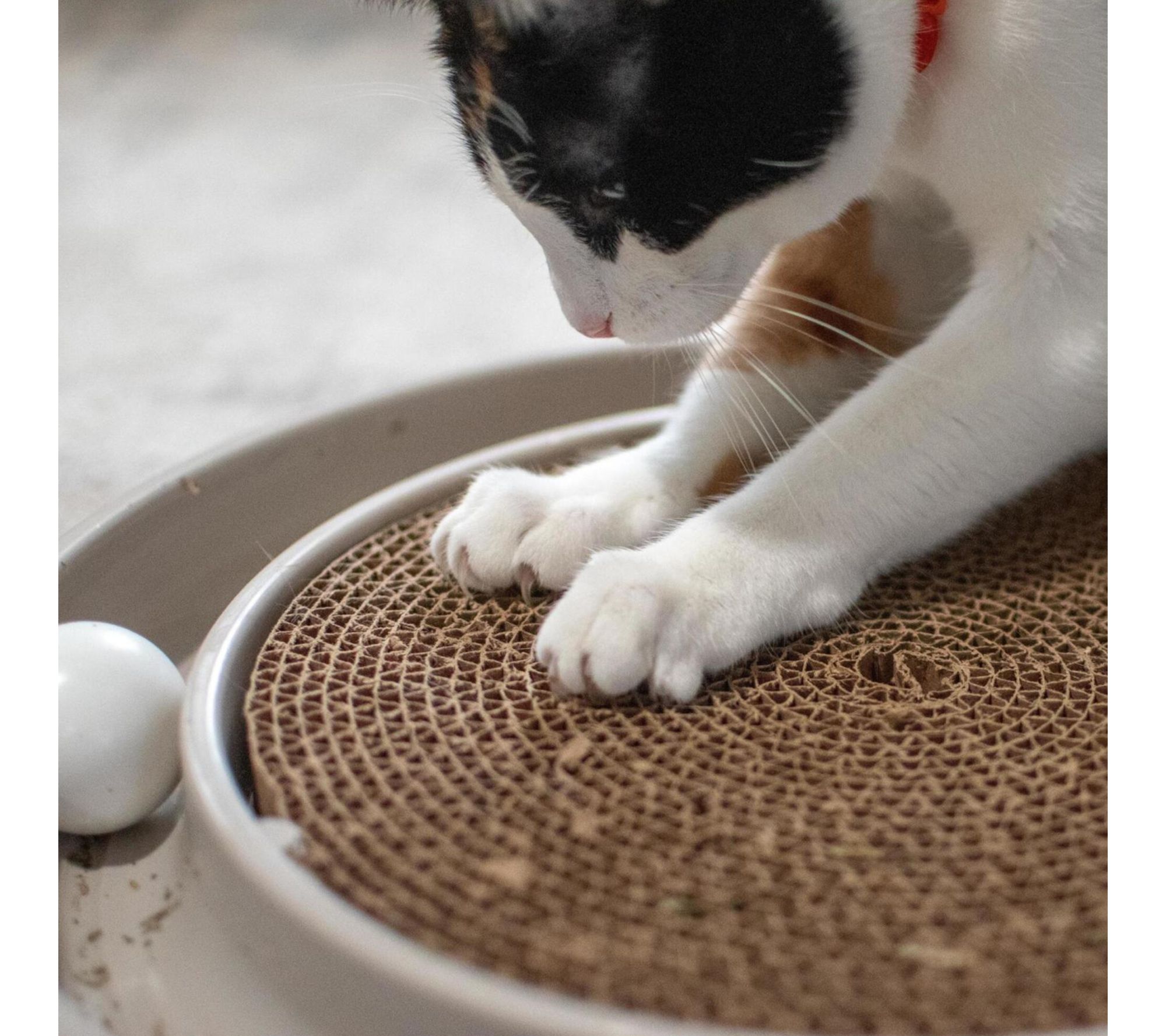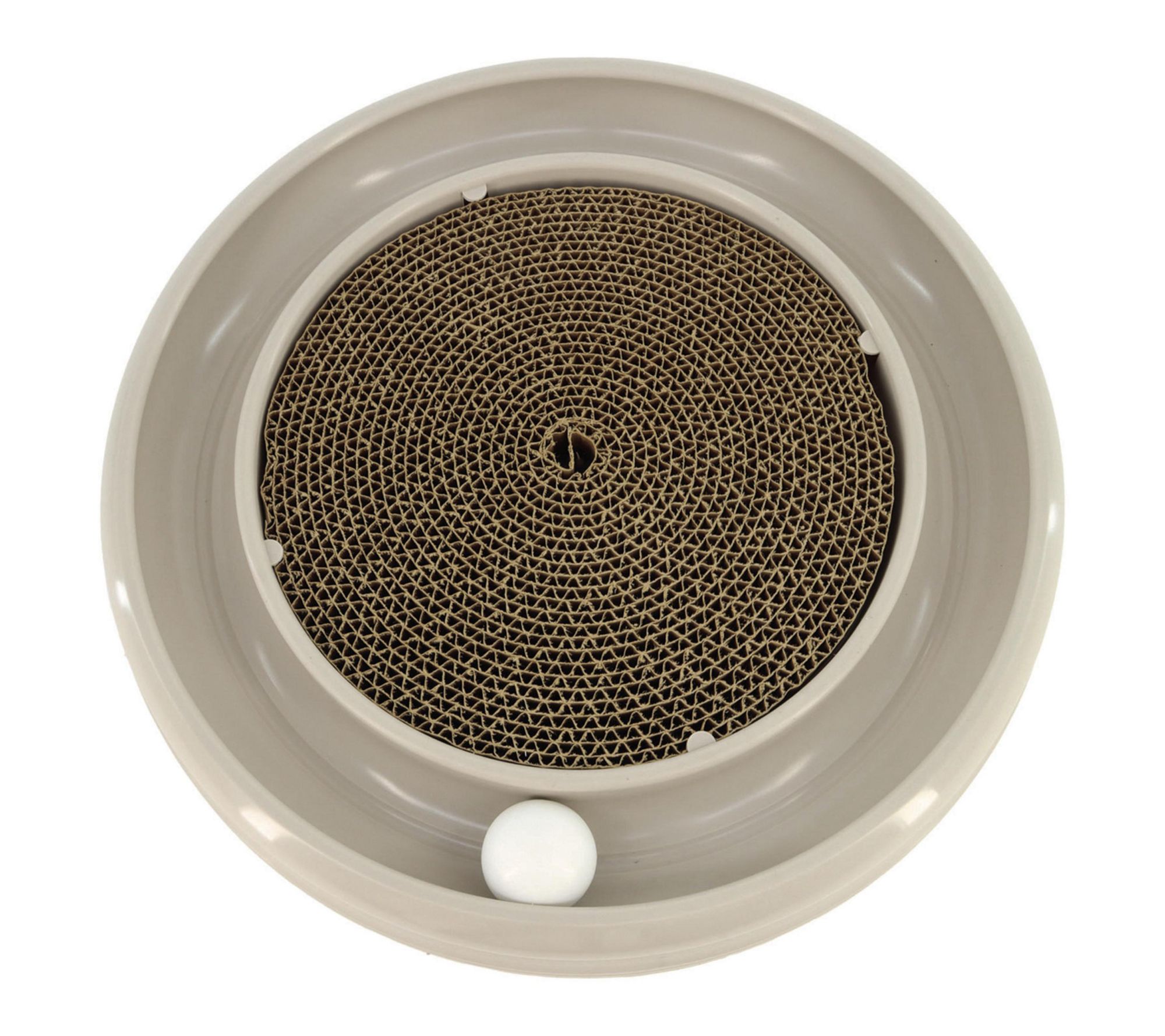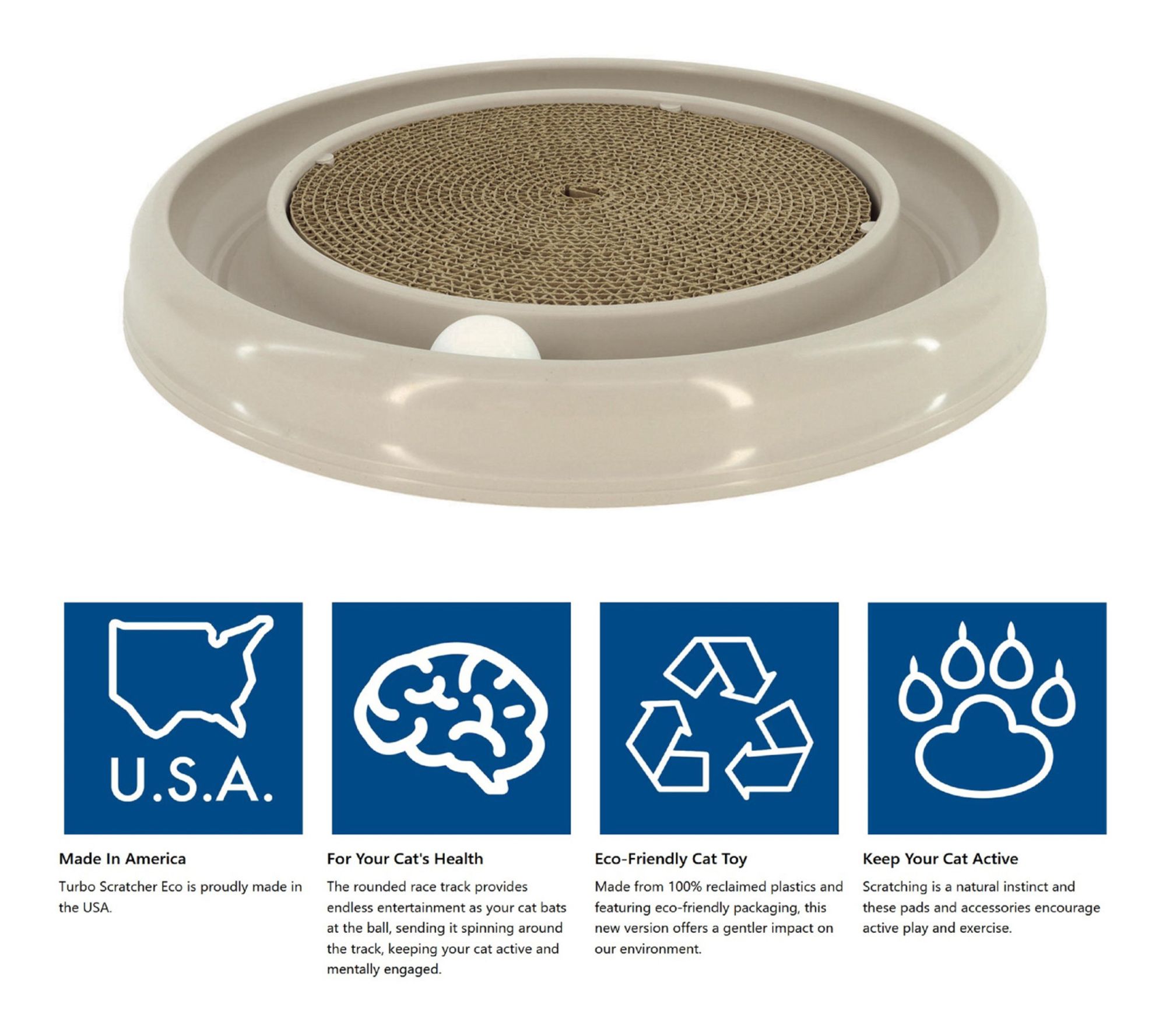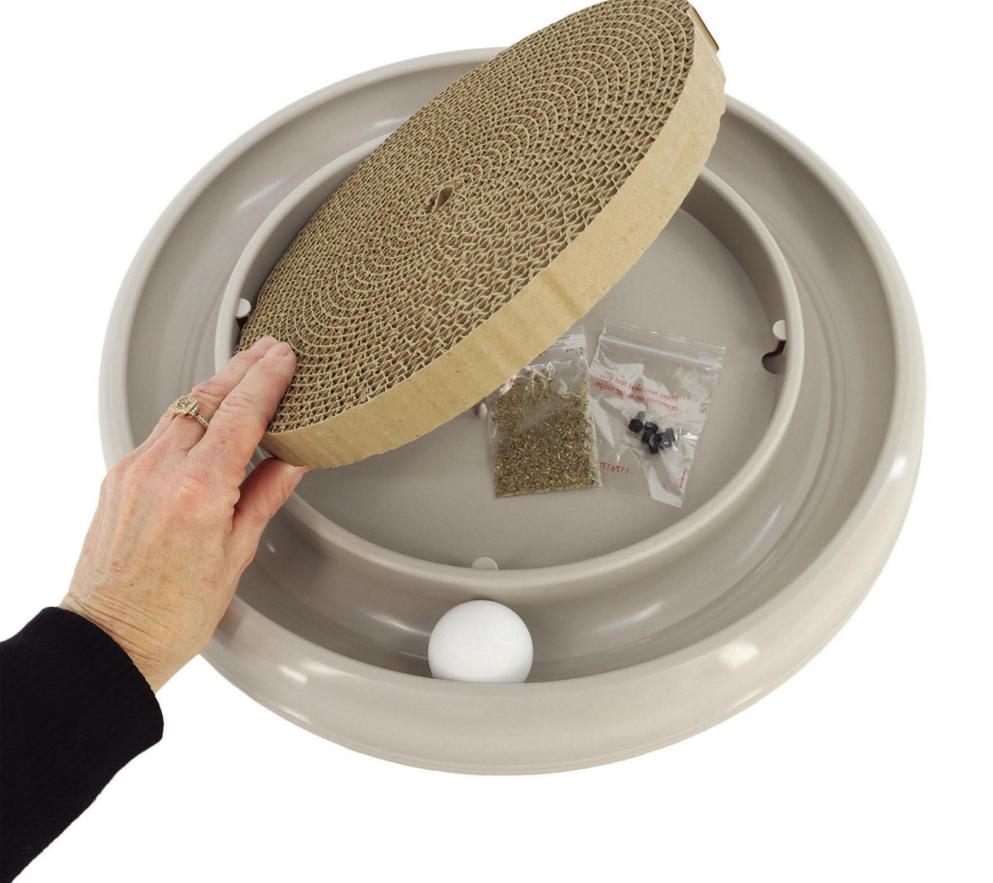Amp up your cat's playtime with an engaging racetrack toy designed to spark excitement and encourage exercise. As they bat the ball around the circular track, the built-in scratchpad offers a satisfying spot to stretch, scratch, and lounge. Sprinkle on the included catnip for extra fun and watch your feline stay active, happy, and off your furniture. From Turbo.