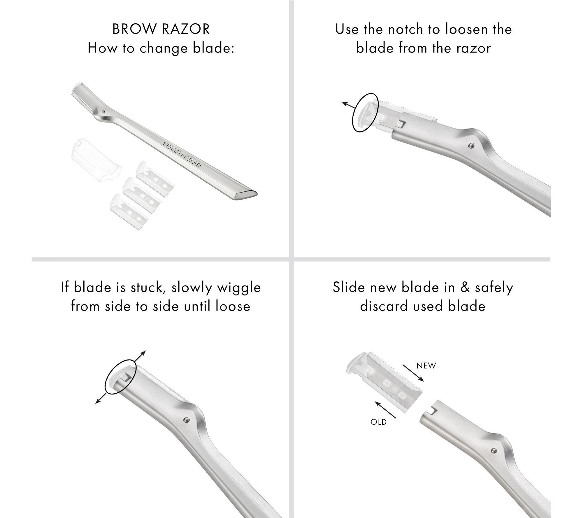 How do I use it: Start by prepping the area with warm water to relax the skin and hair follicle for easier hair removal. Outline your desired brow shape and use the mini slant tweezer to remove stray hairs. Pull in the direction of hair growth to remove directly from the root. Follow up with the brow razor to remove any baby fine hairs. Hold the brow razor at an angle and with light pressure, apply short, feathery strokes downward. To avoid irritation, move in the direction of hair growth. Do not use razor more than three times per area or more than once per week. To replace razor blades, pinch the plastic edge and pull out from tool. If blade is stuck, slowly wiggle from side to side until loose. Slide new blade in and safely discard of used blade. Handle with care, blade is sharp.