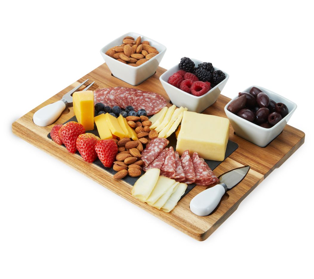 Serve up a stunning spread with the Twine acacia and slate cheese board set. This elegant set includes everything you need to present an array of cheeses, nuts, and charcuterie in style. From Twine.