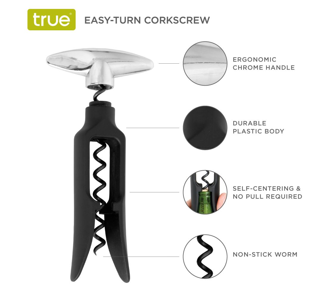 Open your favorite bottle of wine with ease using the True Twister Easy-Turn Corkscrew, featuring a self-centering non-stick worm that ensures the cork slides up and out smoothly without any pulling required. The sleek chrome handle adds a touch of elegance to your wine-opening experience, making it a must-have accessory for any wine enthusiast. From True.