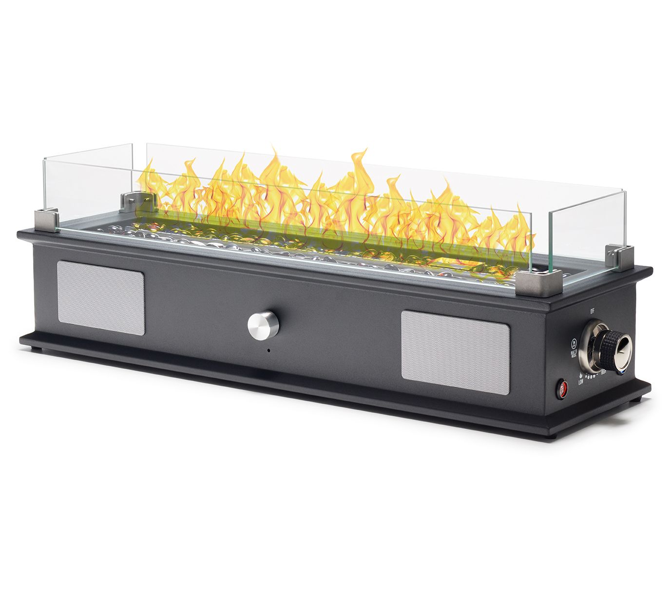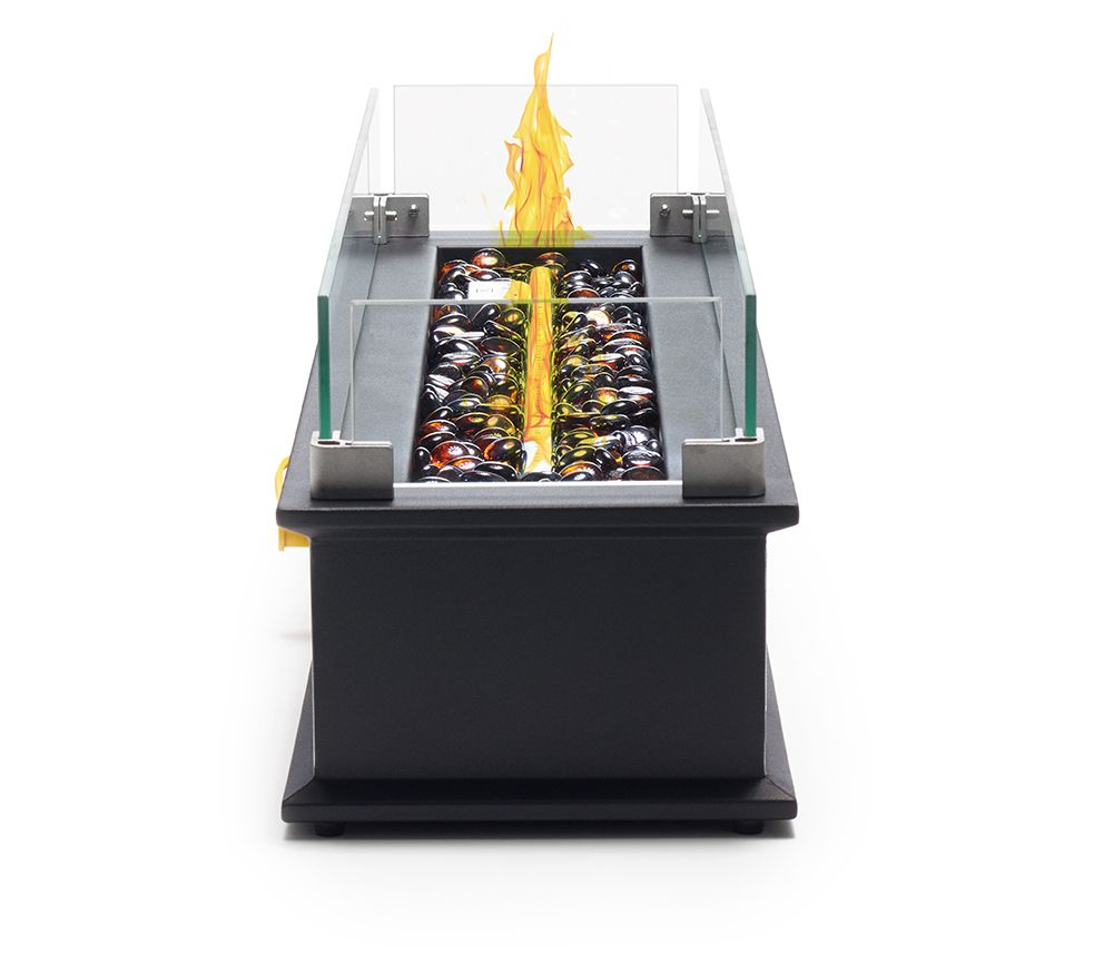 • Includes fire pit, glass media, protective wind-glass, LP regulator hose, protective cover