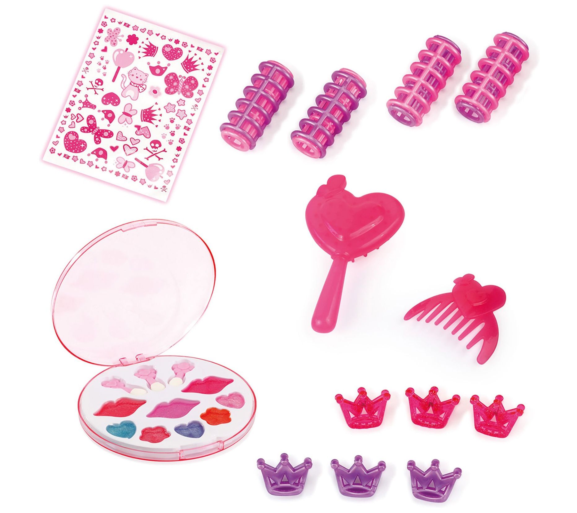 • Includes one styling head, one brush, one comb, four hair curlers, six hair clips, one sticker, and one make-up palette